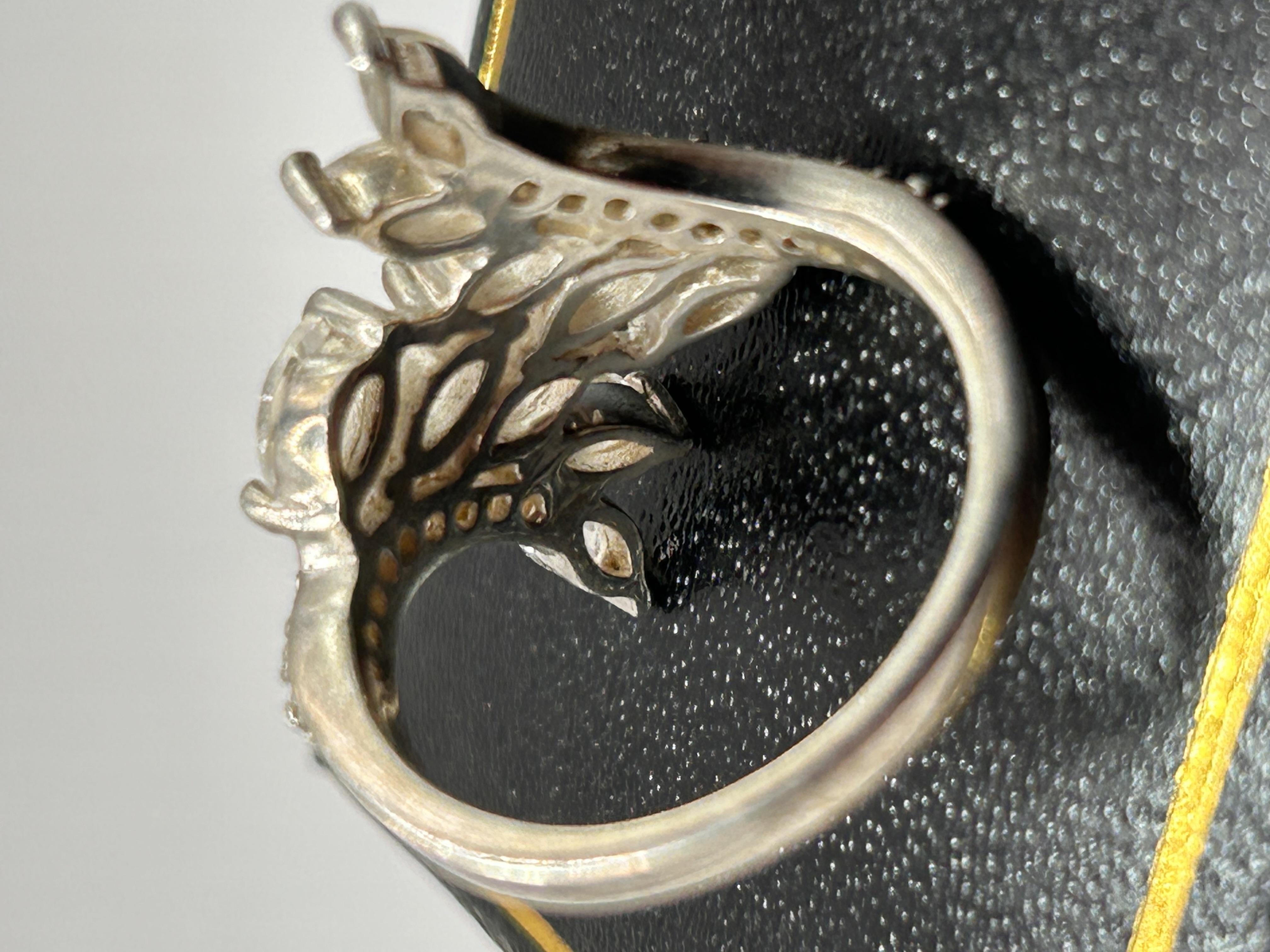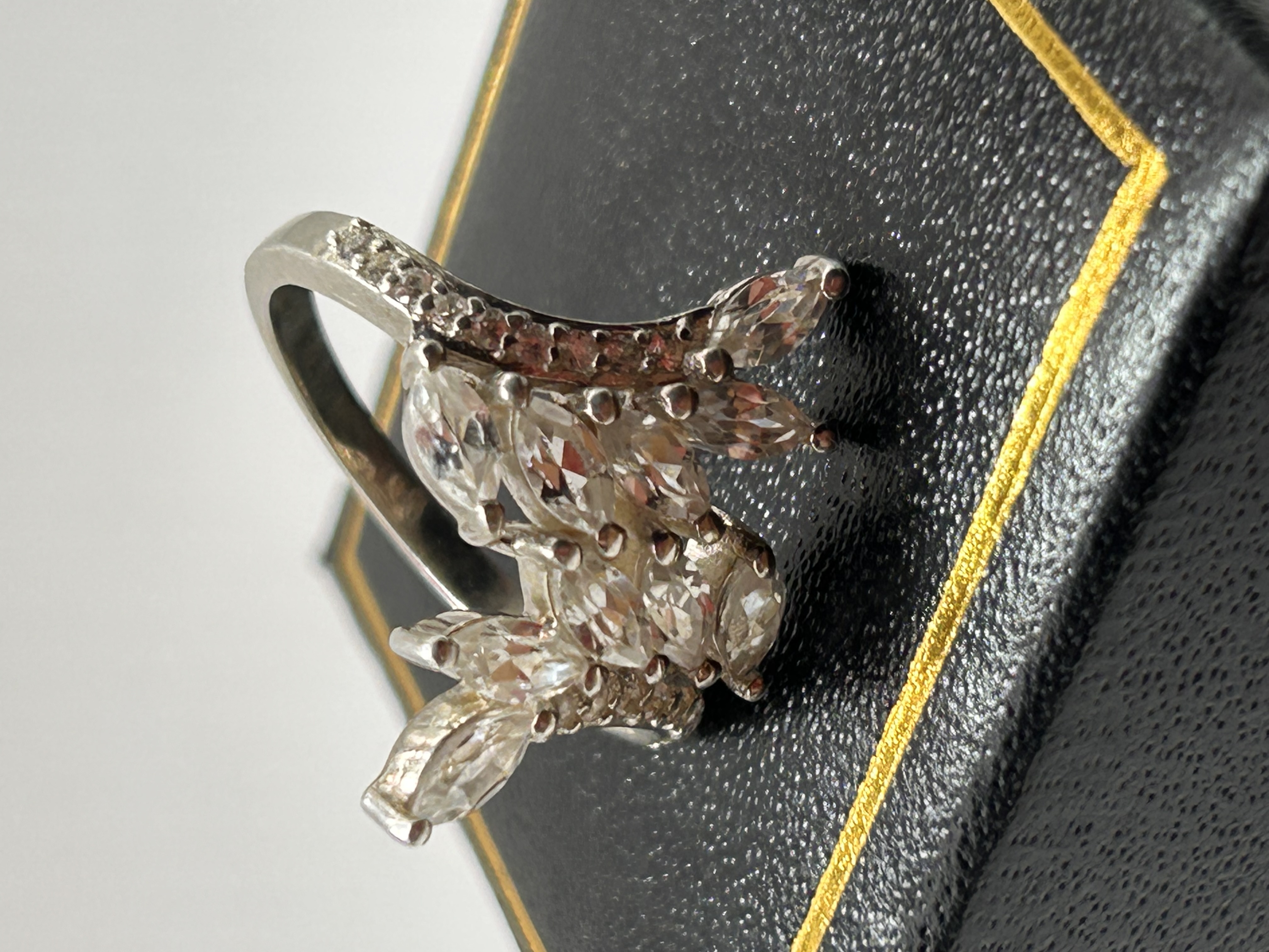 This is a single cluster-set finger ring attributed by market consensus to be crafted from sterling silver and set with colorless cubic zirconia stones. The head of the ring features a swirling, organic design set with six large marquise (navette) cut stones. The band shoulders are further accented by seven small round stones, totaling thirteen set stones. The setting utilizes an openwork gallery structure on the underside, featuring decorative, leaf-like cutouts. No hallmarks or identifying inscriptions are visible.