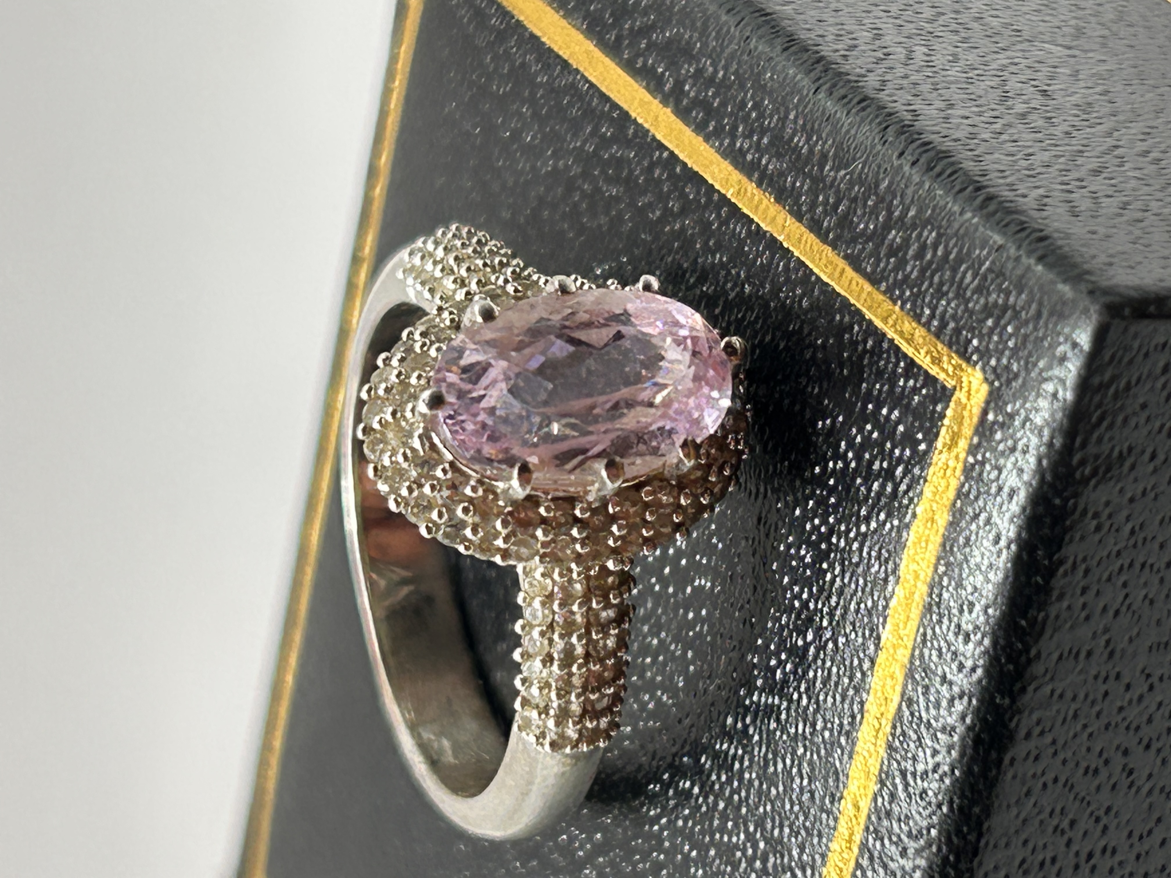 A cocktail or statement ring attributed to the Suzy Levian style. The piece is constructed from silver-toned metal, consistent with sterling silver as suggested by market comparables. The design features a prominent oval-cut central gemstone of a pink or light purple hue, securely held by prongs. The central stone is surrounded by a wide halo and flanked by shoulders heavily encrusted with numerous small round colorless accent stones. The accent stones are set in a bead or pavé style, creating a highly textured surface finish. The central stone is likely a Pink Sapphire or Kunzite, and the accent stones are likely white sapphire or diamond simulants, typical of the Suzy Levian sterling silver line. No discernible hallmarks or text were visible during inspection.