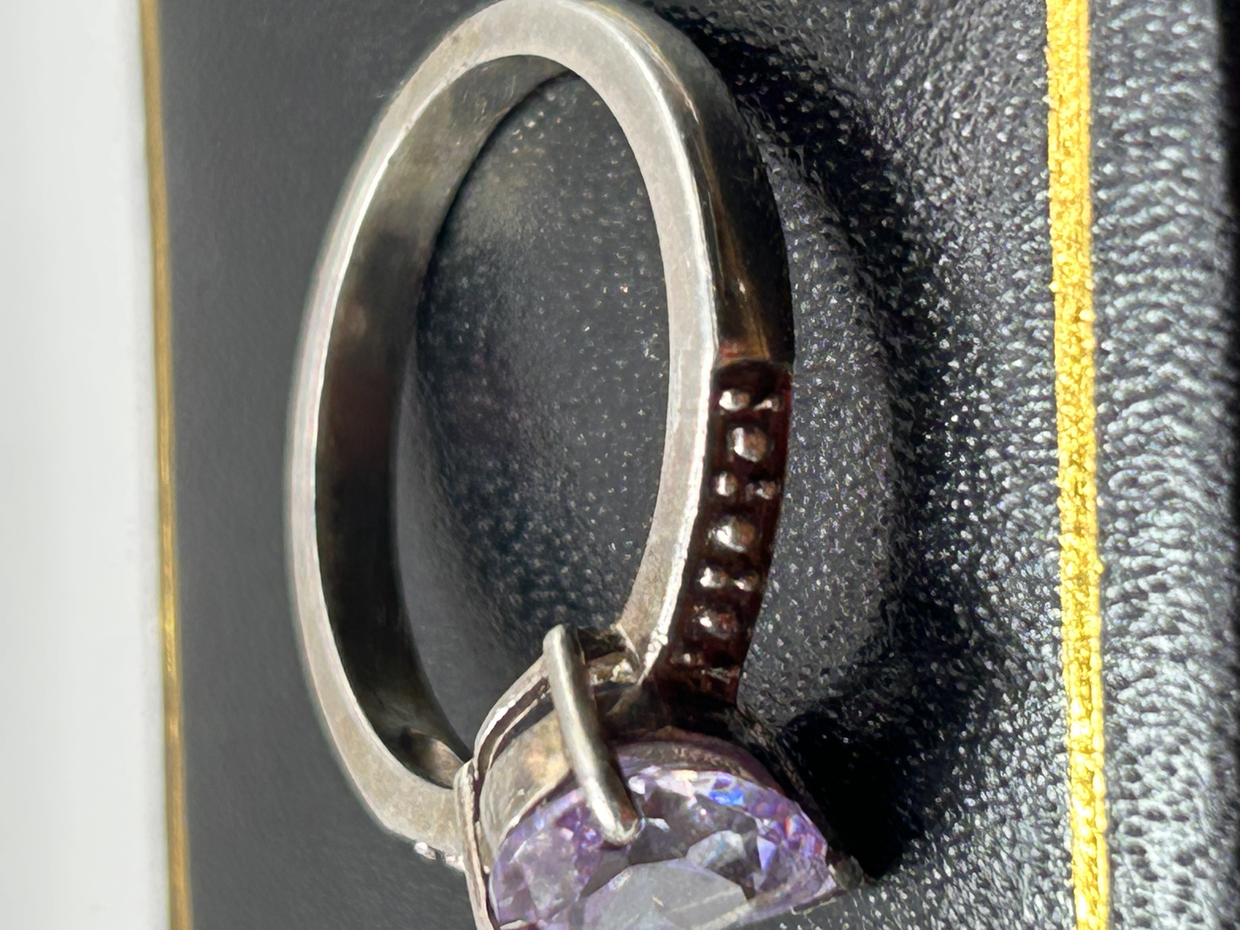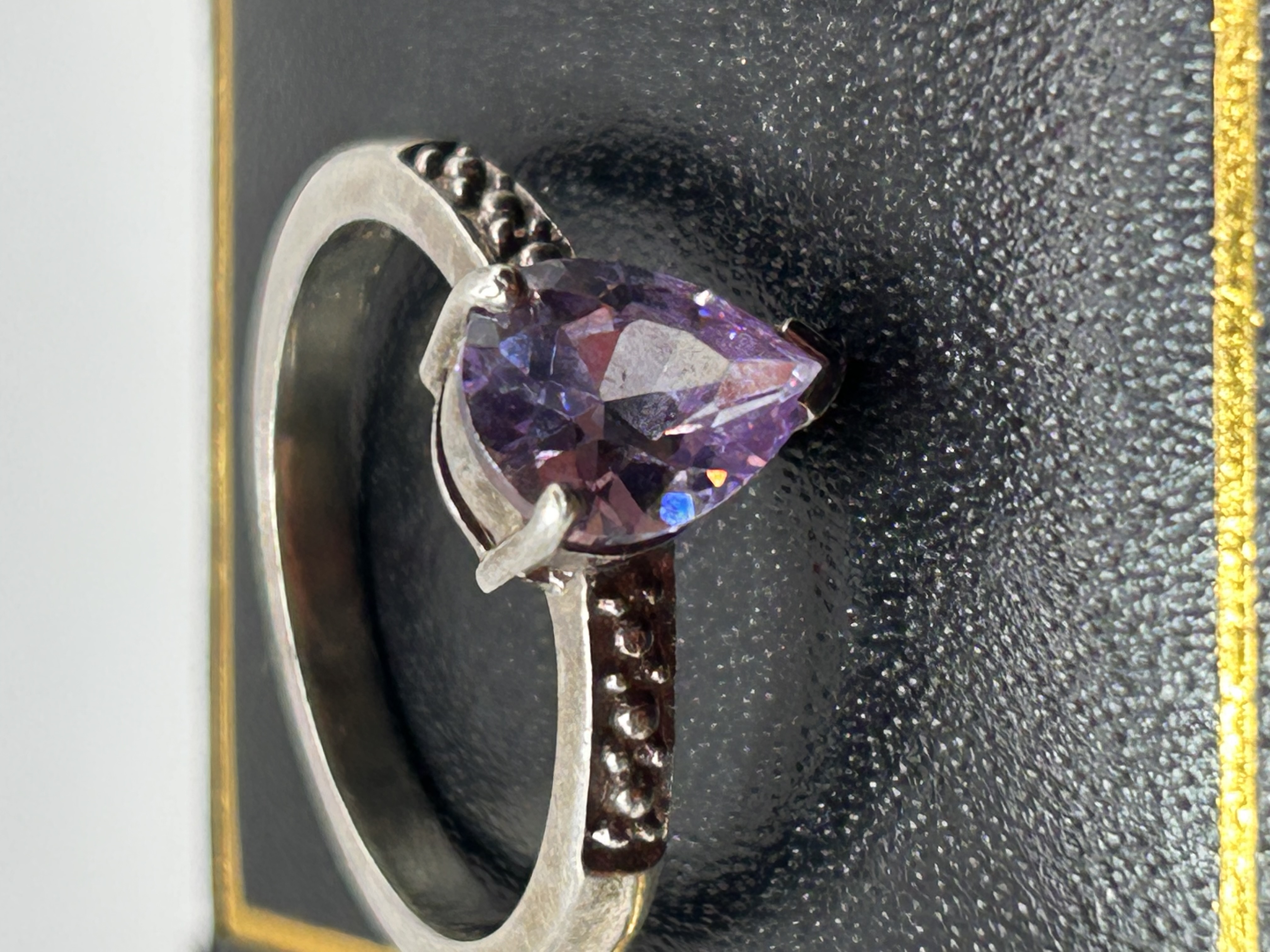 A solitaire finger ring constructed of white metal, identified by market consensus and visual evidence as likely sterling silver. The ring features a large, faceted, pear-shaped gemstone displaying a violet to light purple coloration, consistent with amethyst. The stone is secured in a four-prong setting. The shoulders of the band are decorated with recessed dot or bead detailing. No visible hallmarks or inscriptions are present.