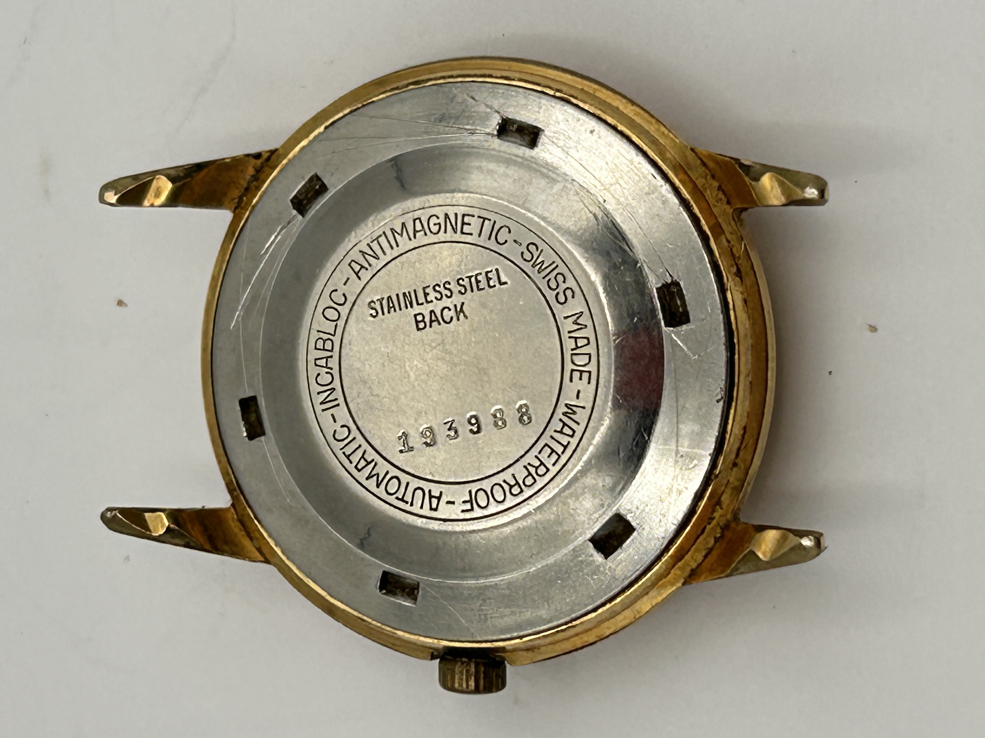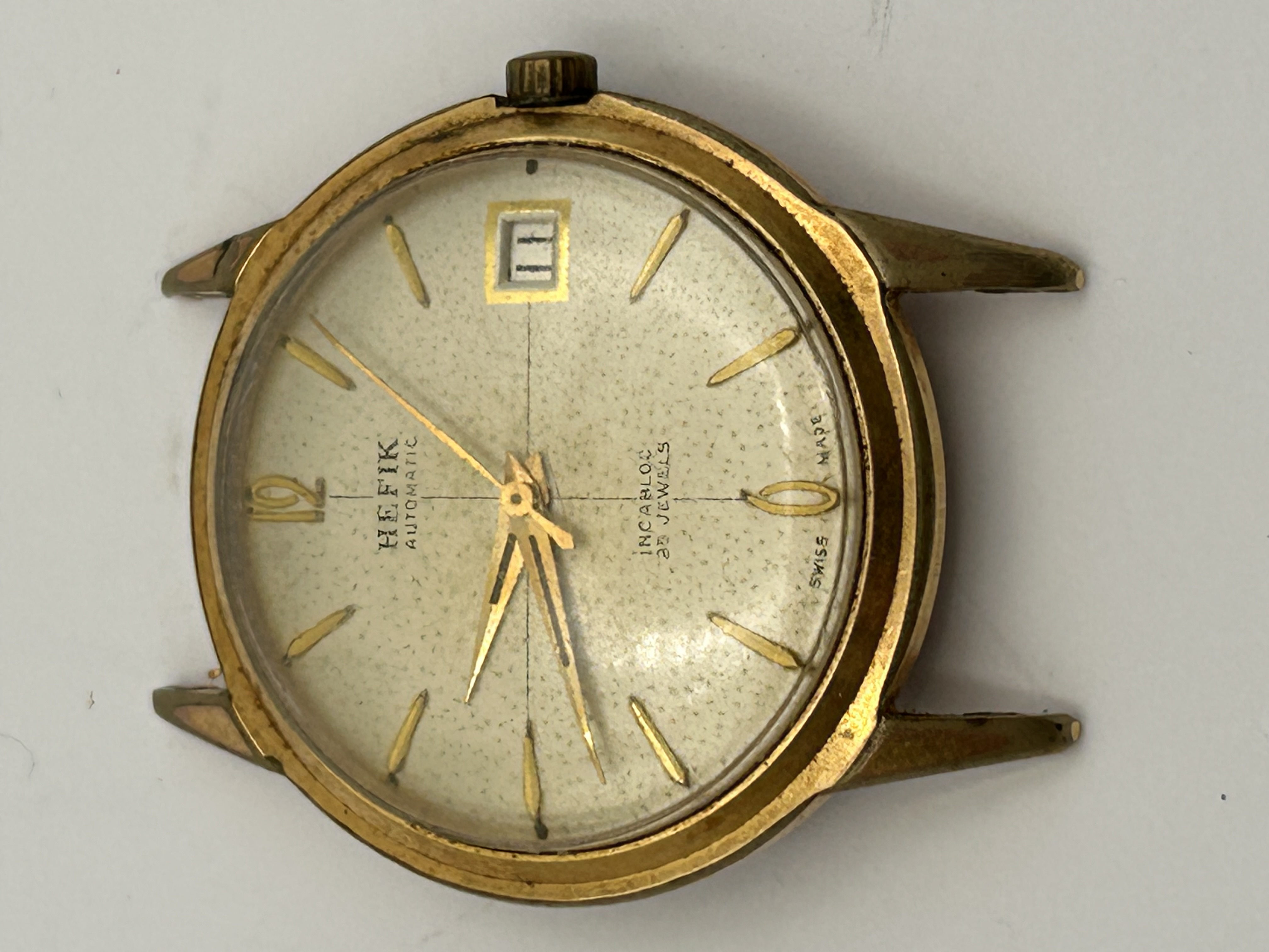 A single vintage HEFIK automatic wristwatch head, presented without a strap. The watch features a gold-tone plated case and lugs contrasted by a stainless steel screw-down or snap-on case back. The light-colored dial is speckled and features applied gold-tone baton markers, a single Arabic numeral ’12’, and a date aperture at the 3 o’clock position currently displaying the numeral ’11’. The dial is inscribed “HEFIK AUTOMATIC,” “INCARBLOC 25 JEWELS,” and “SWISS MADE.” The reverse of the stainless steel case back is engraved with specifications including a circular ring reading “- AUTOMATIC – INCABLOC – ANTIMAGNETIC – SWISS MADE – WATERPROOF -” and central markings “STAINLESS STEEL BACK” above the number “13398.”