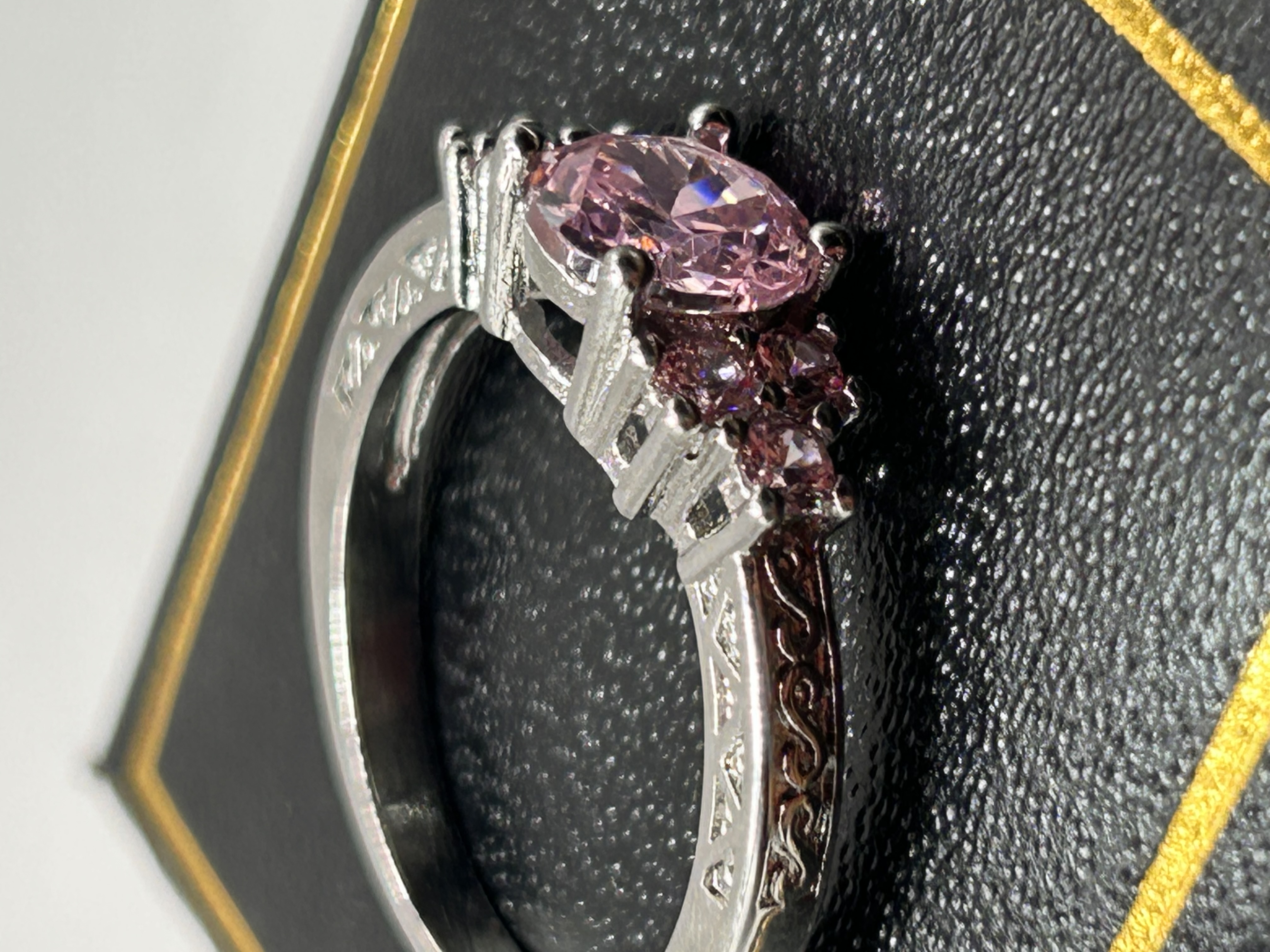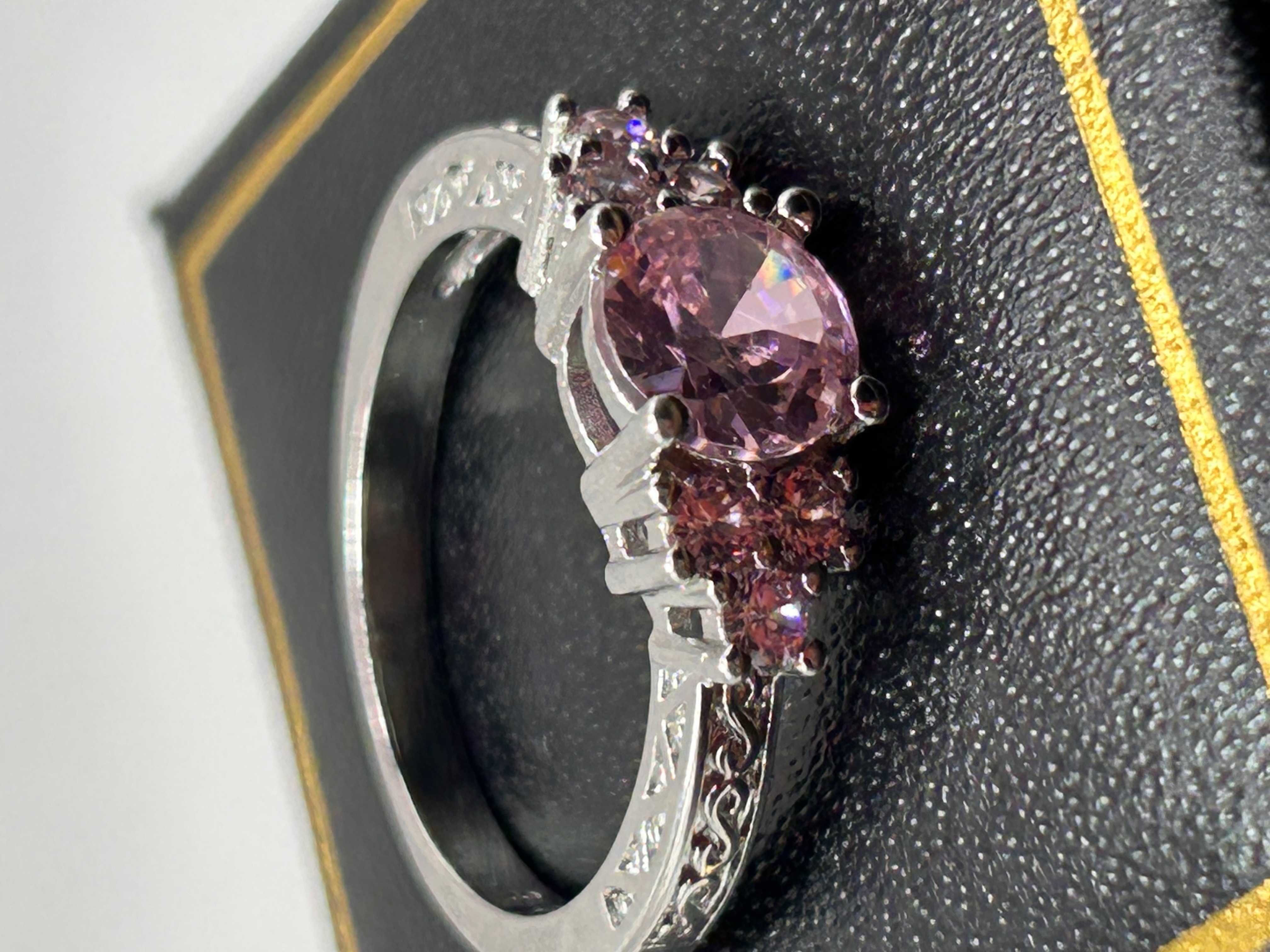 A single decorative finger ring constructed from Silver. The ring features a cluster setting holding five faceted stones. The central stone is a prominent oval or round cut of pale pink color, flanked on each side by two smaller round faceted pink accent stones. The shoulders and upper shank of the band are detailed with deep, engraved scrollwork or filigree patterns, lending the piece a vintage-inspired aesthetic. Research suggests similar items are commonly marketed as engagement or promise rings featuring created pink sapphire or cubic zirconia stones set in sterling silver. No clear manufacturer’s marks or hallmarks are visible.