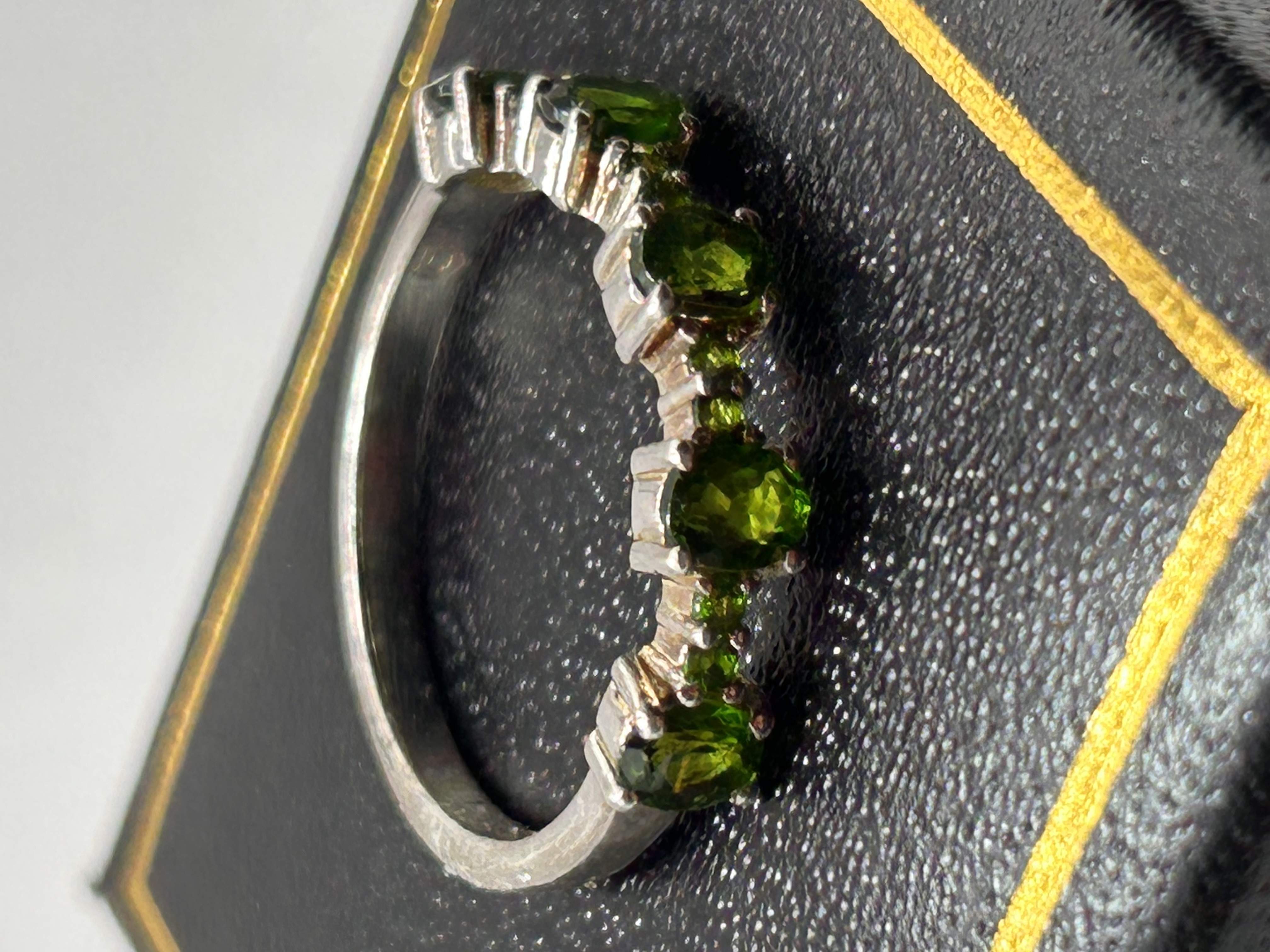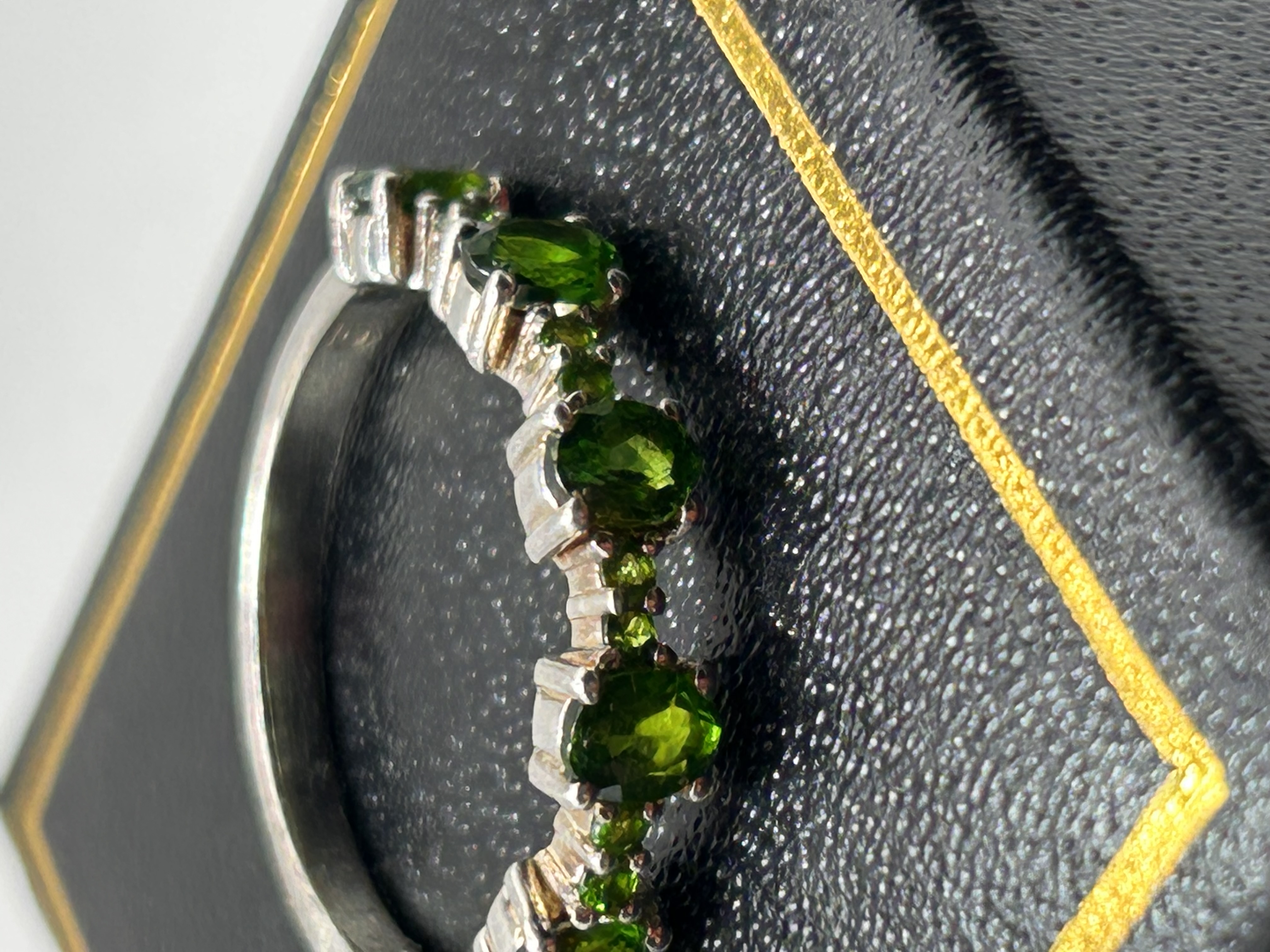 A half-eternity band ring crafted from white metal, consistent with Sterling Silver (.925) based on market comparisons. The ring head is adorned with a total of 14 green gemstones set in an alternating pattern. The design incorporates six larger, oval-cut stones secured in four-prong settings, separated by eight smaller, round-cut accent stones set in pairs between the larger gems. The gemstones display a vibrant, medium-to-deep green color, consistent with the characteristics of Chrome Diopside. The setting style is contemporary. No hallmarks, inscriptions, or identifying stamps are visible on the ring.
