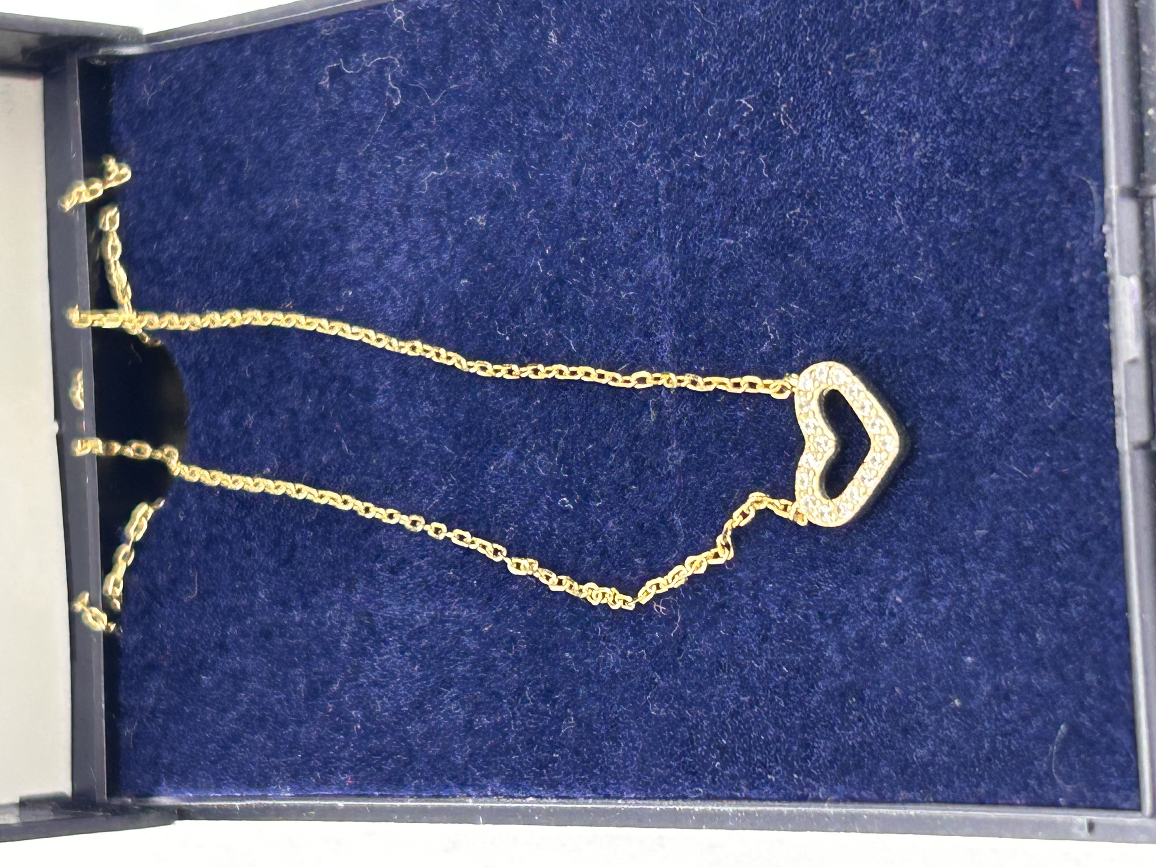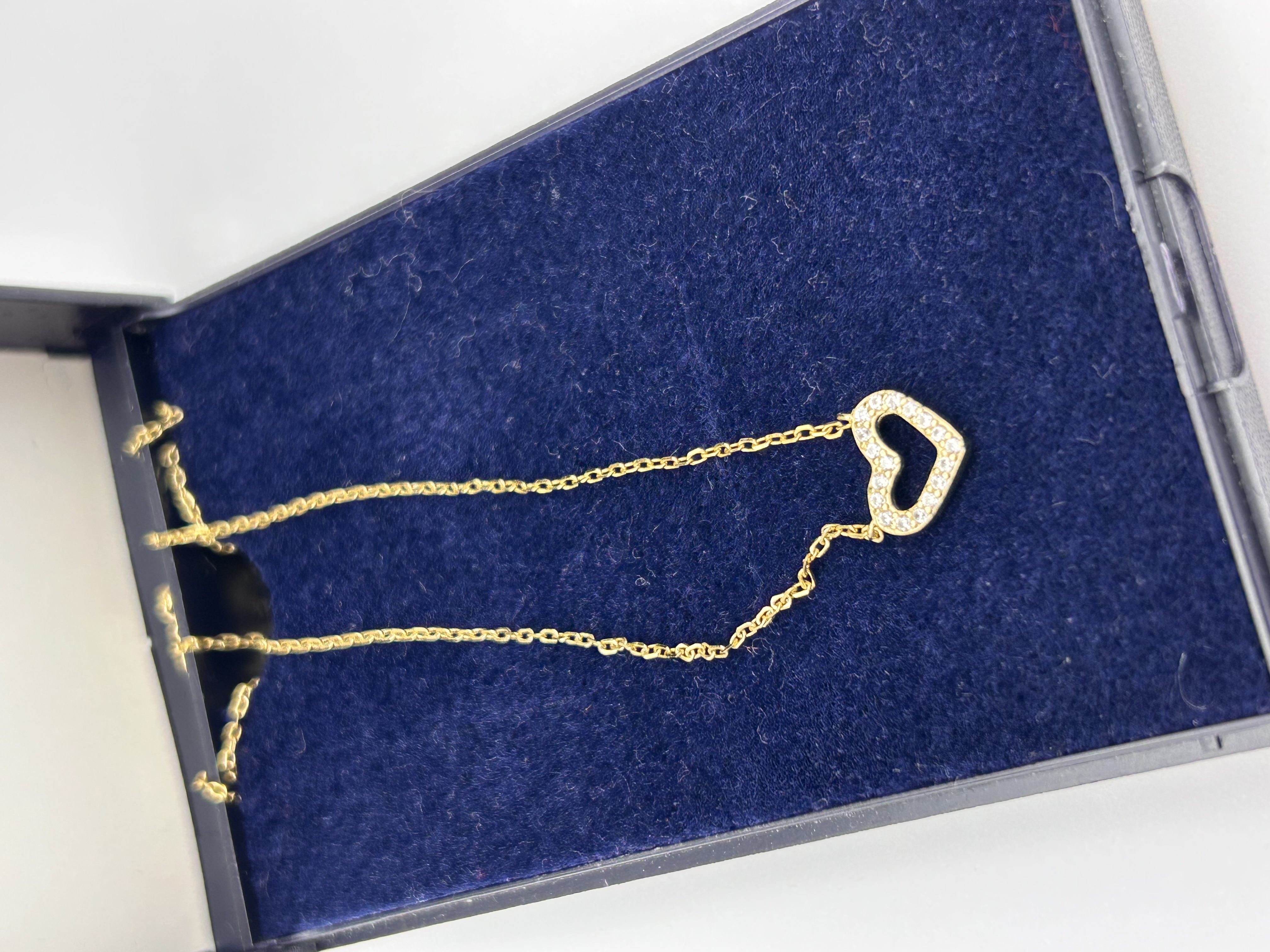 A single necklace featuring a heart-shaped pendant, confirmed to be constructed of Silver and finished with a plated yellow gold-tone surface. The pendant is fashioned as an open heart, fully bordered with small, round-cut colorless stones set in a pave style. The pendant is suspended from a delicate trace or cable chain. The design resembles the popular Cartier C Heart or D’amour style. The necklace is presented in an open, dark-colored presentation box lined with navy blue velvet fabric. No visible hallmarks or manufacturer markings are discernible on the jewelry or the box.
