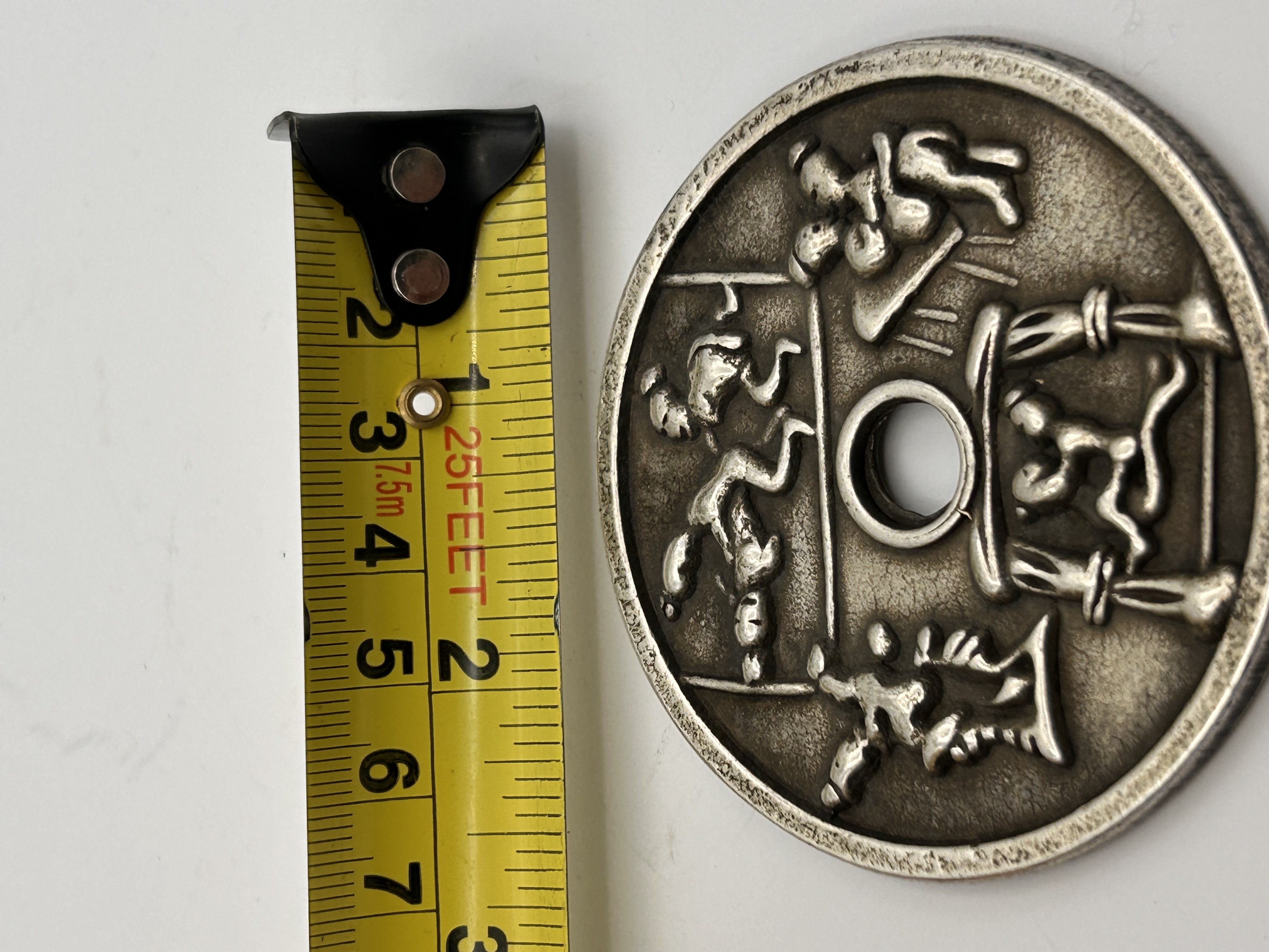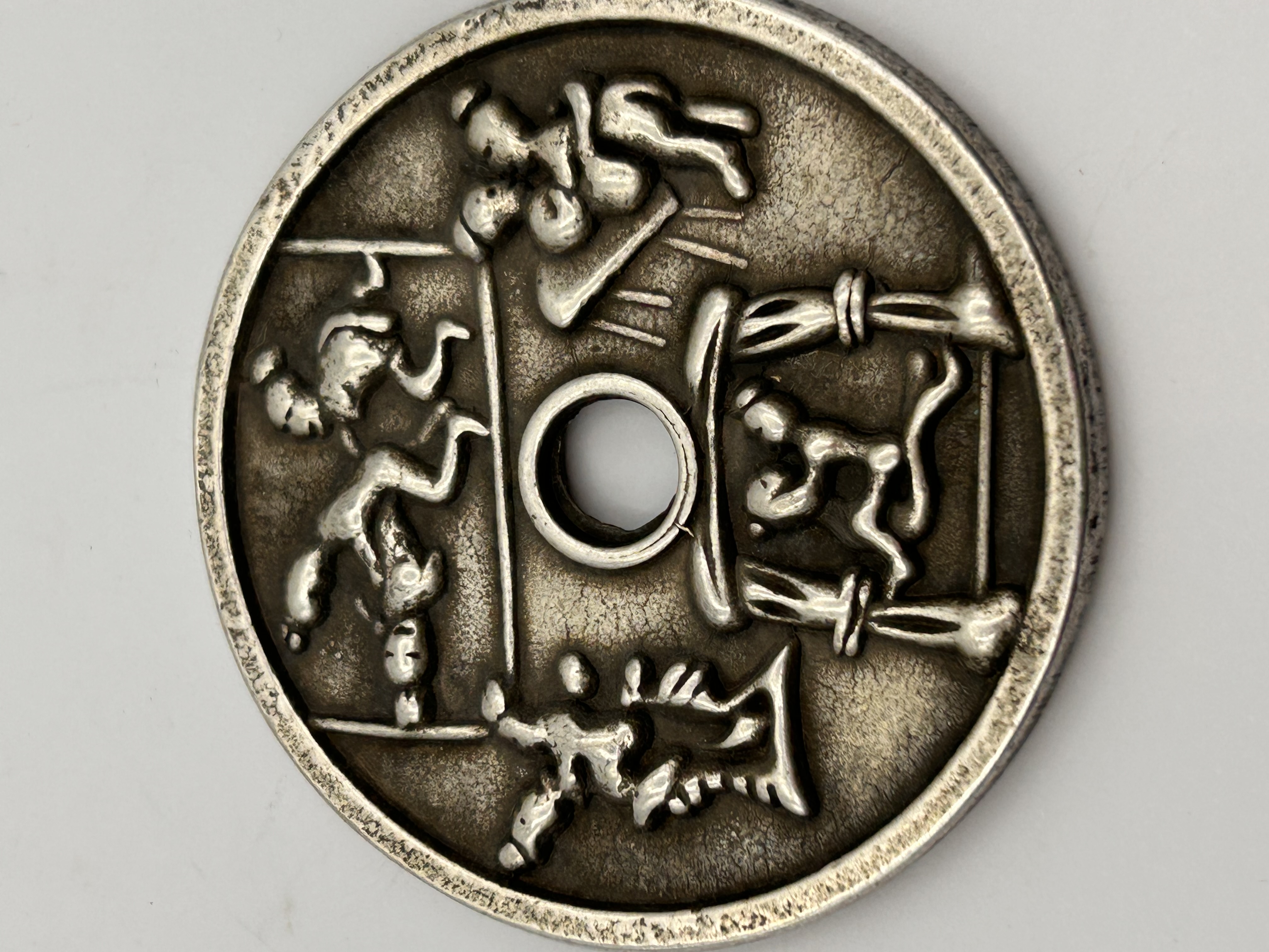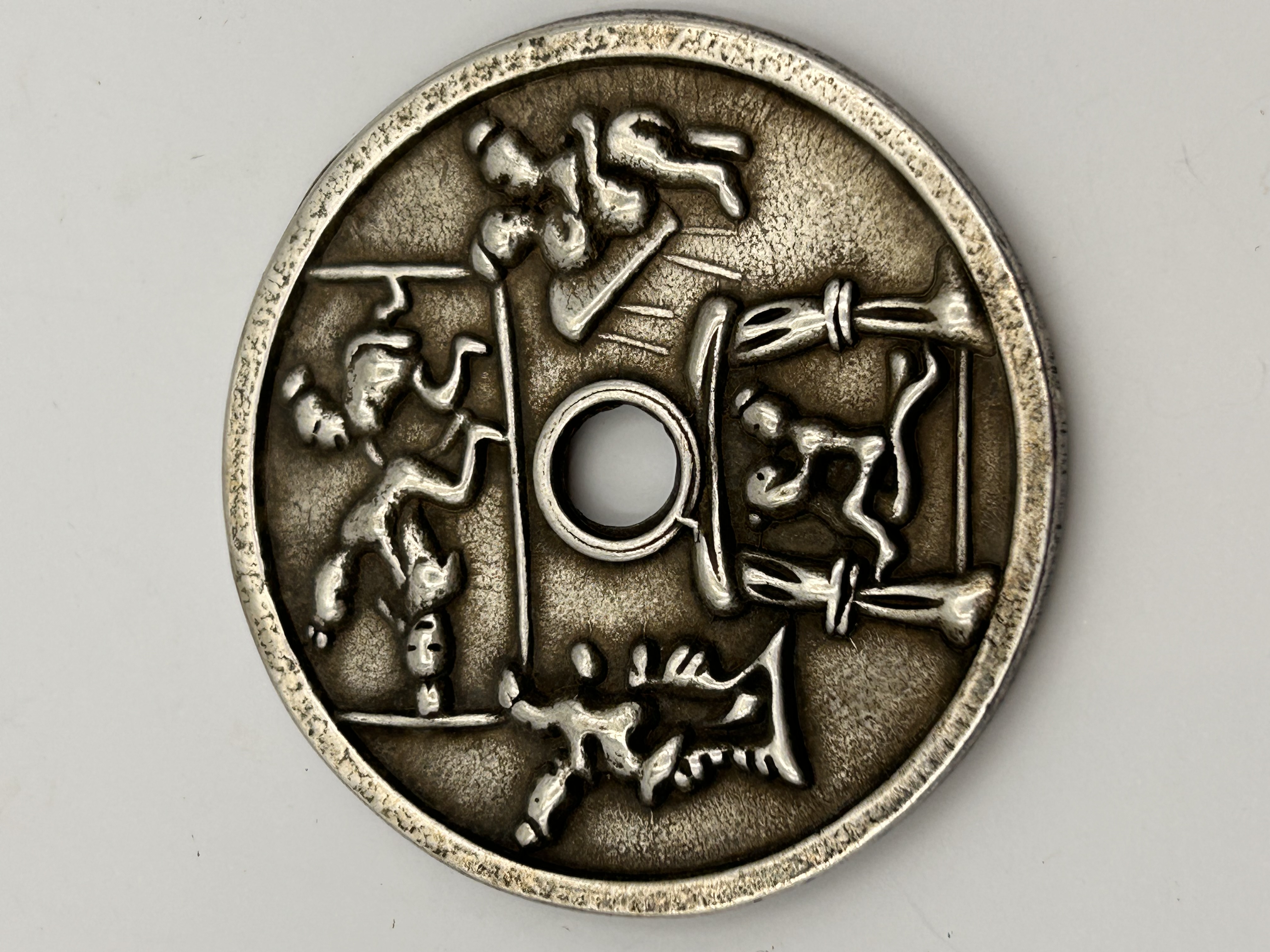 A single circular cast metal amulet or charm coin, typically Chinese in origin, featuring a central circular perforation and executed in high relief. The object is identified in the market as a Chinese erotic or exorcism charm. The material appears to be a base metal, likely bronze based on market consensus, exhibiting heavy tarnishing and wear. The obverse is divided into four quadrants surrounding the center hole, depicting highly stylized figural scenes. These scenes include human figures engaged in various activities, including acrobatic, martial, or intimate poses. The lower quadrant specifically features two figures intertwined within a structured enclosure, possibly representing a bed or canopy. No visible text, characters, or date markings are present.