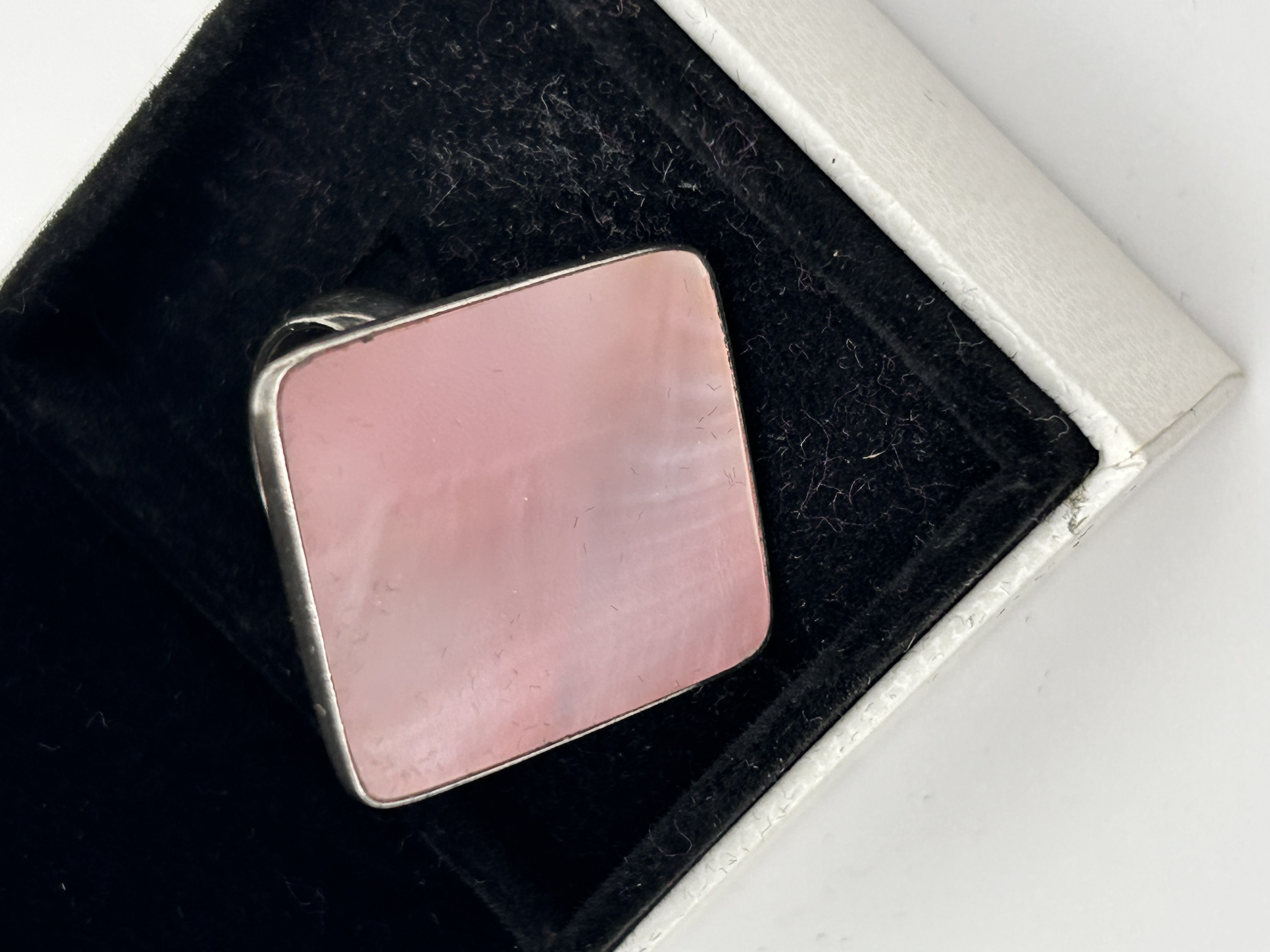 A single statement finger ring crafted from Silver, confirmed by the visible “925” hallmark stamped on the interior of the band, indicating sterling silver composition. The ring features a broad band supporting an oversized, elevated bezel. The bezel is set with a large, flat, rectangular inlay identified through market consensus as Rose Quartz. The stone exhibits a pink hue with natural striations and a subtle iridescent sheen, consistent with the appearance of Nacre or Mother-of-Pearl. The style is bold and contemporary. The ring is displayed resting inside a hinged white jewelry box lined with black velvet.