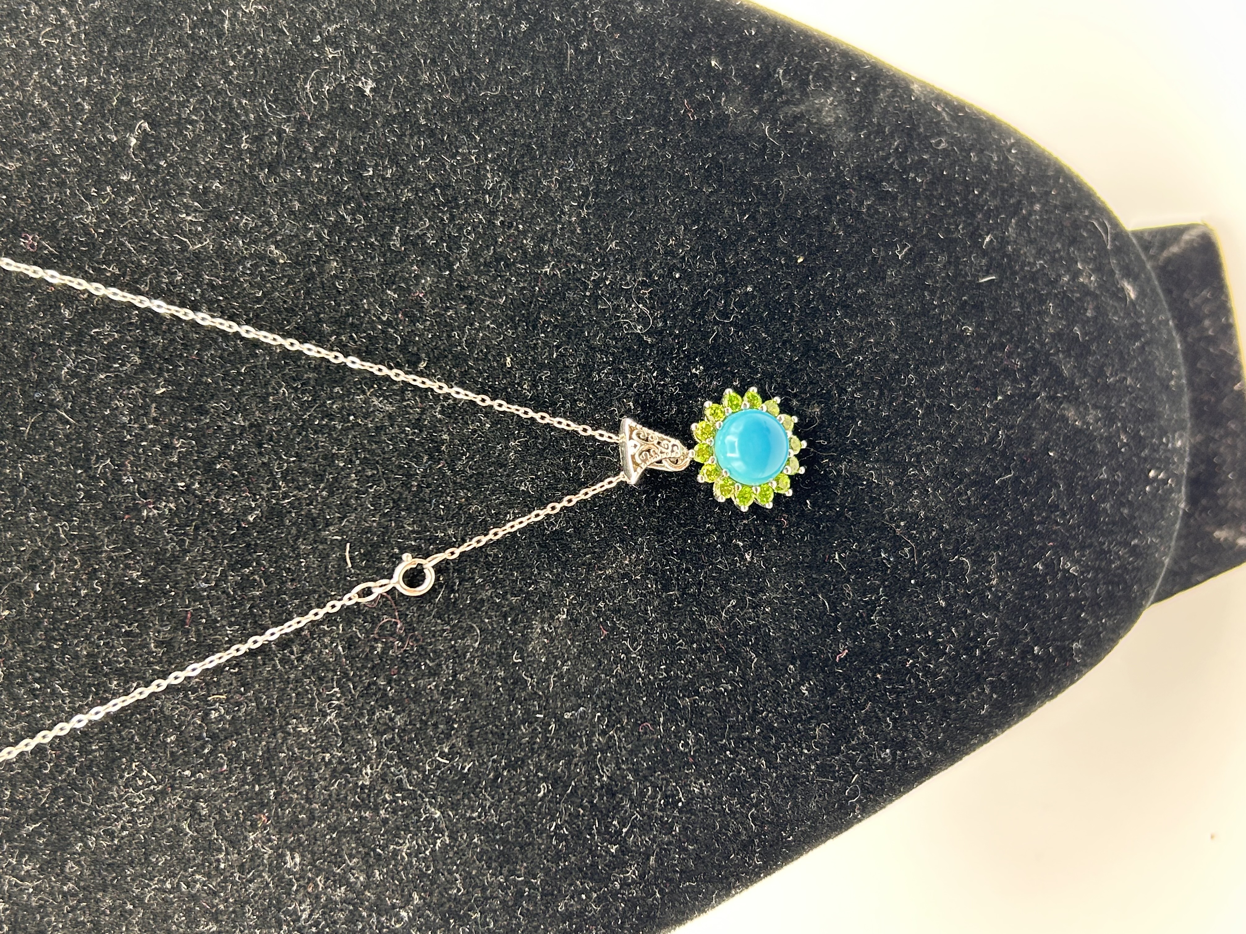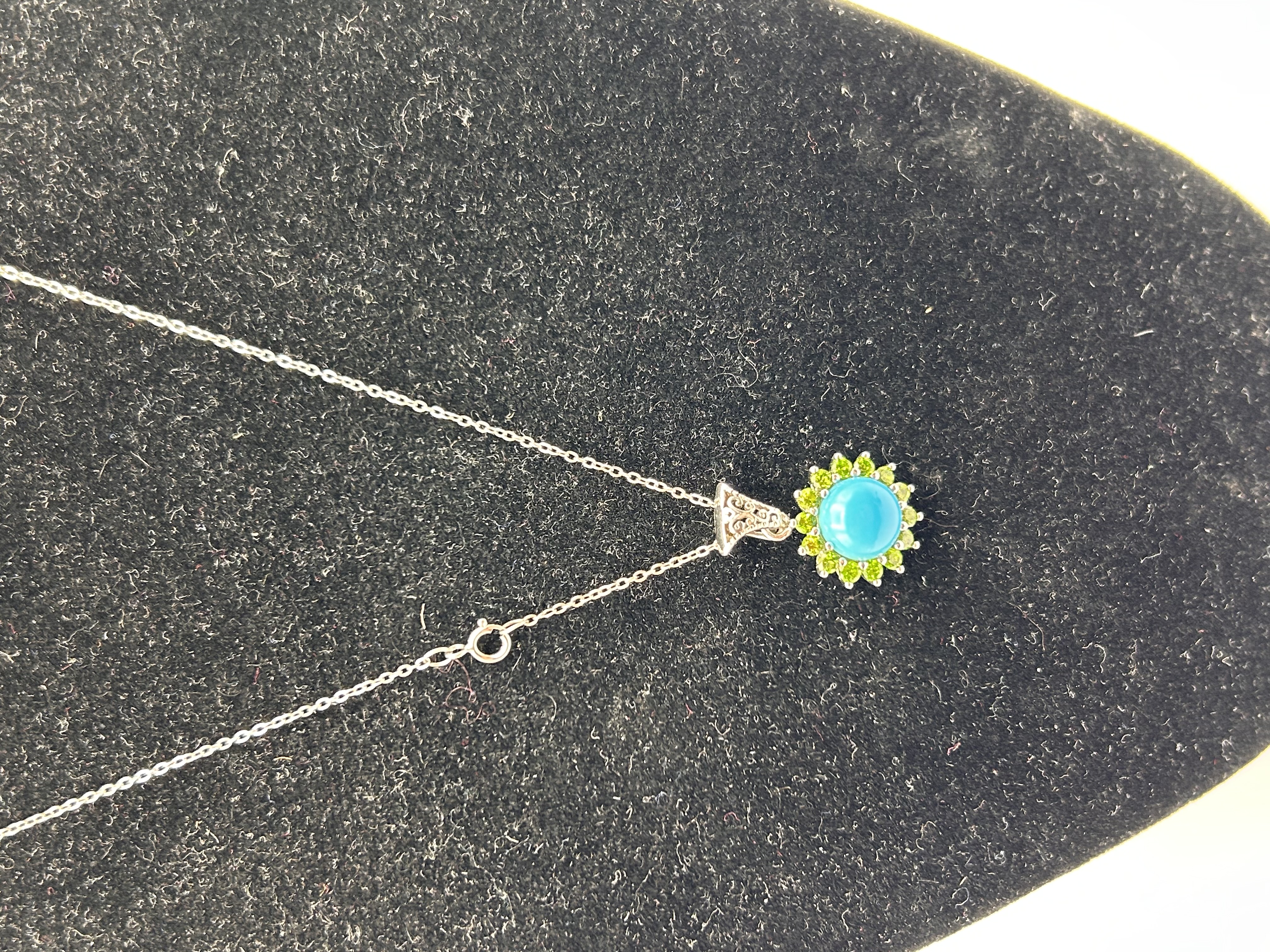 A single pendant necklace featuring a sun or sunflower motif. The piece is constructed of Silver. The pendant centers on a prominent, round, opaque turquoise cabochon stone, which is secured by a bezel setting. Surrounding the central stone is a halo of smaller, faceted stones, visually consistent with peridot or light green stones, forming the rays or petals of the design. The pendant is suspended from a delicate link chain secured by a spring ring clasp. The stylized bail connecting the pendant to the chain is accented with small clear stones.