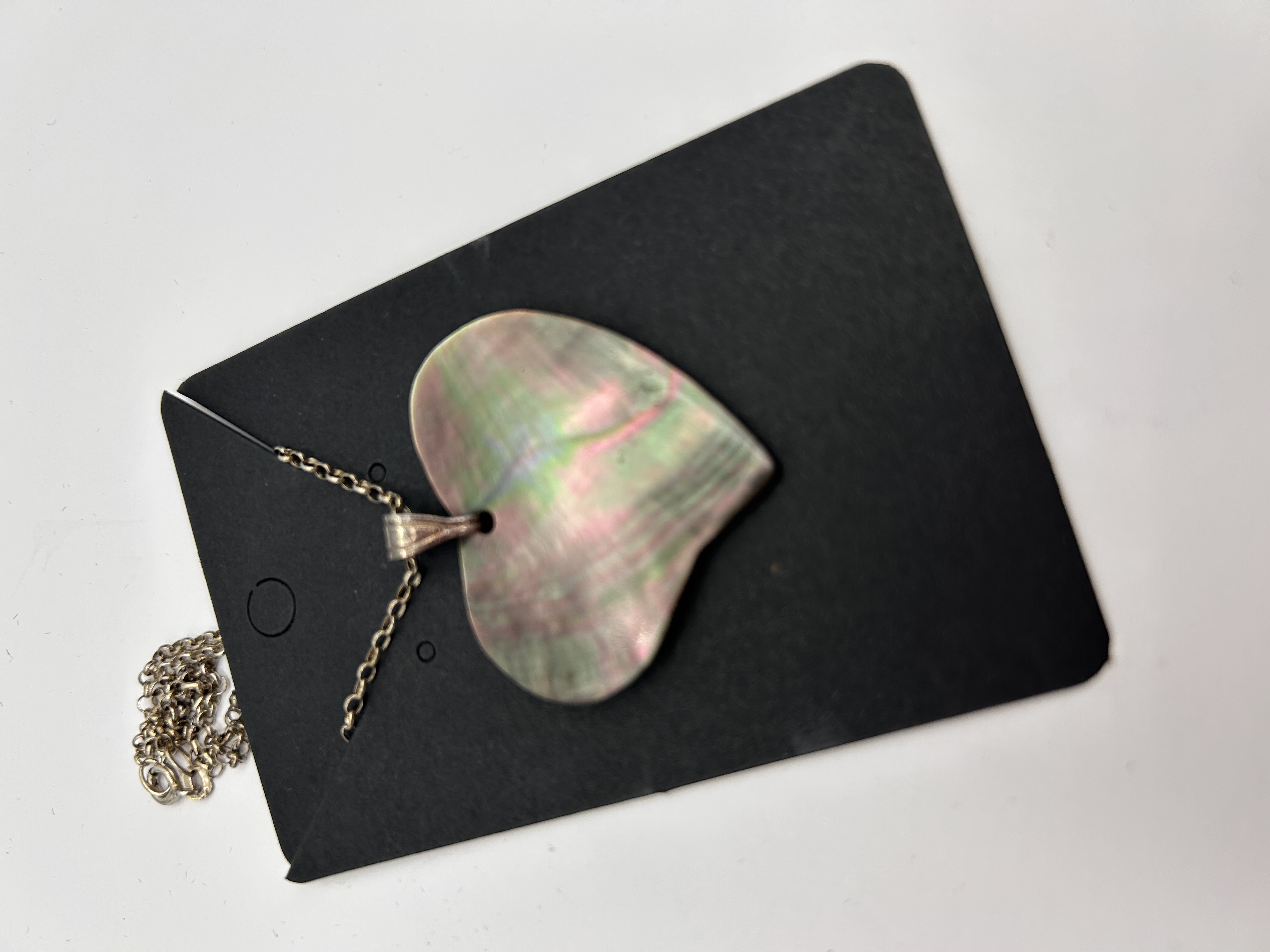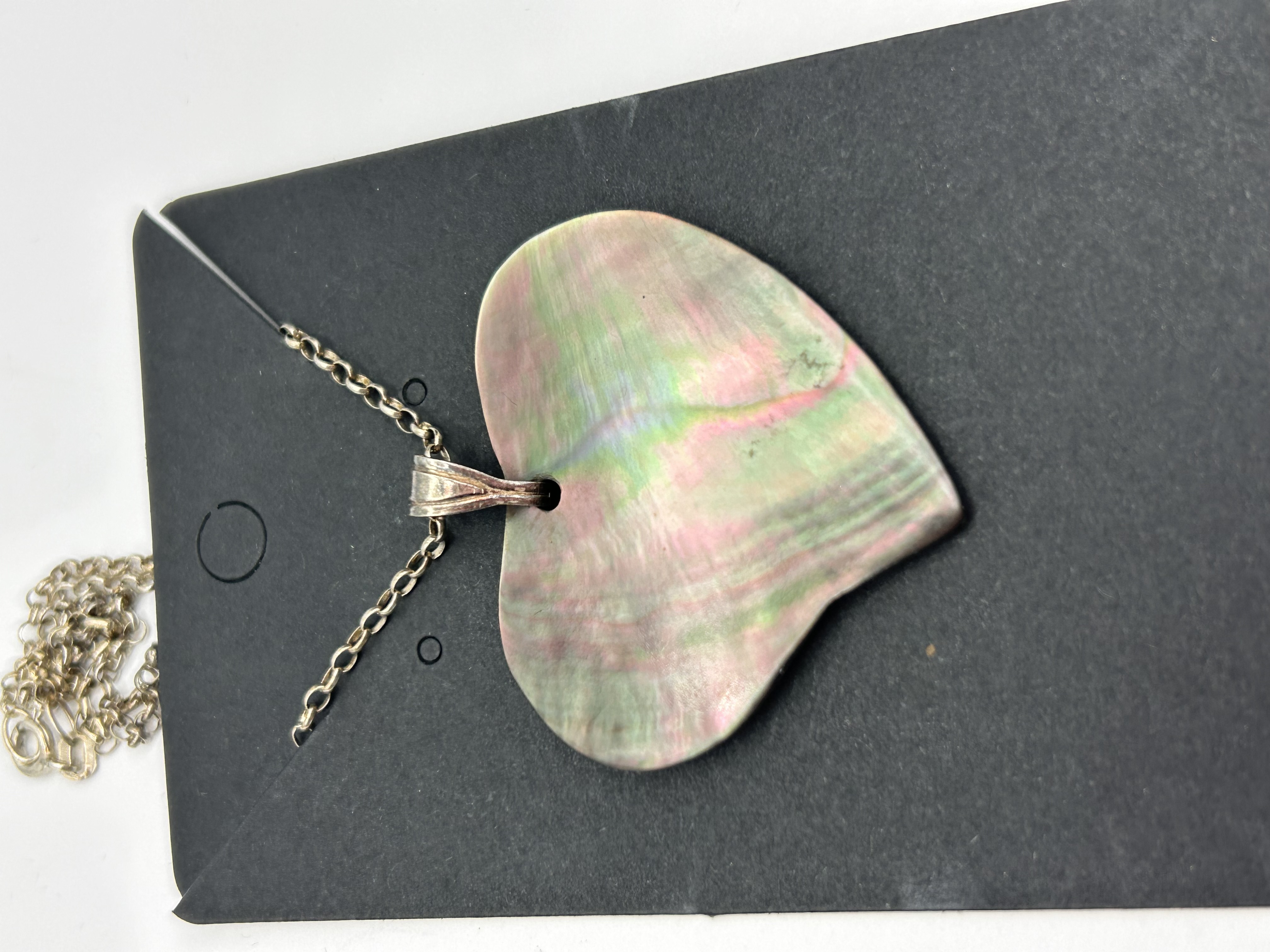 A single pendant necklace featuring a large, heart-shaped focal pendant crafted from highly iridescent shell material, likely mother-of-pearl (nacre) or abalone. The shell exhibits strong variegation of pink, green, and gray tones across its surface. The pendant is attached via a simple metal bail to a thin link chain. The metal components of the chain and bail are confirmed to be Silver. The item is presented mounted on its original rectangular, die-cut black cardboard display card.
