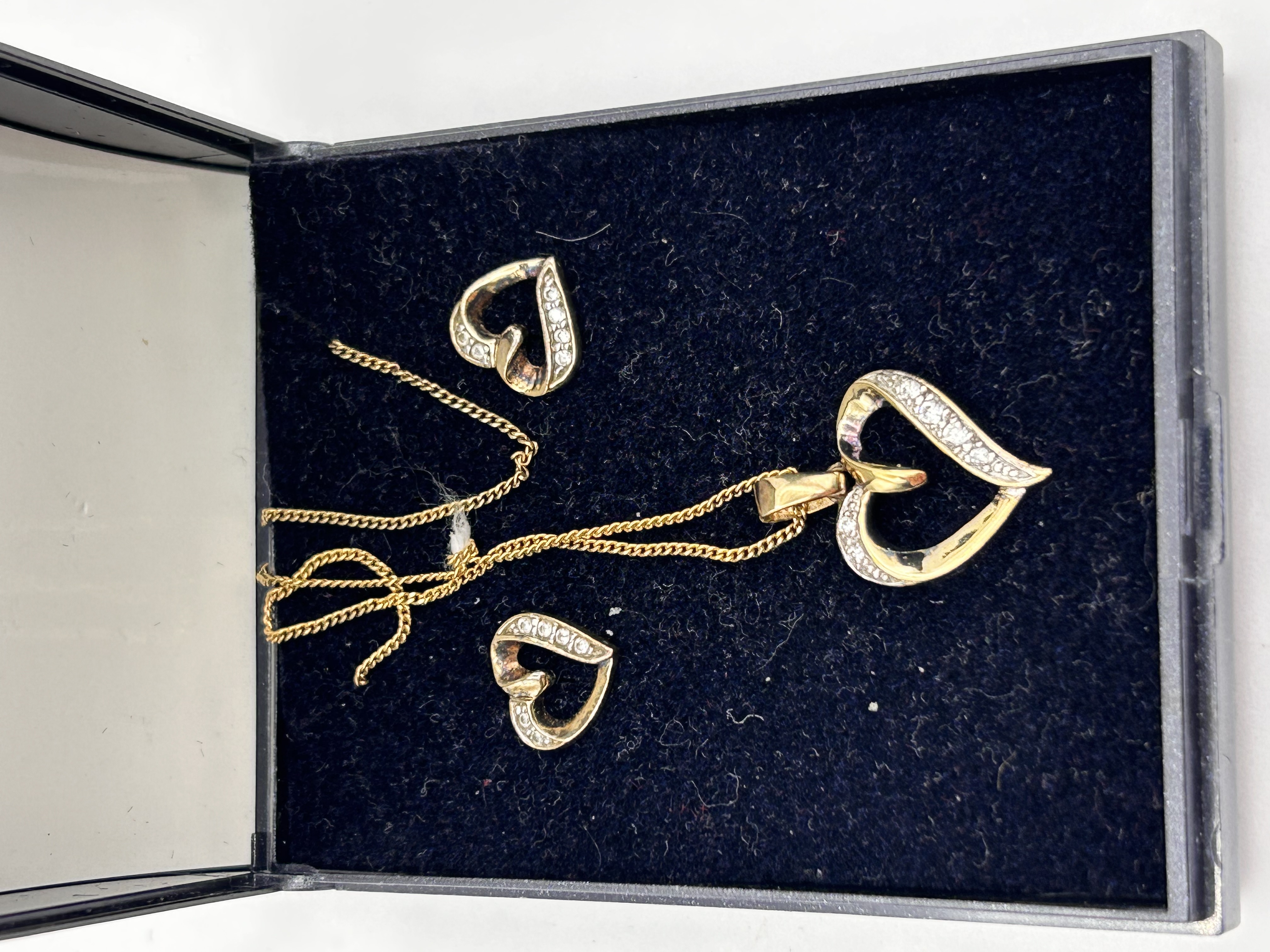 A contemporary jewelry set consisting of three pieces: a necklace with a pendant and a matching pair of stud earrings. The set is crafted from Silver, finished with a gold-toned plating (silver-gilt). The design features a unified, stylized open-heart motif. The necklace chain is a delicate curb link supporting a large heart pendant. The two stud earrings mirror the pendant’s asymmetrical open-heart design. All three pieces are accented along the lower curve with a pave setting of small, round, clear stones, likely simulated diamonds or cubic zirconia. The set is presented in its original open, black plastic box lined with dark navy blue flocked velvet.