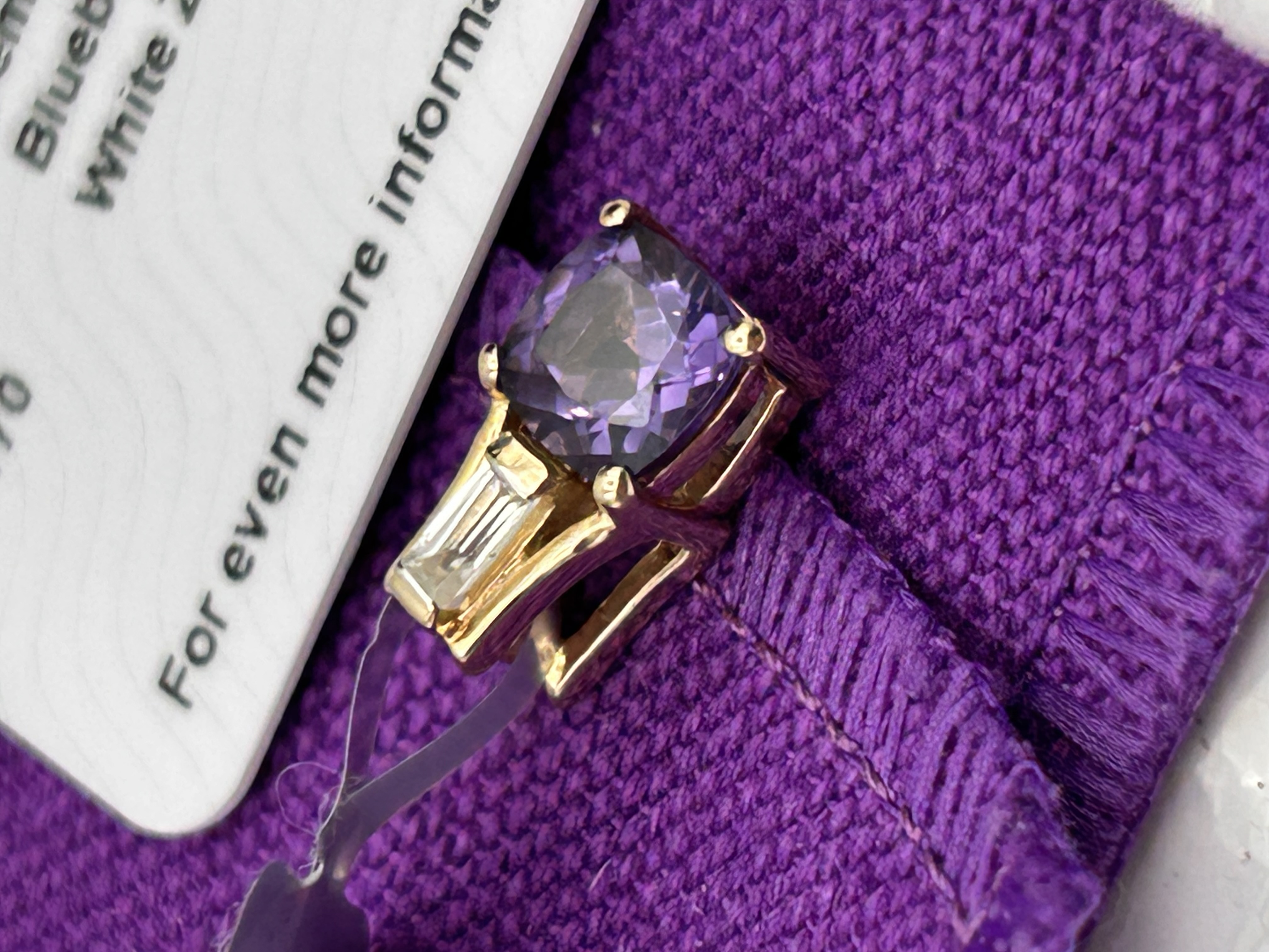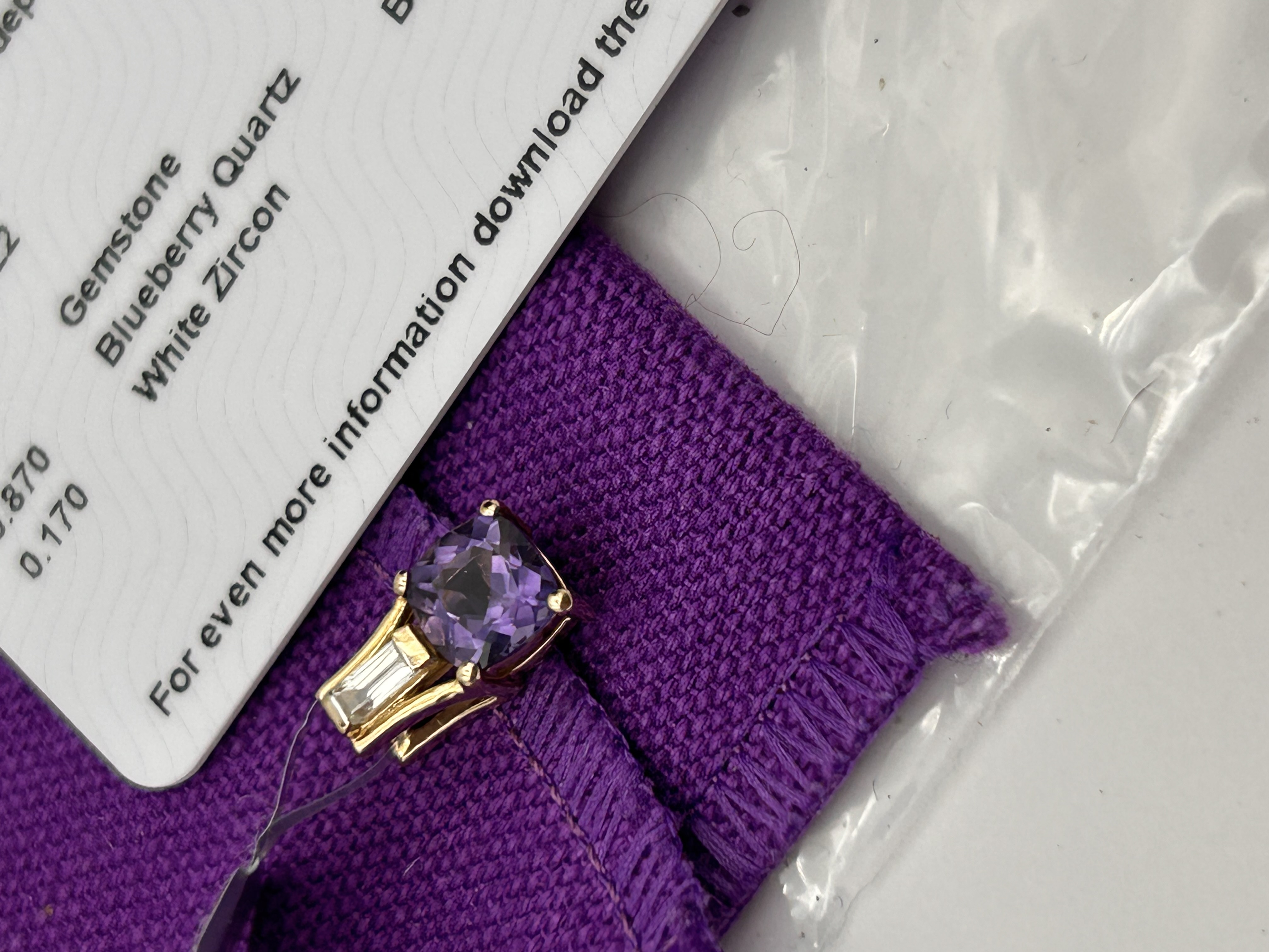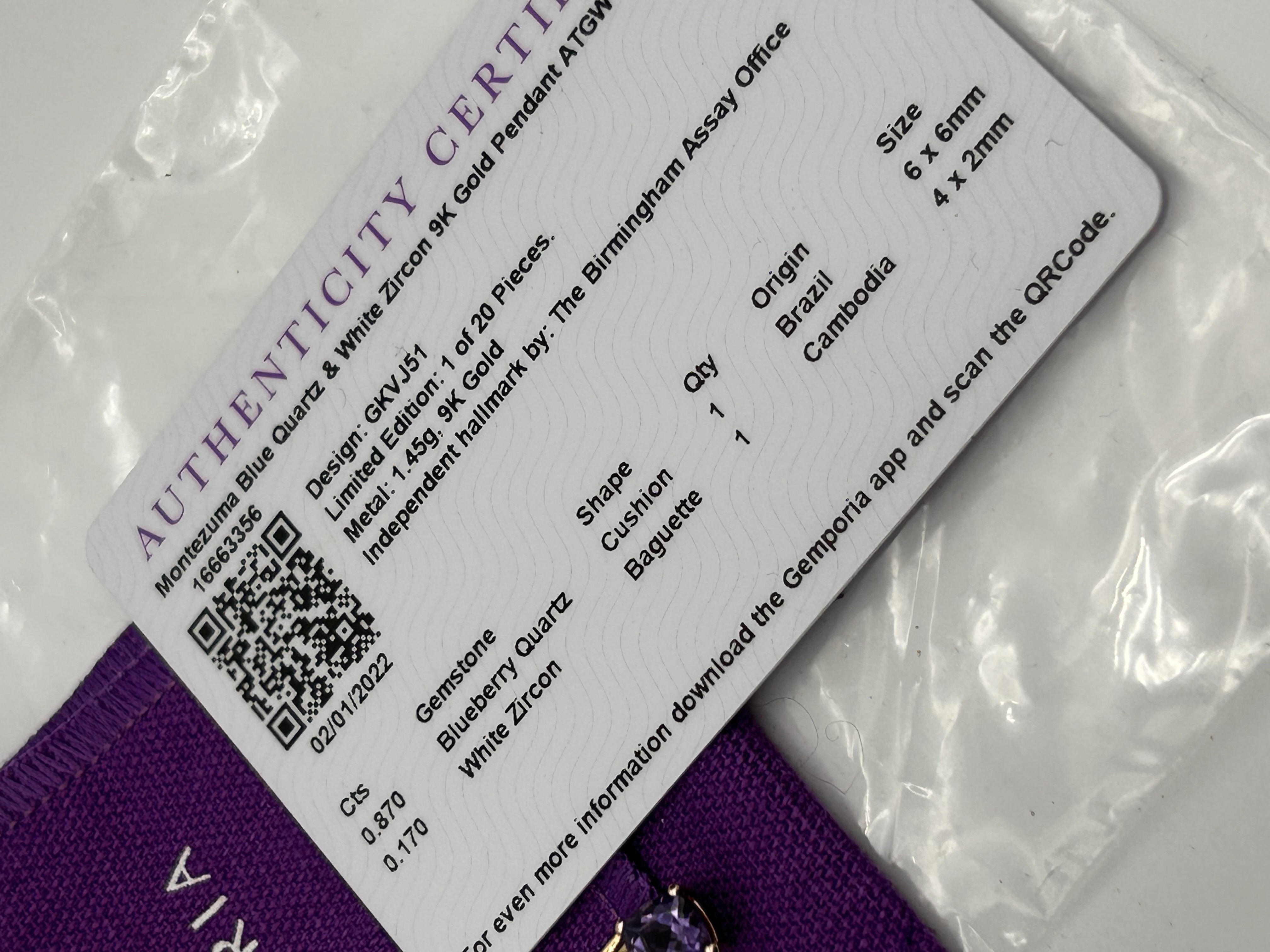 A modern fine jewelry pendant, Design GKVJ51, featuring a cushion-cut Blueberry Quartz and a baguette-cut White Zircon set in gold. This piece is confirmed to be a Limited Edition (1 of 20 Pieces) and was independently hallmarked by The Birmingham Assay Office on 02/01/2022. The primary stone is a 0.870 carat Blueberry Quartz (6x6mm) of Brazilian origin, four-prong set, topped by a horizontally oriented 0.170 carat White Zircon (4x2mm) of Cambodian origin. The metal composition is confirmed as 9K Gold specified on the accompanying certificate.