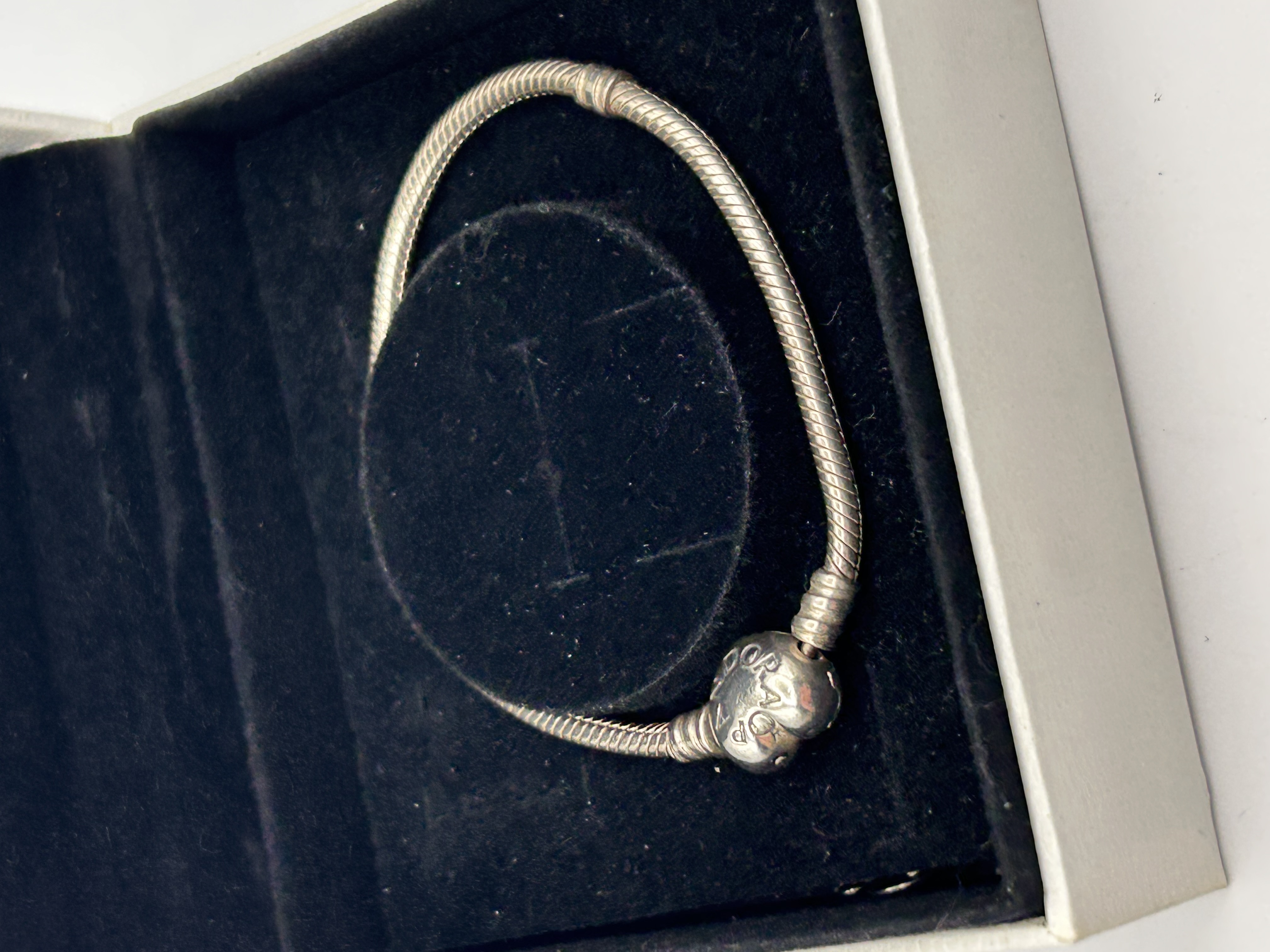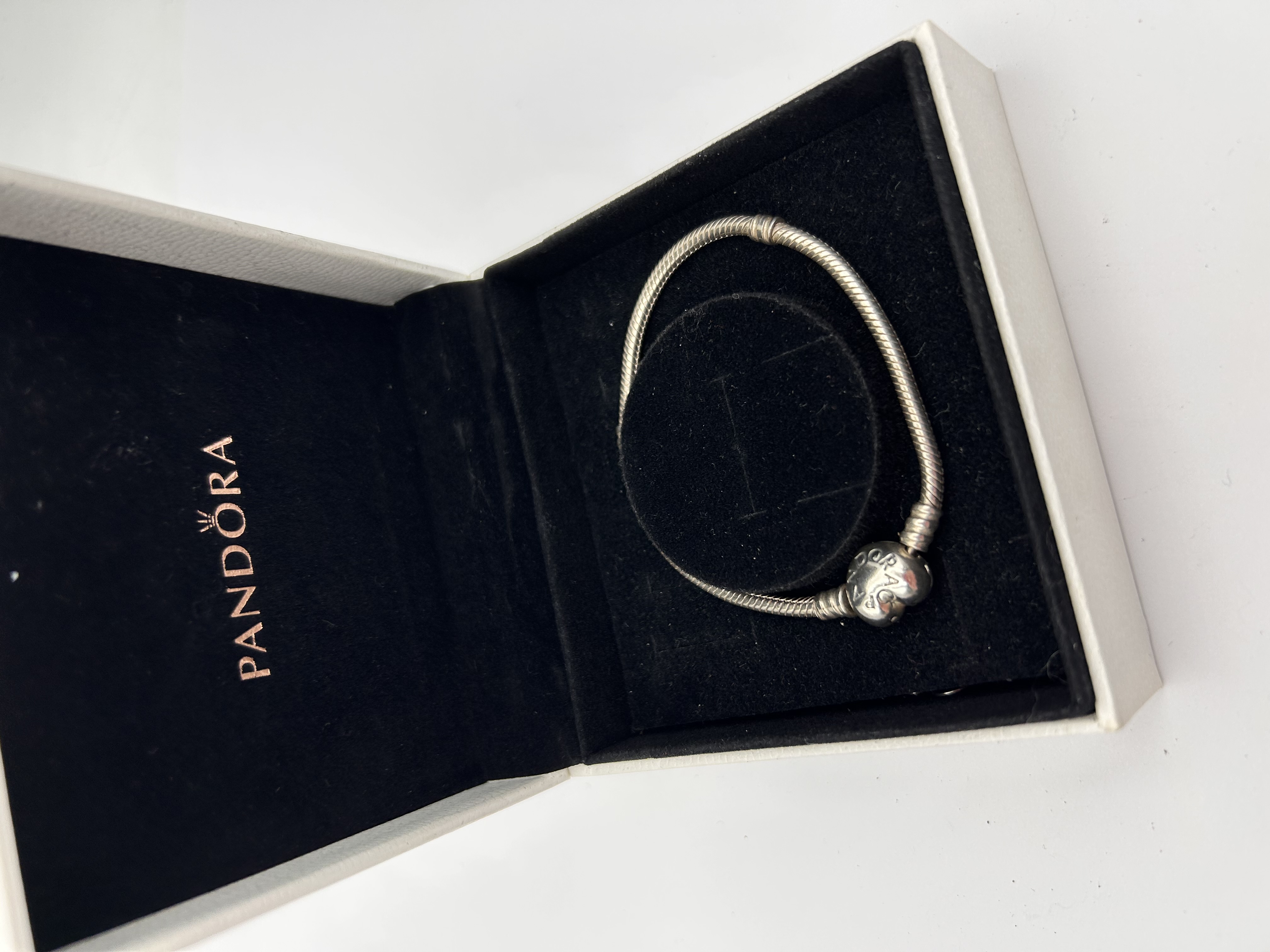 A Pandora Disney Moments Sparkling Mickey Mouse Snake Chain Bracelet. This piece is constructed of Silver, featuring the classic Moments snake chain design. The bracelet utilizes a rounded, slightly heart-shaped clasp consistent with the Disney collaboration Mickey Mouse design. The item is presented in its original white hinged presentation box. The interior lid of the box is marked PANDORA with the characteristic crown logo, rendered in a copper or rose gold tone script. The clasp itself bears faint inscriptions, likely the brand name.