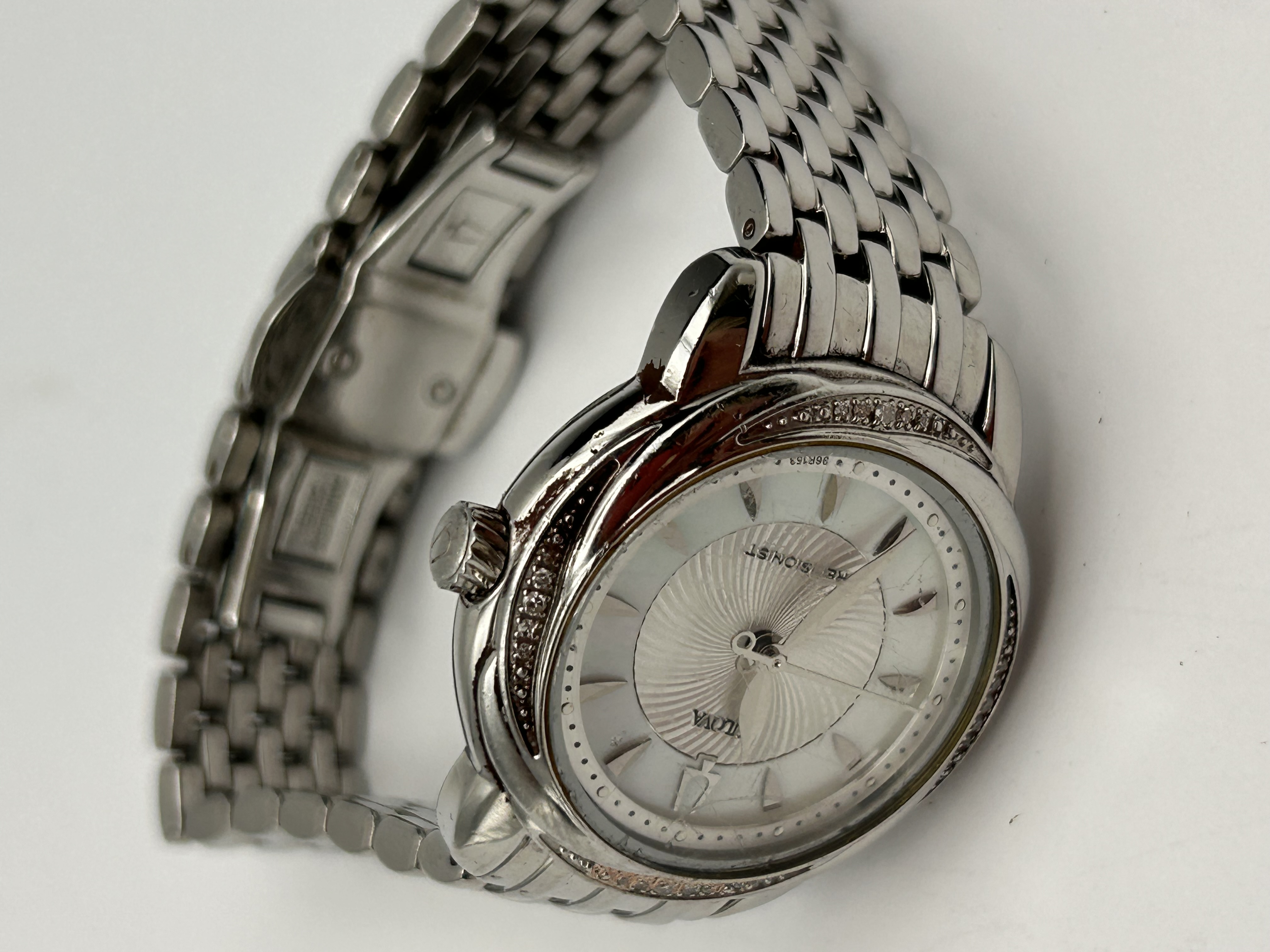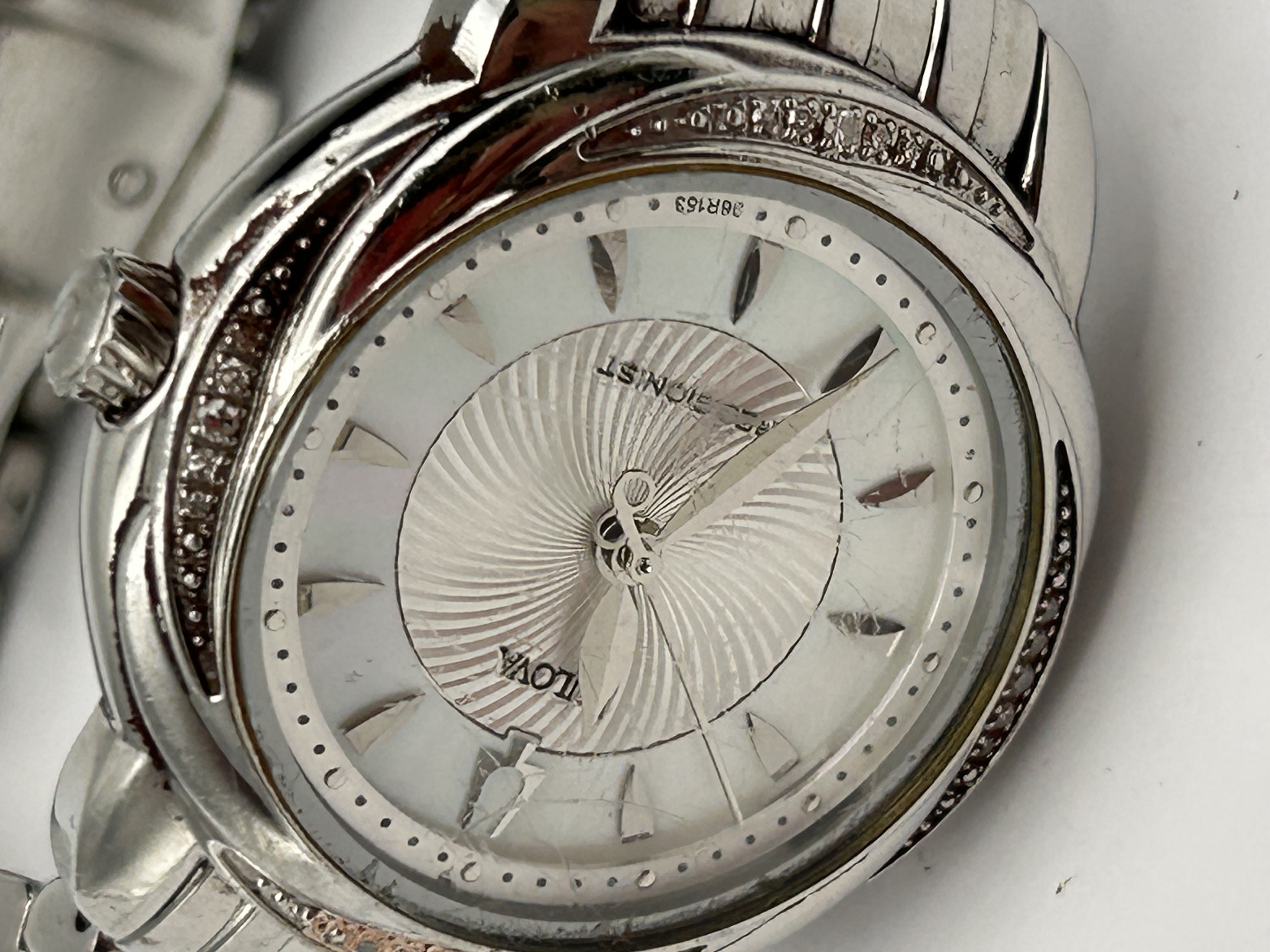 A Bulova Precisionist Brightwater ladies’ analog wristwatch, identified by the consensus reference number 96R153 (with visible dial marking 36R163). The construction is confirmed to be Silver. The watch features a multi-link bracelet and a round case. The bezel is accented with small clear stones, likely diamond simulants or diamonds. The dial is composed of a white outer track surrounding a central silver-toned section exhibiting a swirling radial guilloche pattern. Visible text on the dial includes “BULOVA” and “PRECISIONIST.”