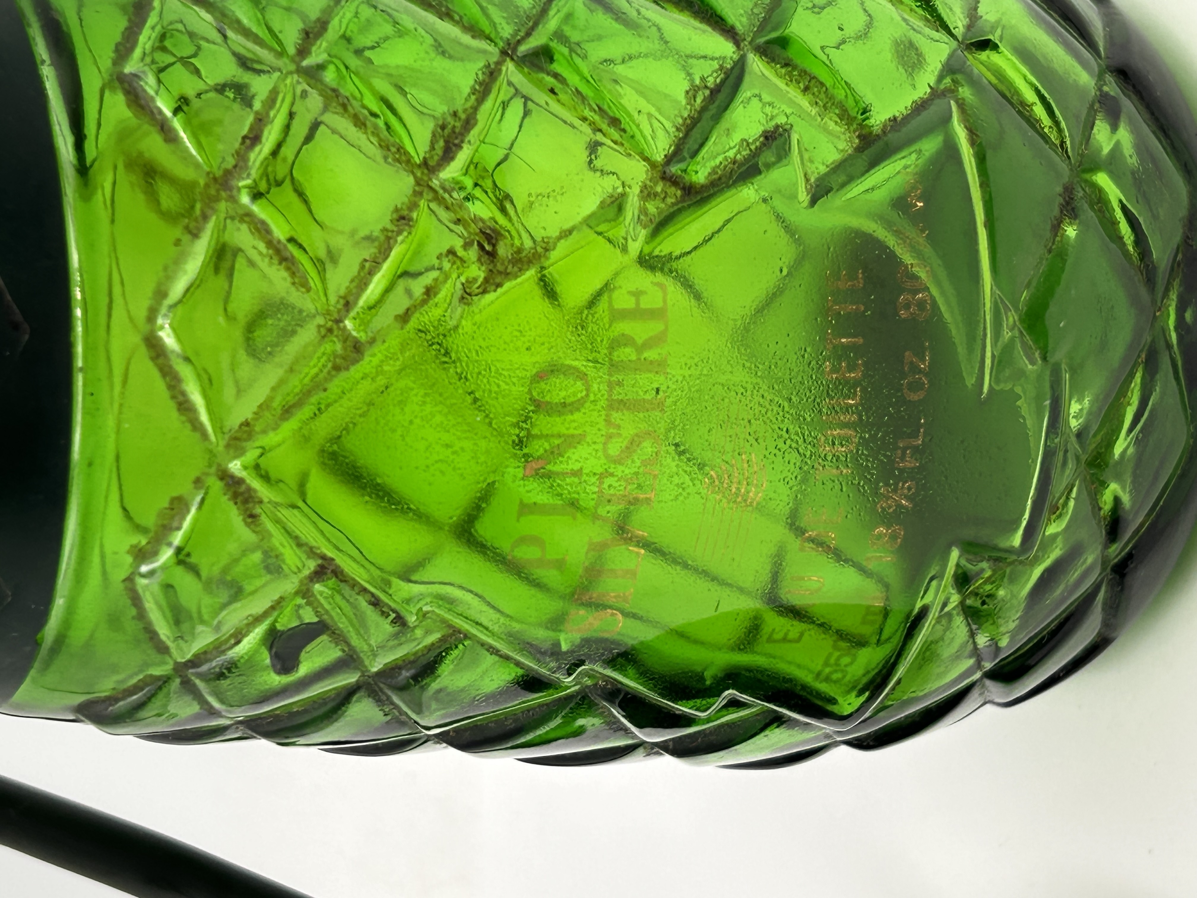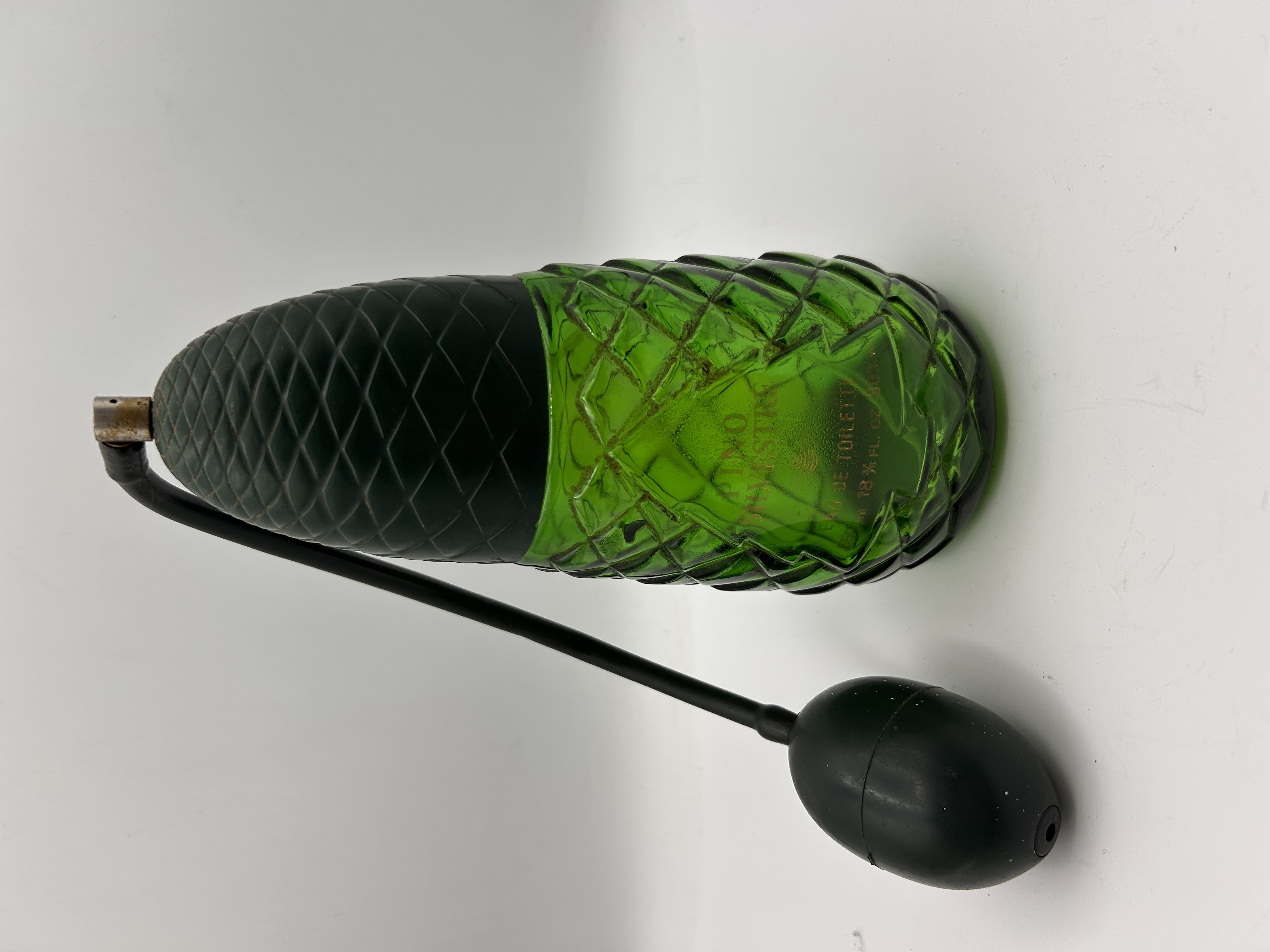 This is a single vintage Pino Silvestre Eau de Toilette atomizer bottle, recognized for its distinctive pine cone form. The body is constructed from emerald green molded glass featuring a diamond quilted pattern. The removable cap is made of dark green or black molded plastic, textured to resemble pine cone scales. The bottle retains its original black rubber atomizer bulb and tube, attached via a metal nozzle fitting. Gold-tone lettering applied directly to the glass identifies the product as PINO SILVESTRE EAU DE TOILETTE, and includes capacity details reading 13% FL. OZ. 80°. The fragrance is consistently marketed for men.