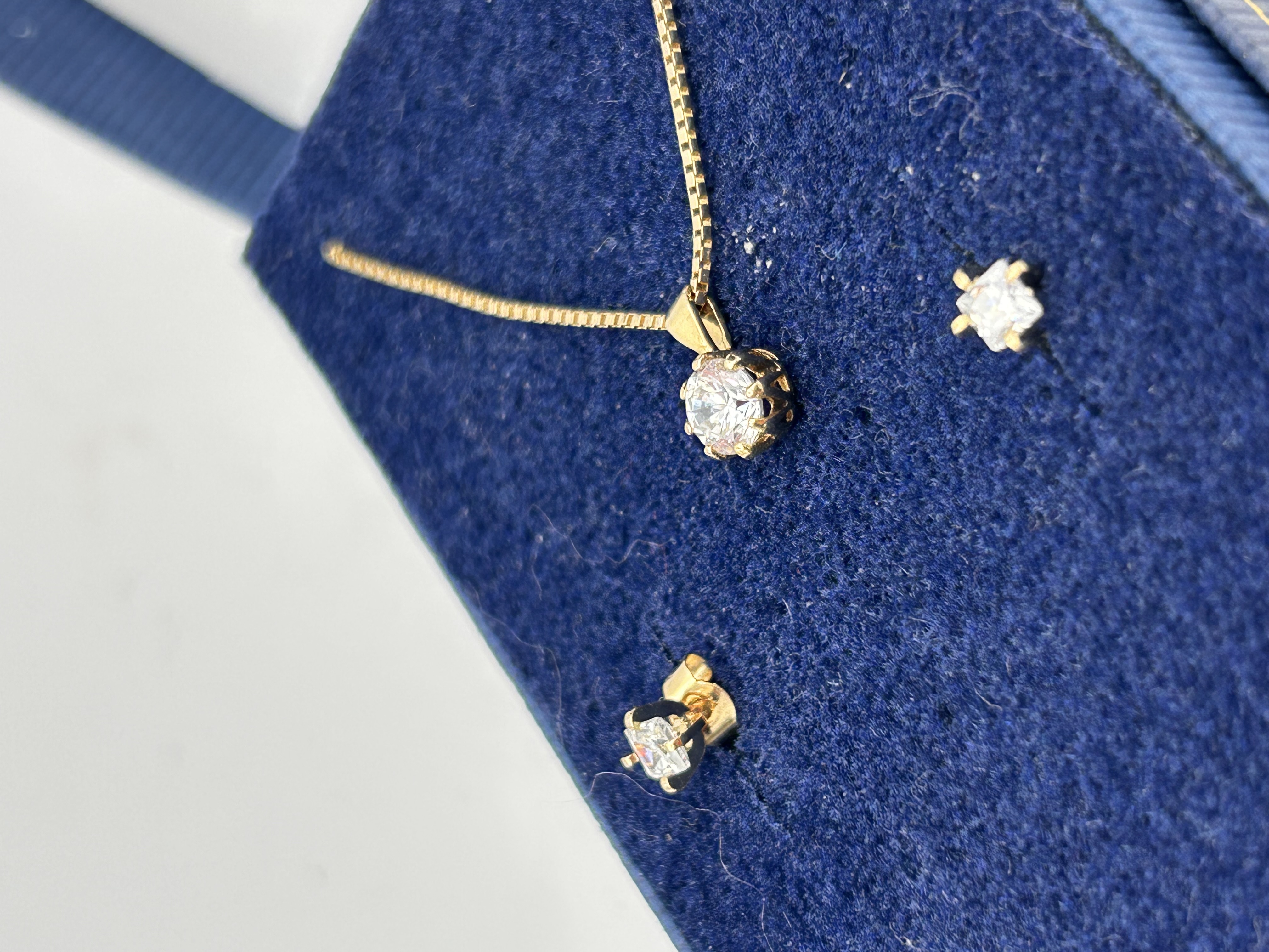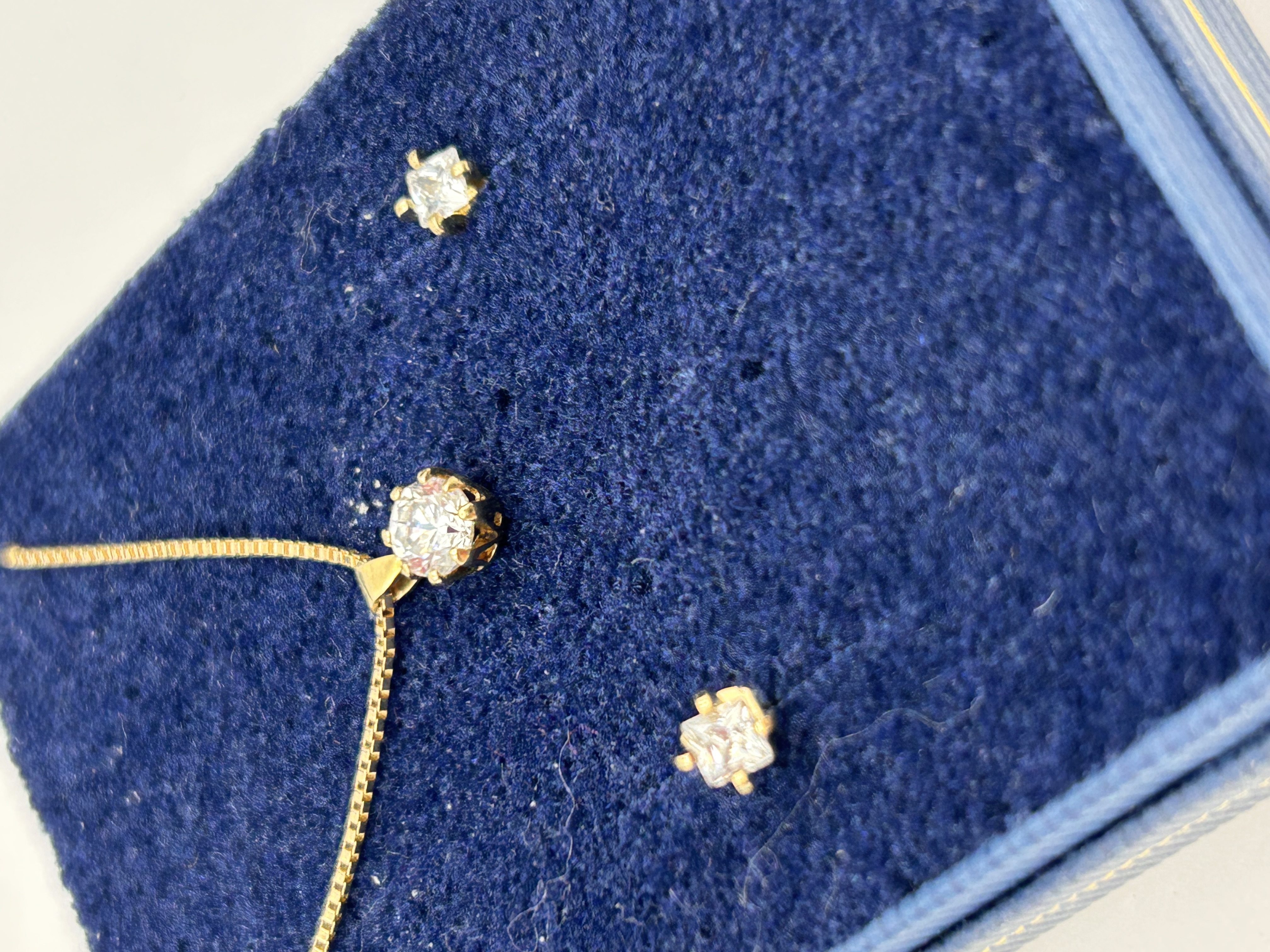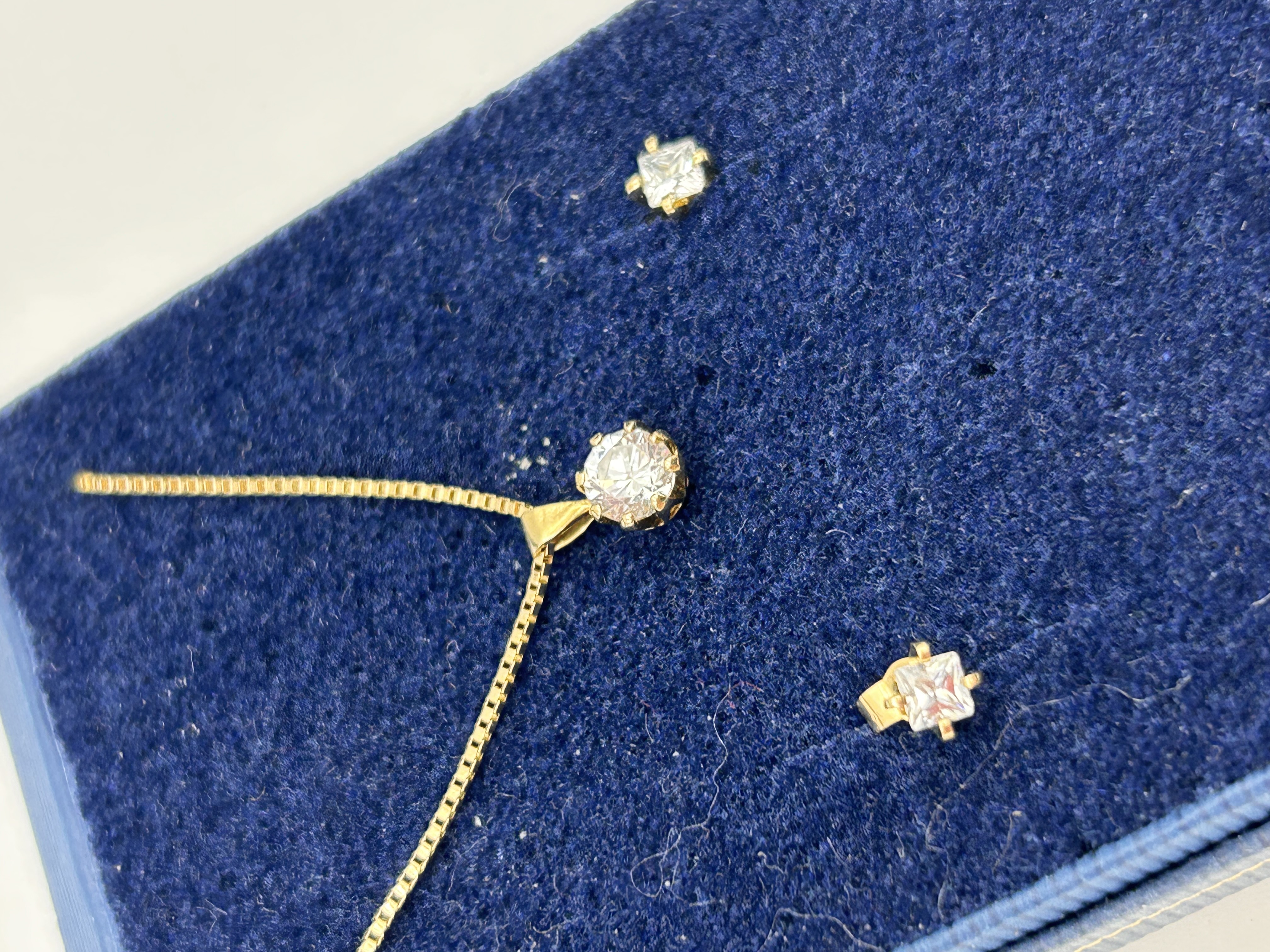 A three-piece jewelry ensemble comprising a necklace with a pendant and a pair of stud earrings. The metal is confirmed to be gold, finished with a yellow gold tone plating. The necklace features a fine box link chain attached to a pendant set with a single, round, brilliant-cut faceted stone secured by a six-prong solitaire setting. The accompanying stud earrings feature single clear faceted stones; one appears round-cut and the other square-cut, both secured in prong settings. No visible hallmarks or purity markings are present on the items. The total weight of the ensemble is 2.7g.