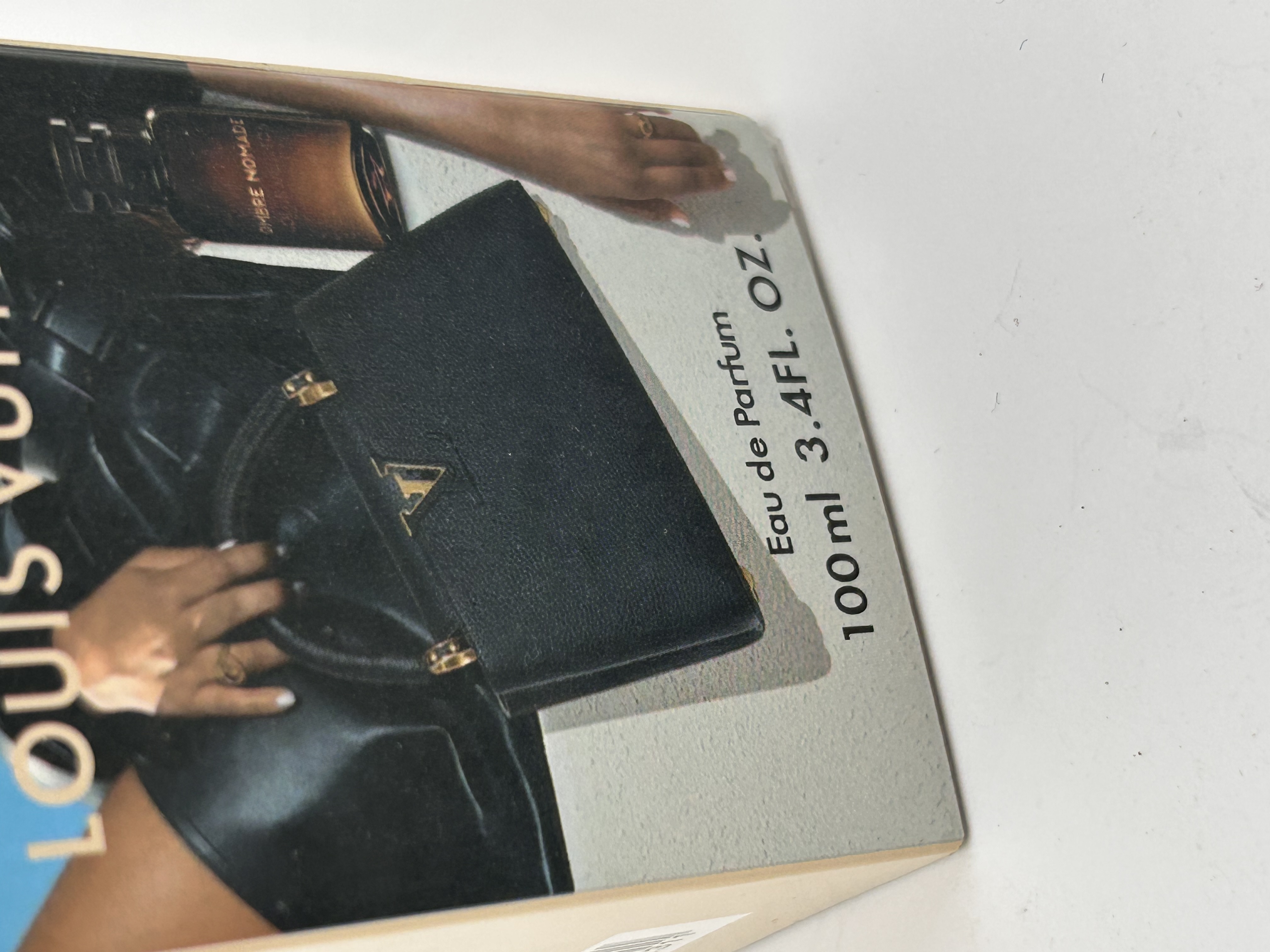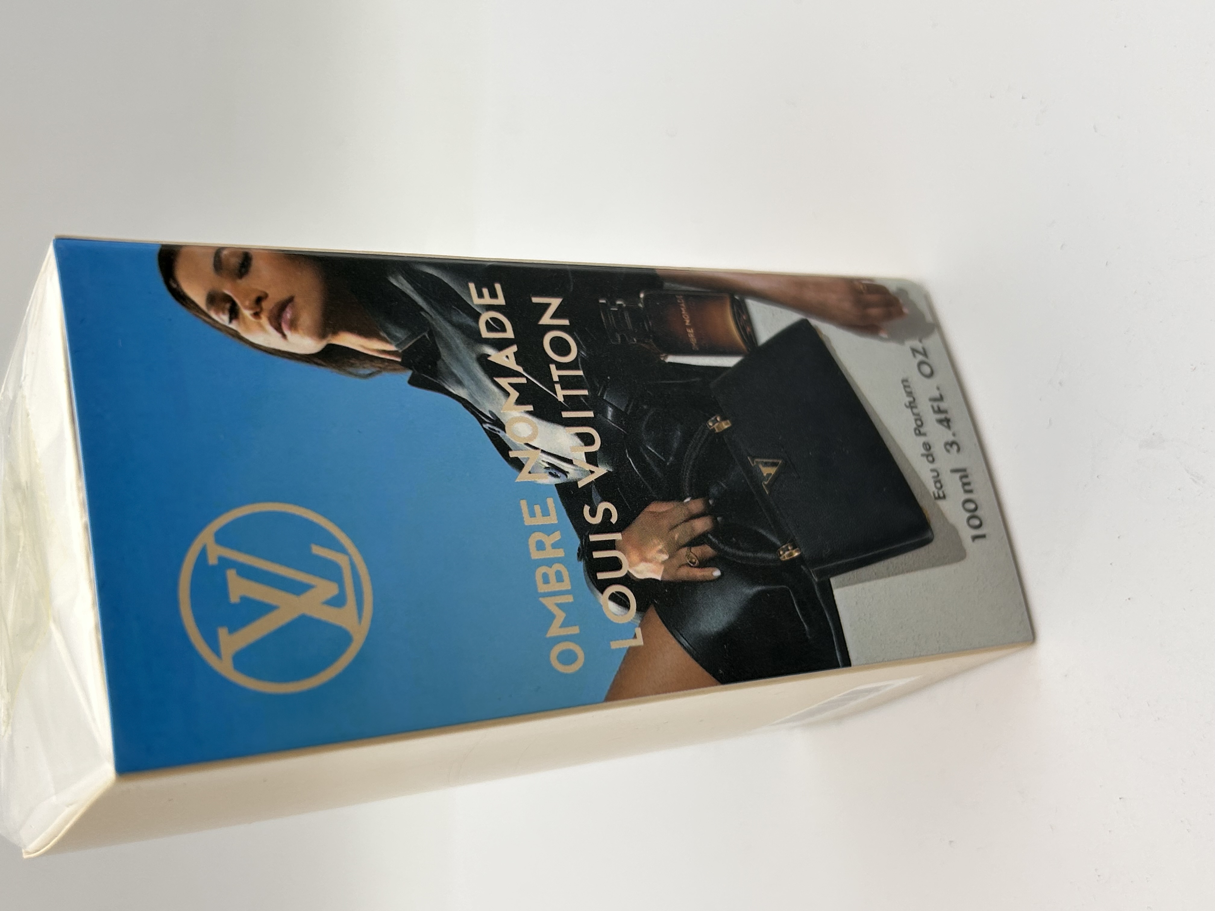 A single, contemporary, sealed retail box containing Louis Vuitton Ombre Nomade Eau de Parfum. The item is constructed of Silver, as confirmed by user-provided facts. The rectangular cardboard packaging features high-quality printed graphics, displaying the gold LV monogram logo over a bright blue background. The front panel includes a photographic image of a model holding a black Louis Vuitton handbag, with a bottle of the fragrance visible beside her. Key markings visible on the lower front panel confirm the product name and volume: “OMBRE NOMADE,” “LOUIS VUITTON,” “Eau de Parfum,” and “100 ml 3.4 FL. OZ.” This fragrance is widely recognized in the market as a unisex scent, often associated with oud notes.