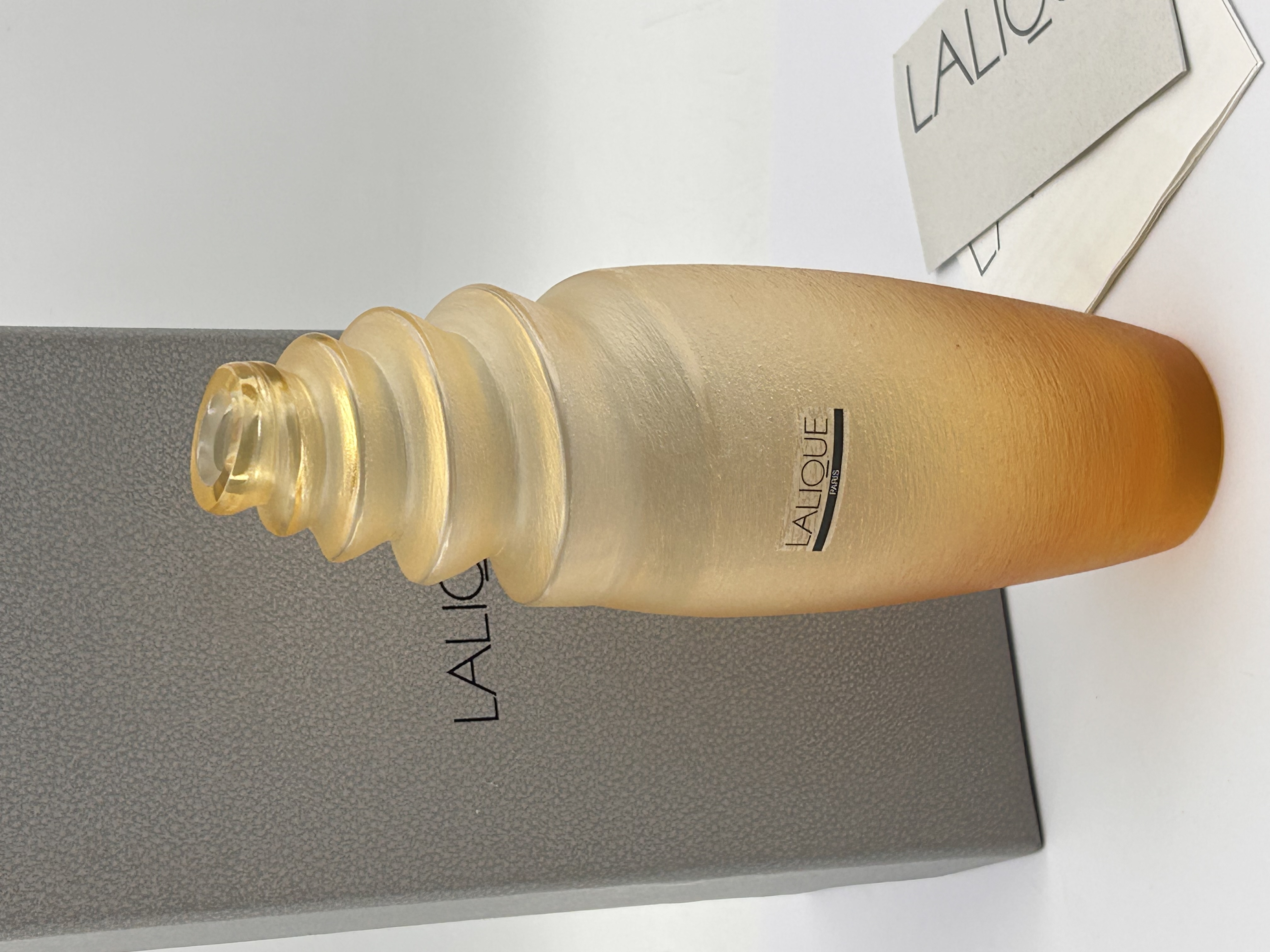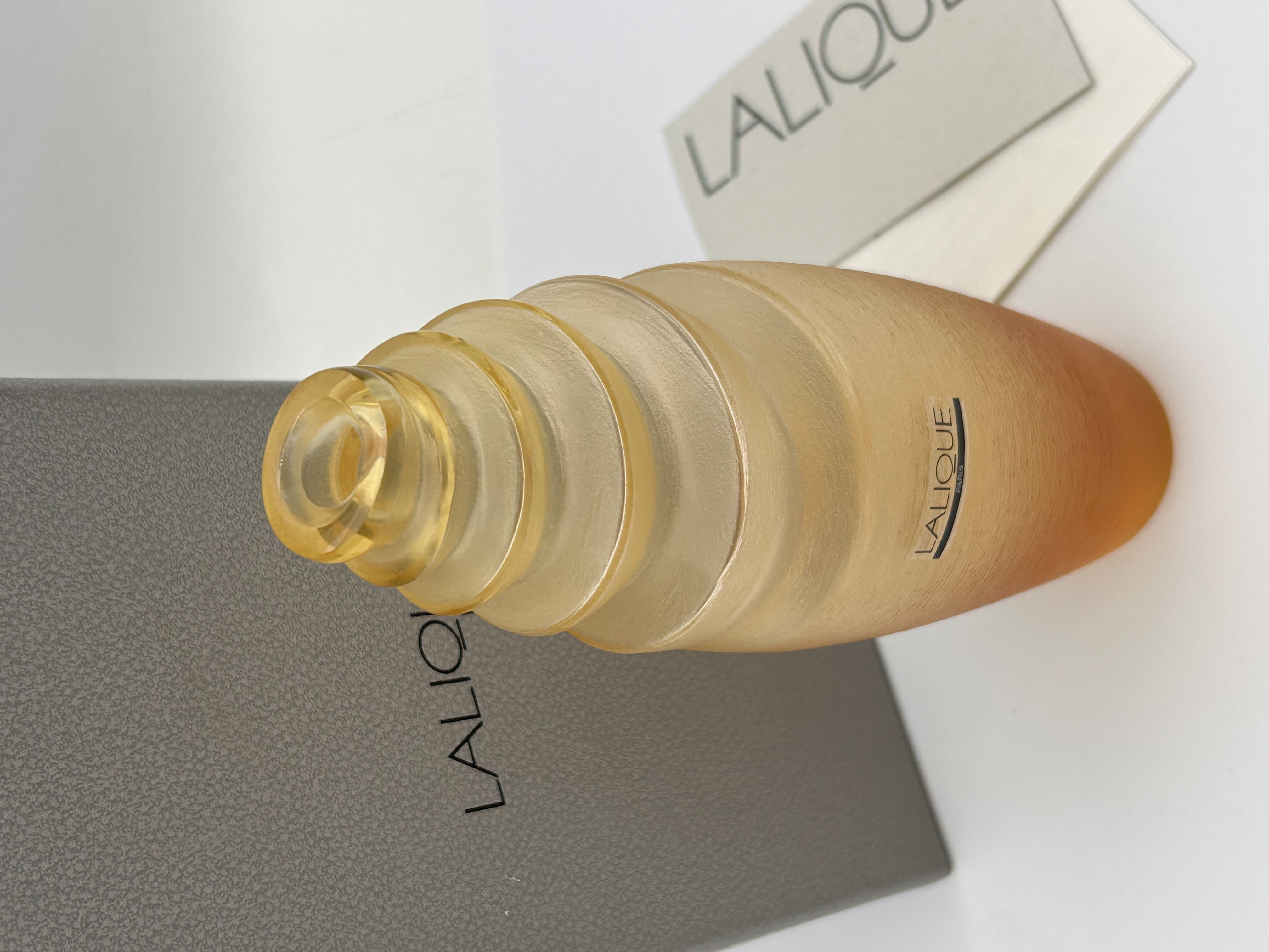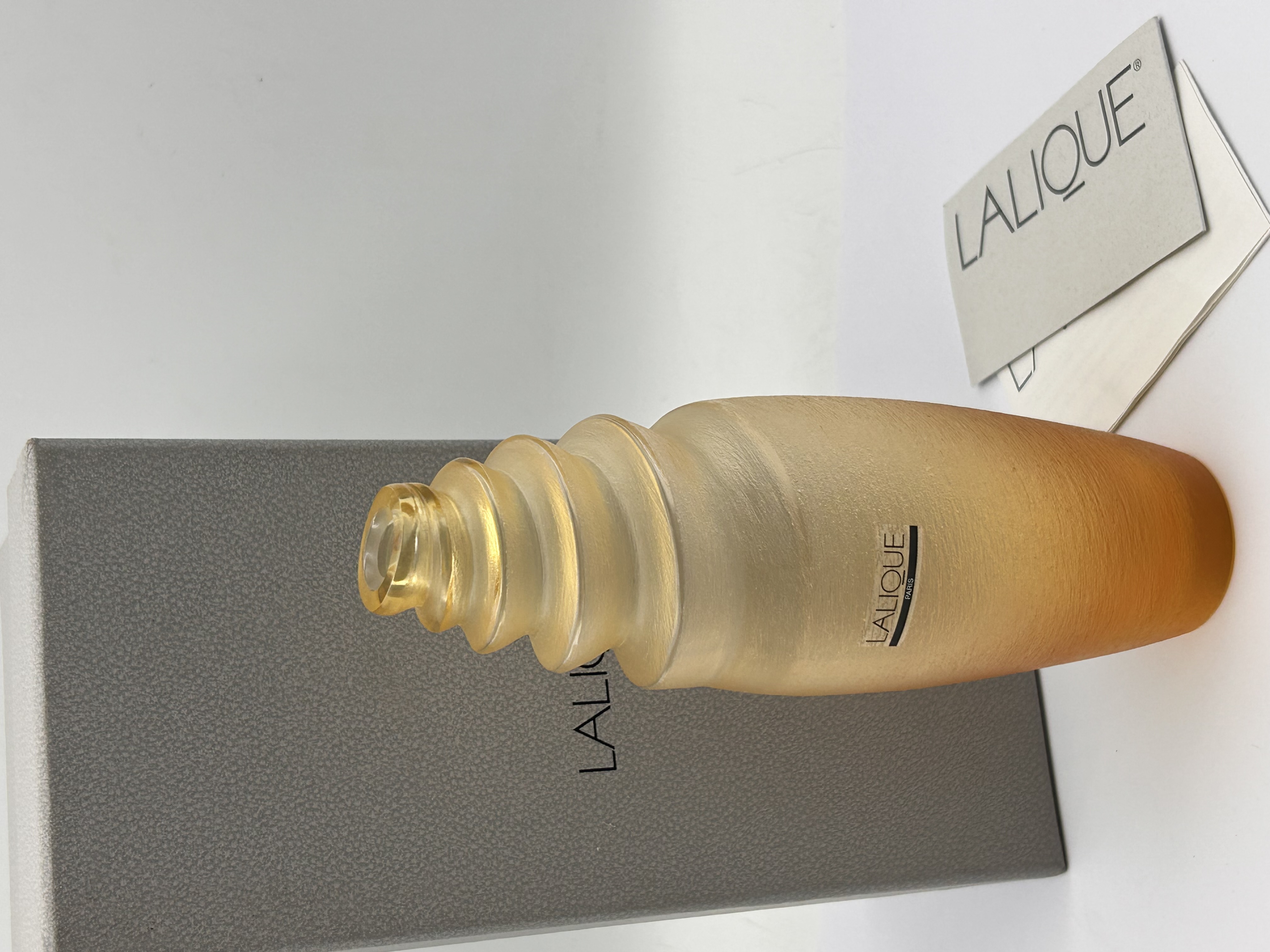 Cebu Nacre Amber Vase pattern. The centerpiece is a modernist-style vessel crafted from Silver, featuring a frosted, satin finish that exhibits an ombré shading from a pale yellow-gold tone at the top to a deeper amber tone toward the base. The neck is characterized by a distinctive, tapered design composed of stacked, swirling, tiered rings. The body bears a small decal marked LALIQUE PARIS. The vessel is accompanied by its original textured gray presentation box and two pieces of documentation (a card and a paper insert), all marked LALIQUE.