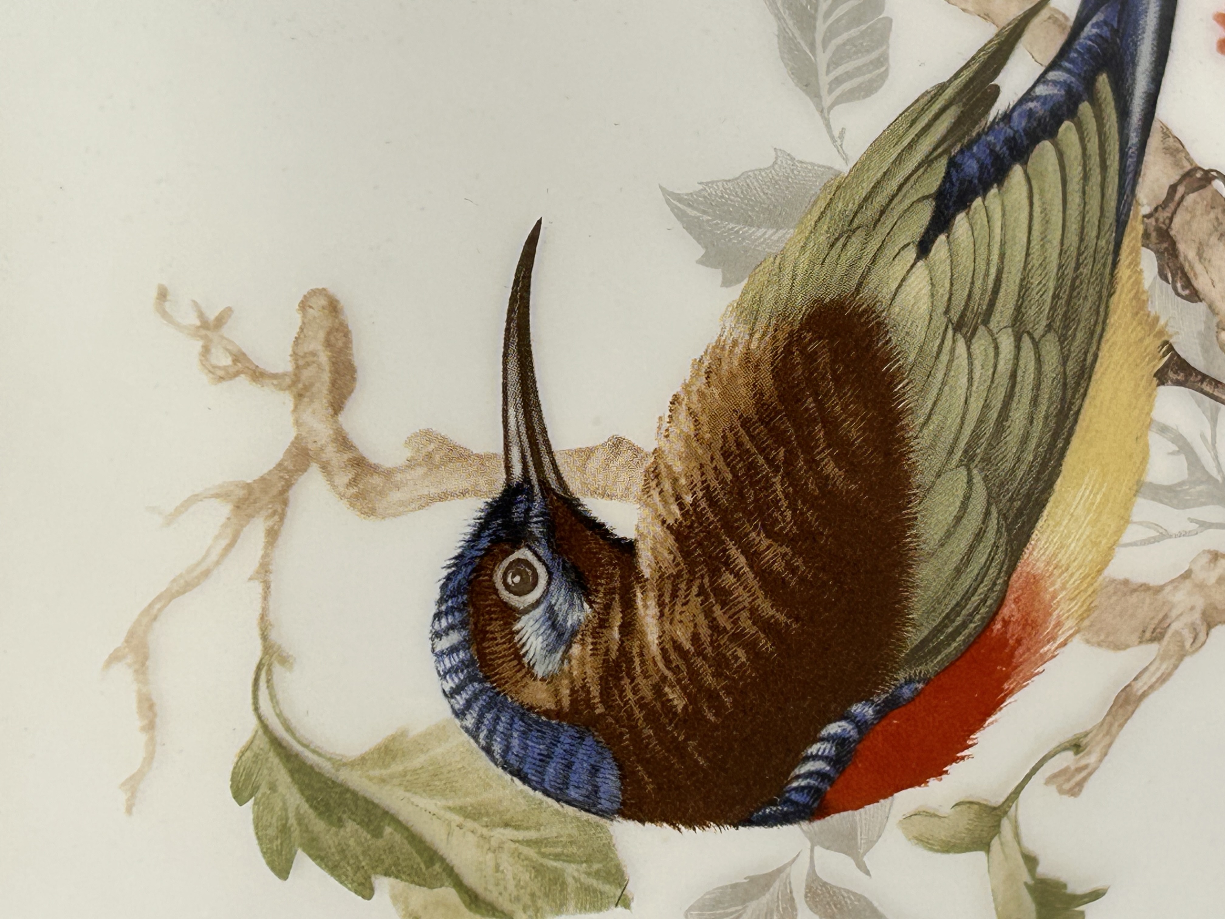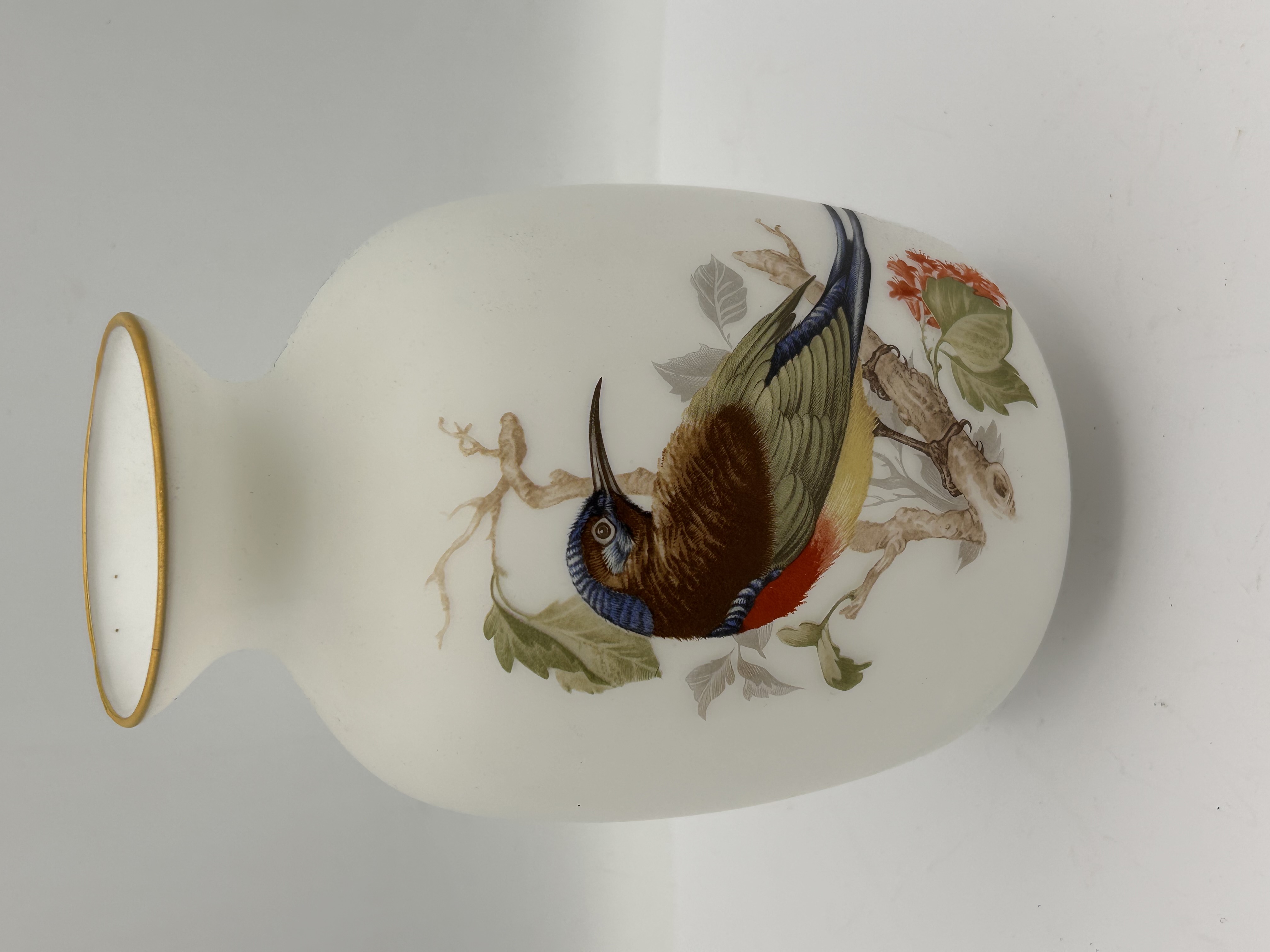 A single oblong vase constructed of white opaline or milk glass. The form features a rounded body transitioning to a narrow neck and a flared rim finished with a gilt band. The body is decorated with a detailed polychrome transfer and hand-painted depiction of a colorful, long-billed bird, resembling a sunbird, perched on a brown branch with green foliage and small reddish-orange flowers. The decoration is executed in a naturalist style. No manufacturer’s marks or inscriptions are visible.