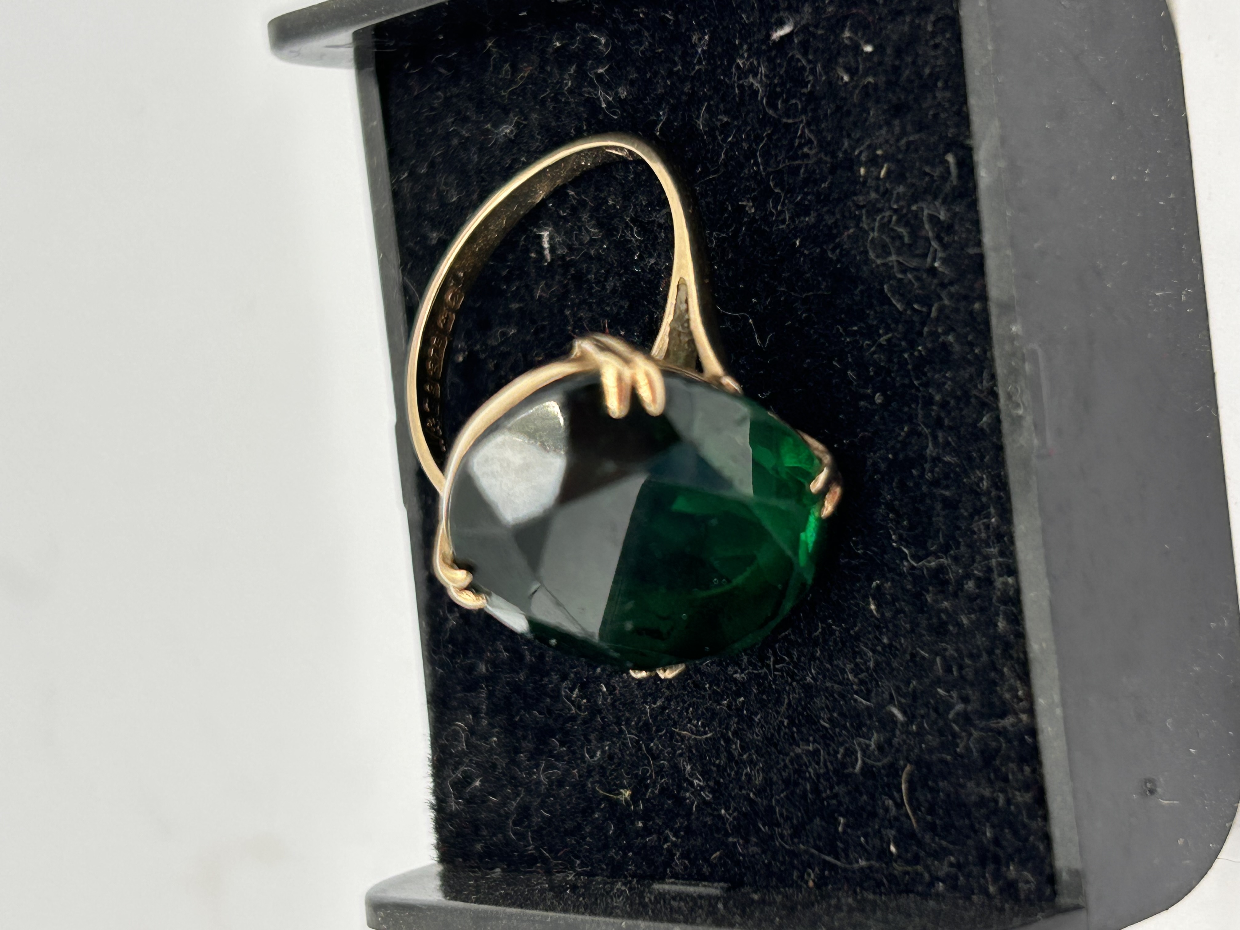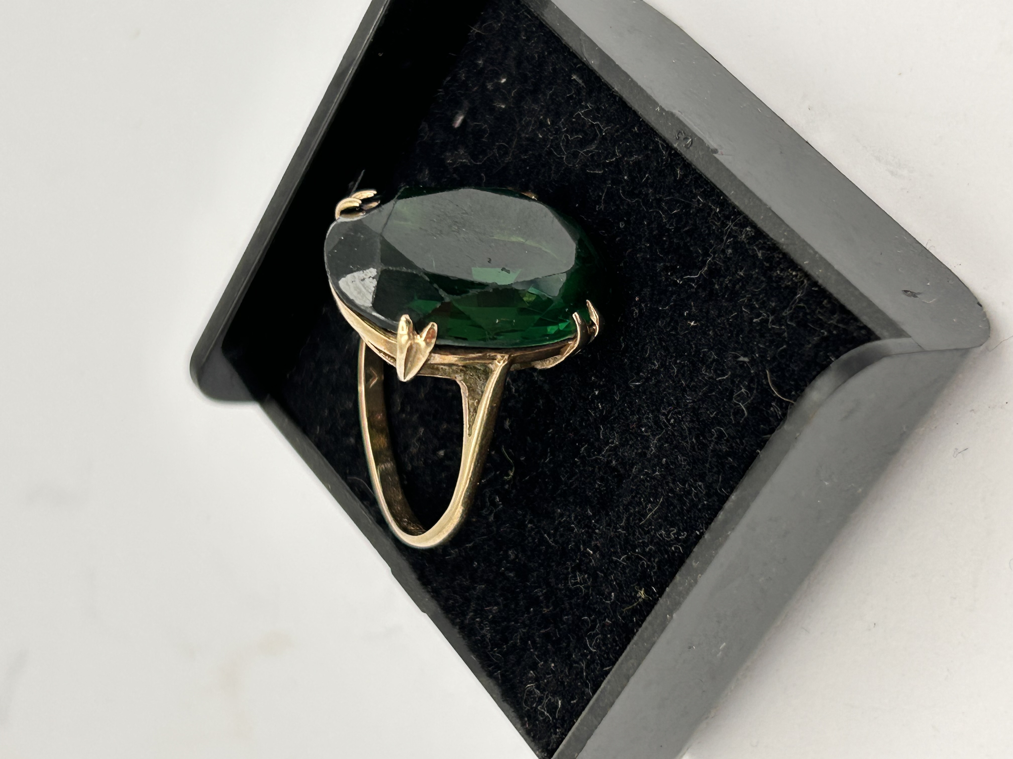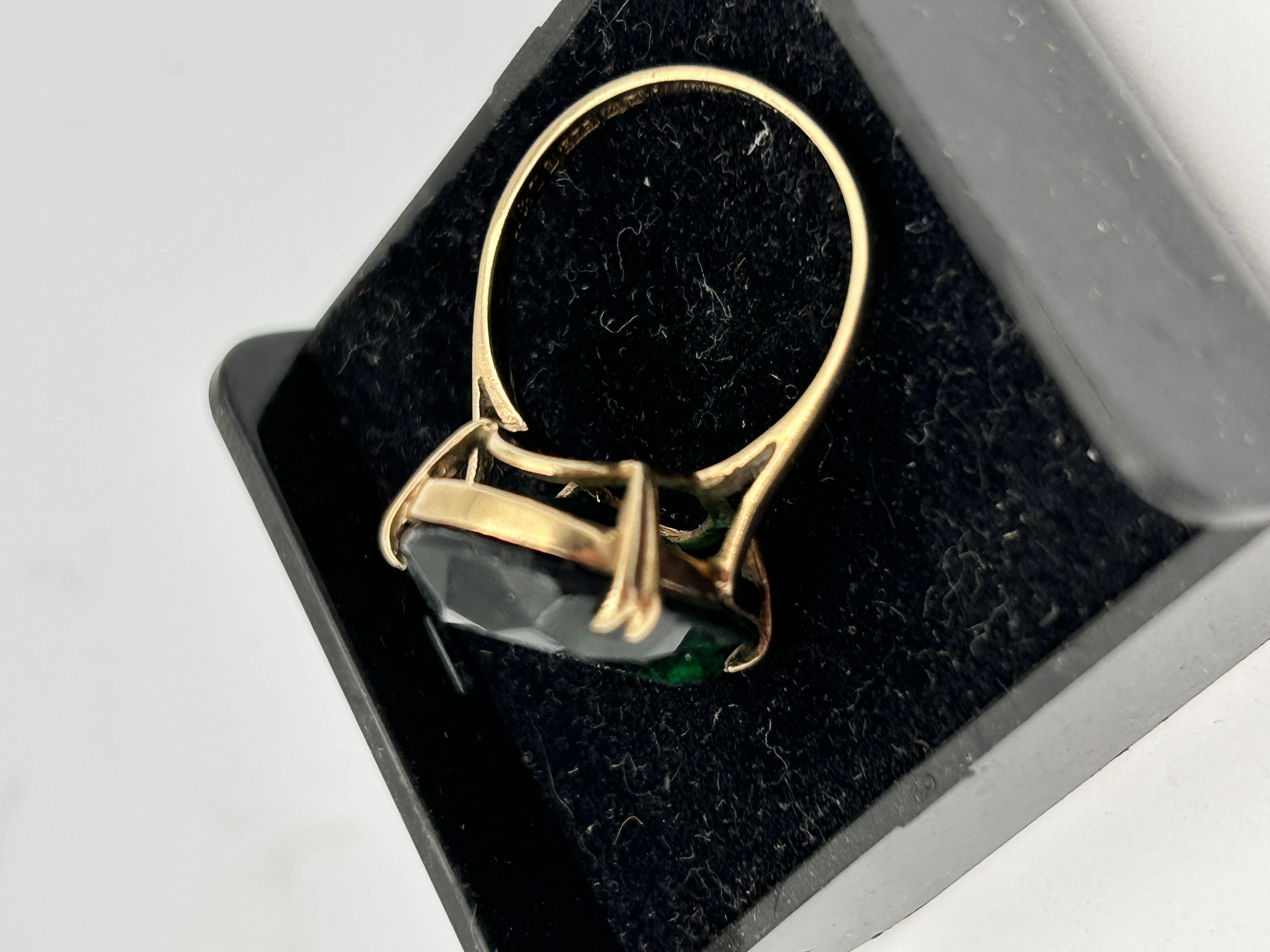 A substantial cocktail-style finger ring constructed of Gold, likely 9ct based on user-provided keywords and market context. The ring features a large, deeply colored emerald green stone, consistent with a Created Emerald or Soude Emerald as suggested by web research. The stone is cut in a cushion or oval facet and is secured by four substantial prongs in a tall, open basket setting. The shank is relatively thin and exhibits faint, illegible markings or hallmarks on the interior surface. The overall weight of the piece is approximately 6g.