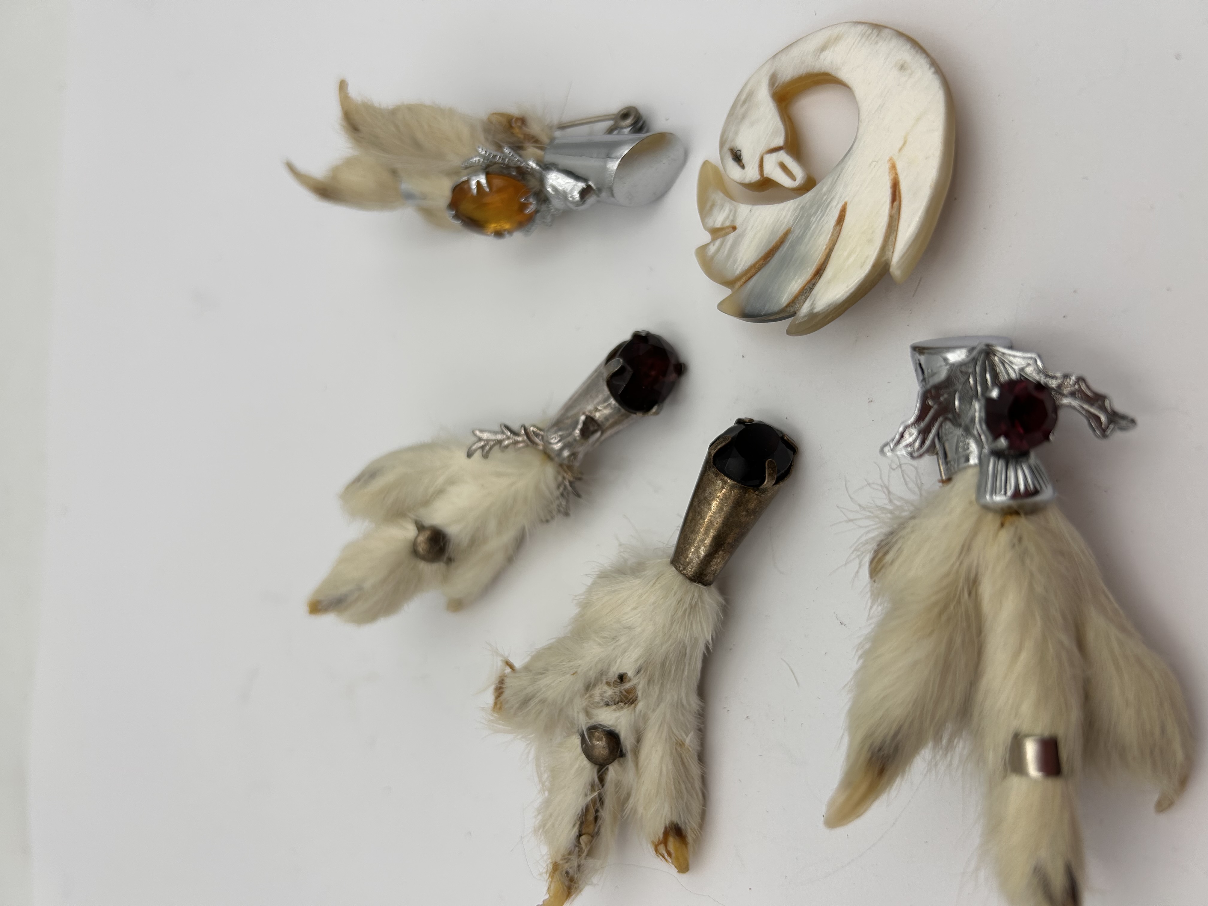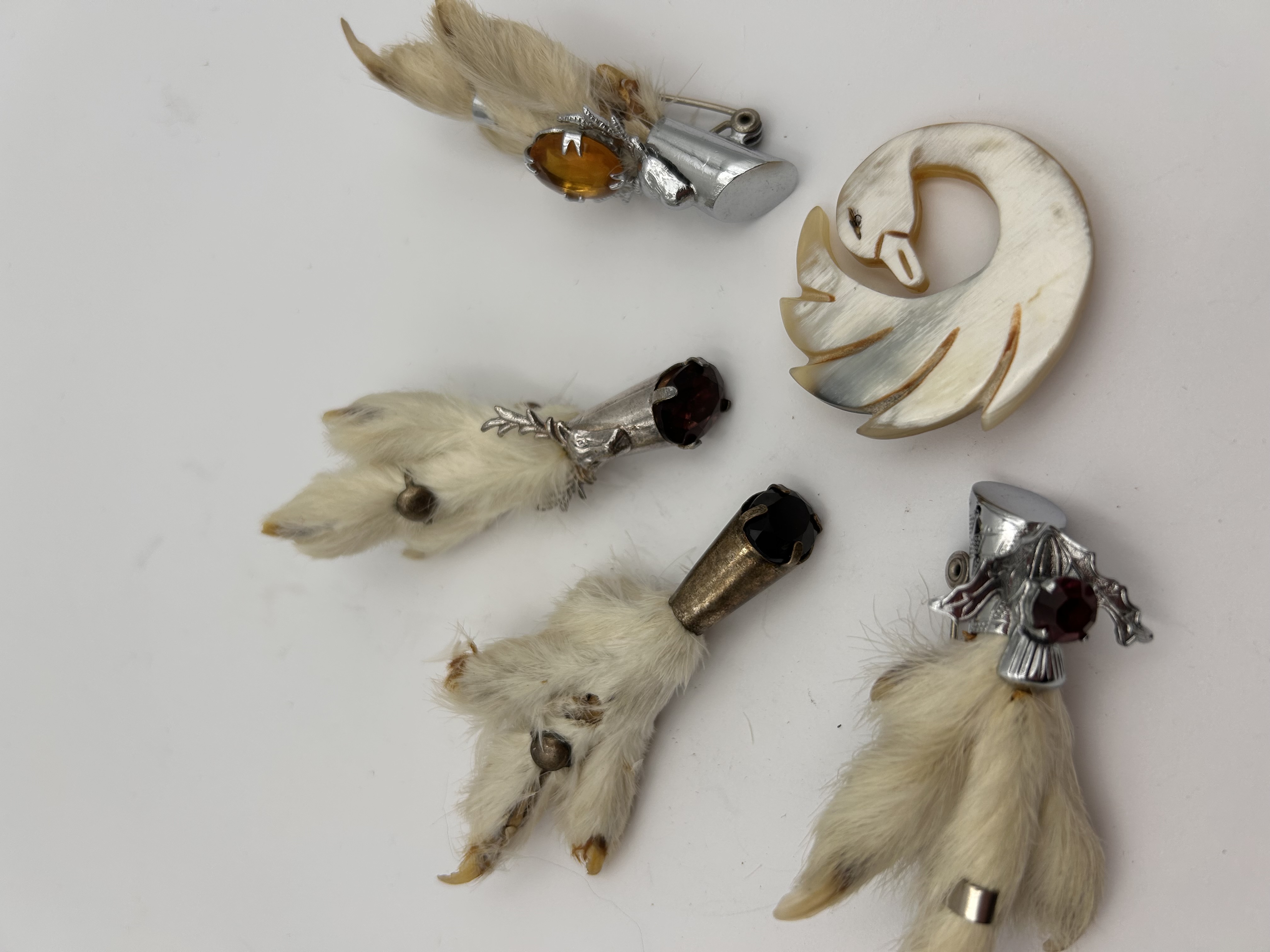 The lot consists of a collection of five vintage mixed jewelry items, including four Scottish-style taxidermy grouse foot brooches and one figural carved brooch. The four taxidermy brooches feature natural fur and claws, consistent with the traditional ‘lucky’ grouse foot design often associated with Scottish kilt pins. The metal fittings vary: one brooch features a brass or bronze-toned cap, while the remaining three utilize silver-toned metal caps. These caps are accented with colored glass or simulated gemstones in dark red and orange/amber hues. The fifth item is a stylized figural brooch carved in the shape of a swan. This piece is crafted from an iridescent, striated natural material, likely horn or shell, displaying creamy white and light brown coloration. No manufacturer markings or hallmarks are visible on any of the pieces.