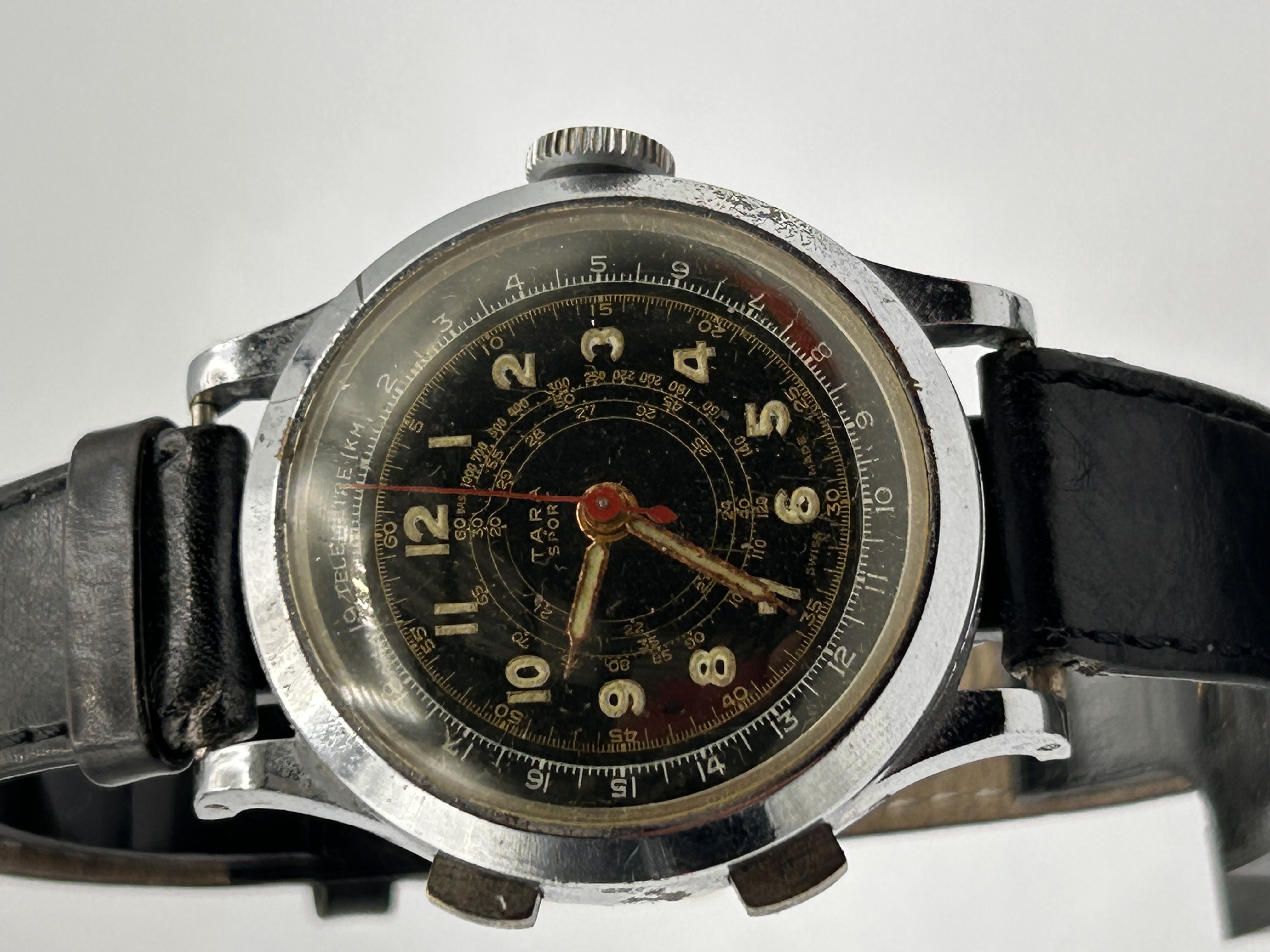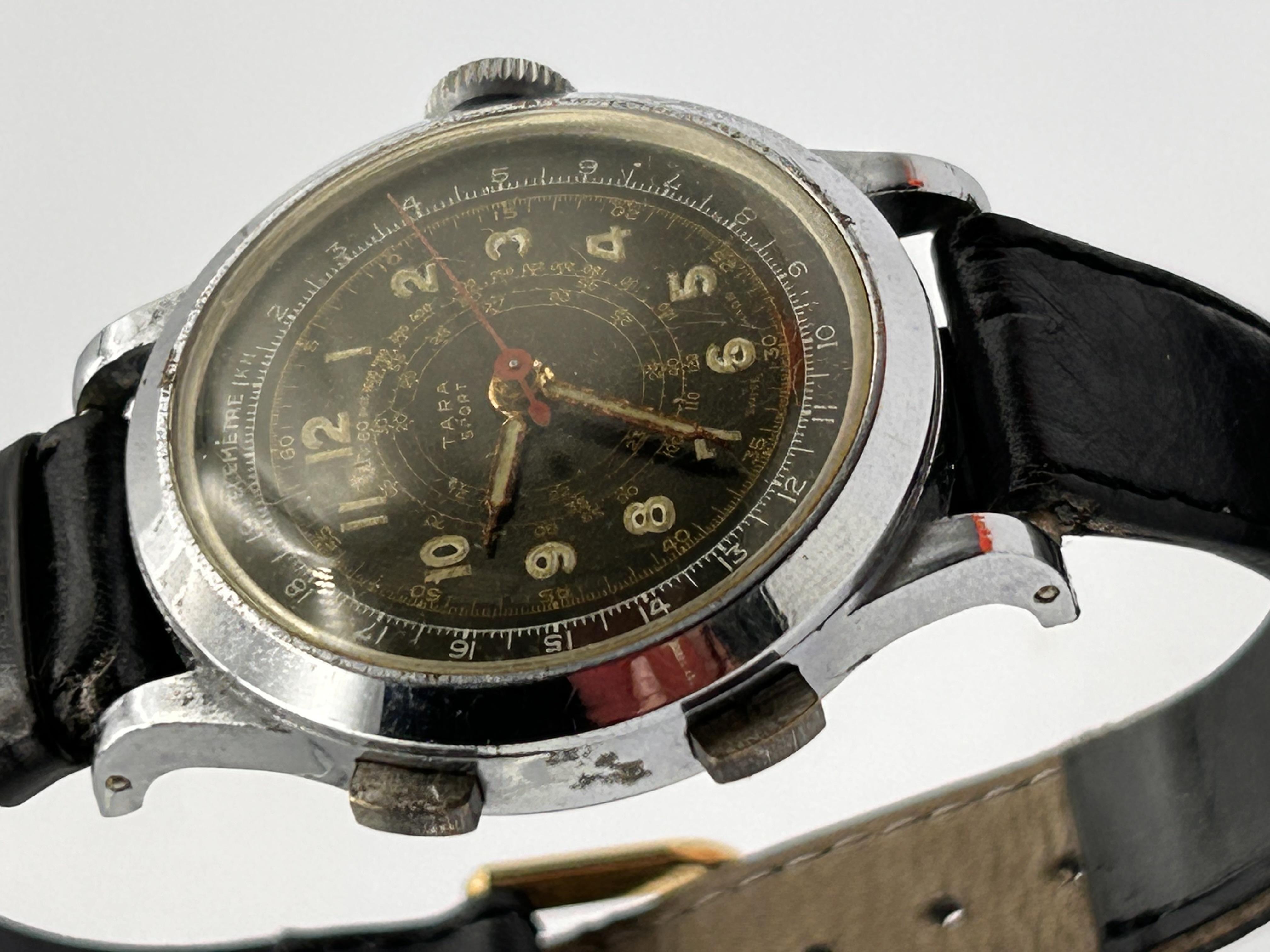 A vintage Tara Sport Military-Style Telemeter Chronograph wristwatch. The watch features a round, black dial marked “TARA SPORT” and “SWISS MADE.” The dial displays luminous Arabic hour markers, skeletonized gilt-tone hour and minute hands, and a central red seconds hand. The face is complicated by multiple concentric scales, including a prominent outer track marked “TÉLÉMÈTRE 1 KM.” The movement is operated via two external pushers located on the left side of the case and a winding crown on the right. The watch is housed in a base metal or chrome-plated case and secured by a black leather strap.