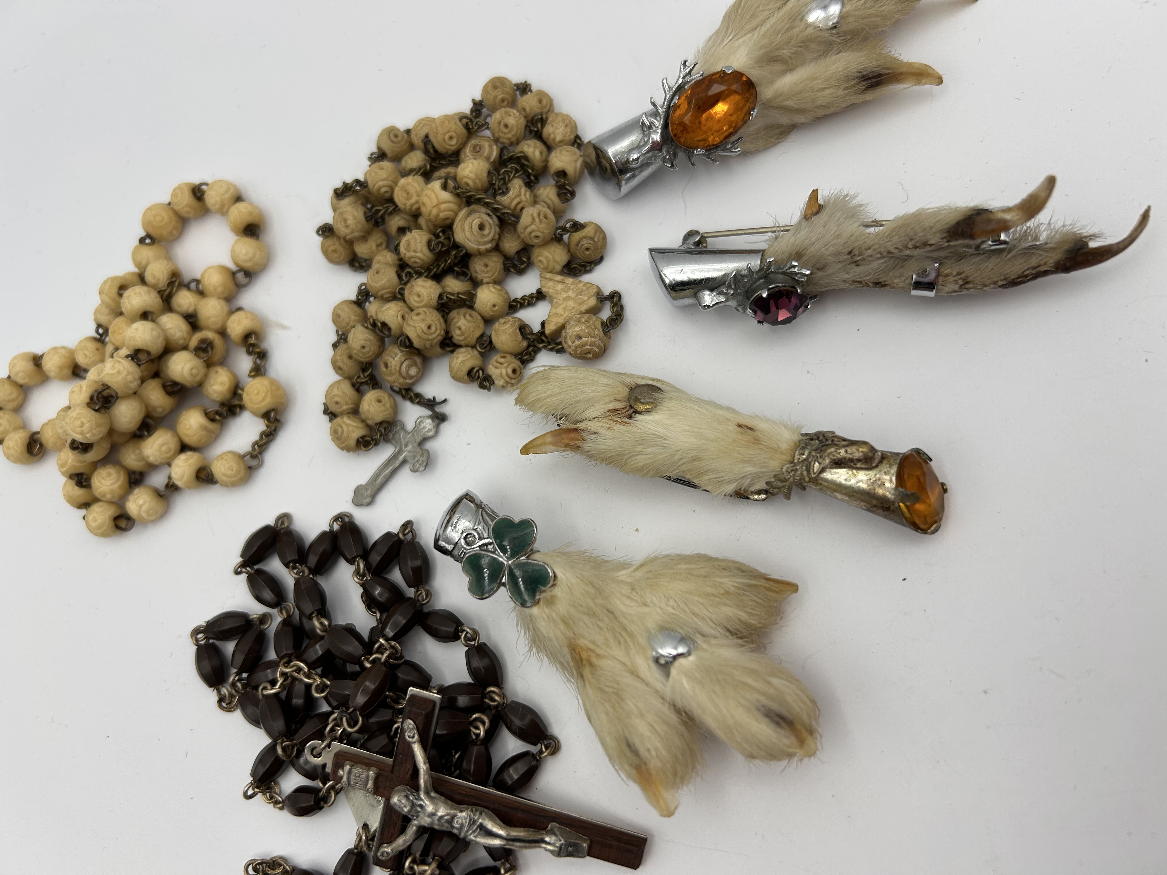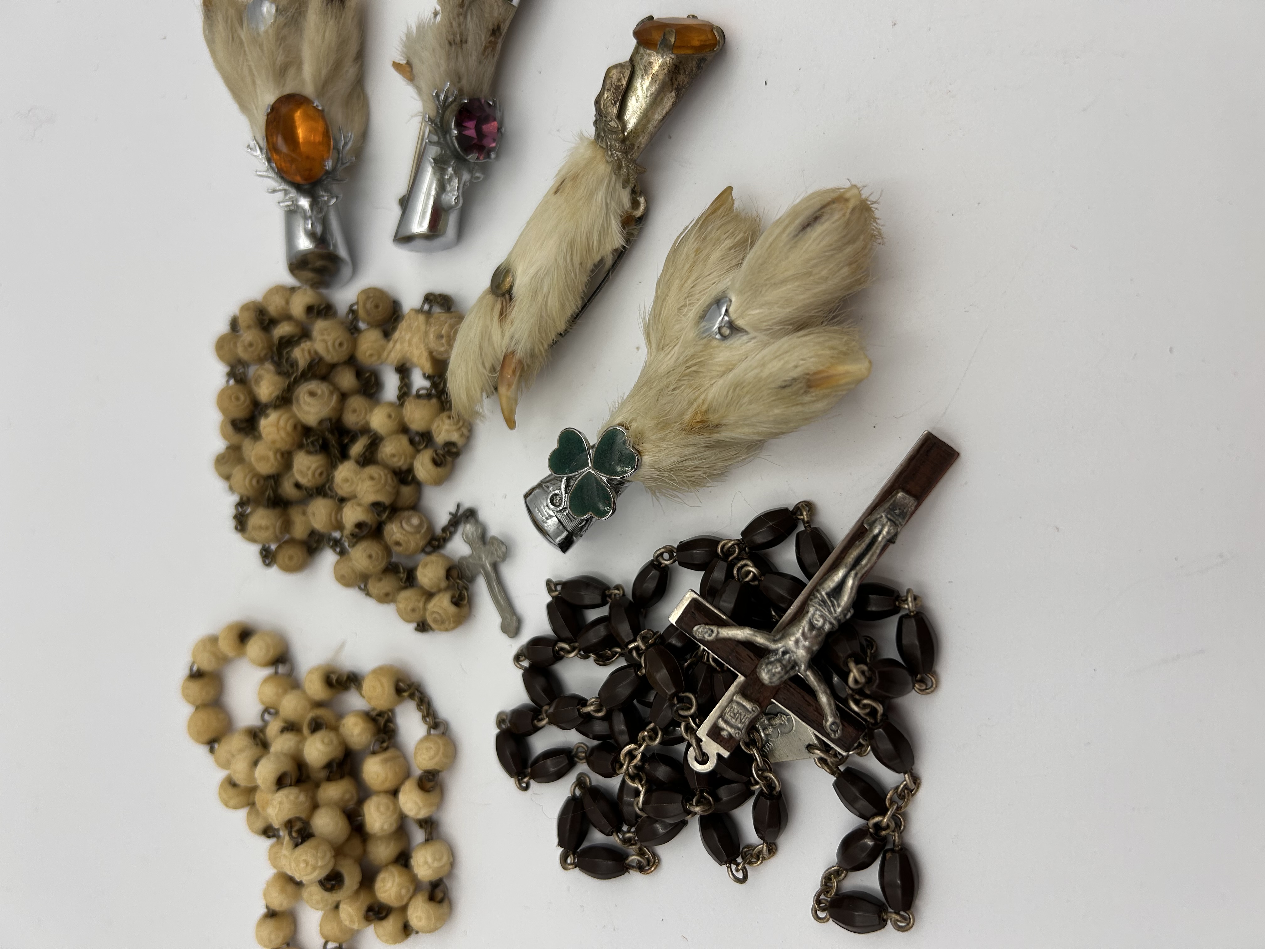 A collection of eight vintage items comprising three rosaries, one detached crucifix, and four rabbit’s foot lucky charms.