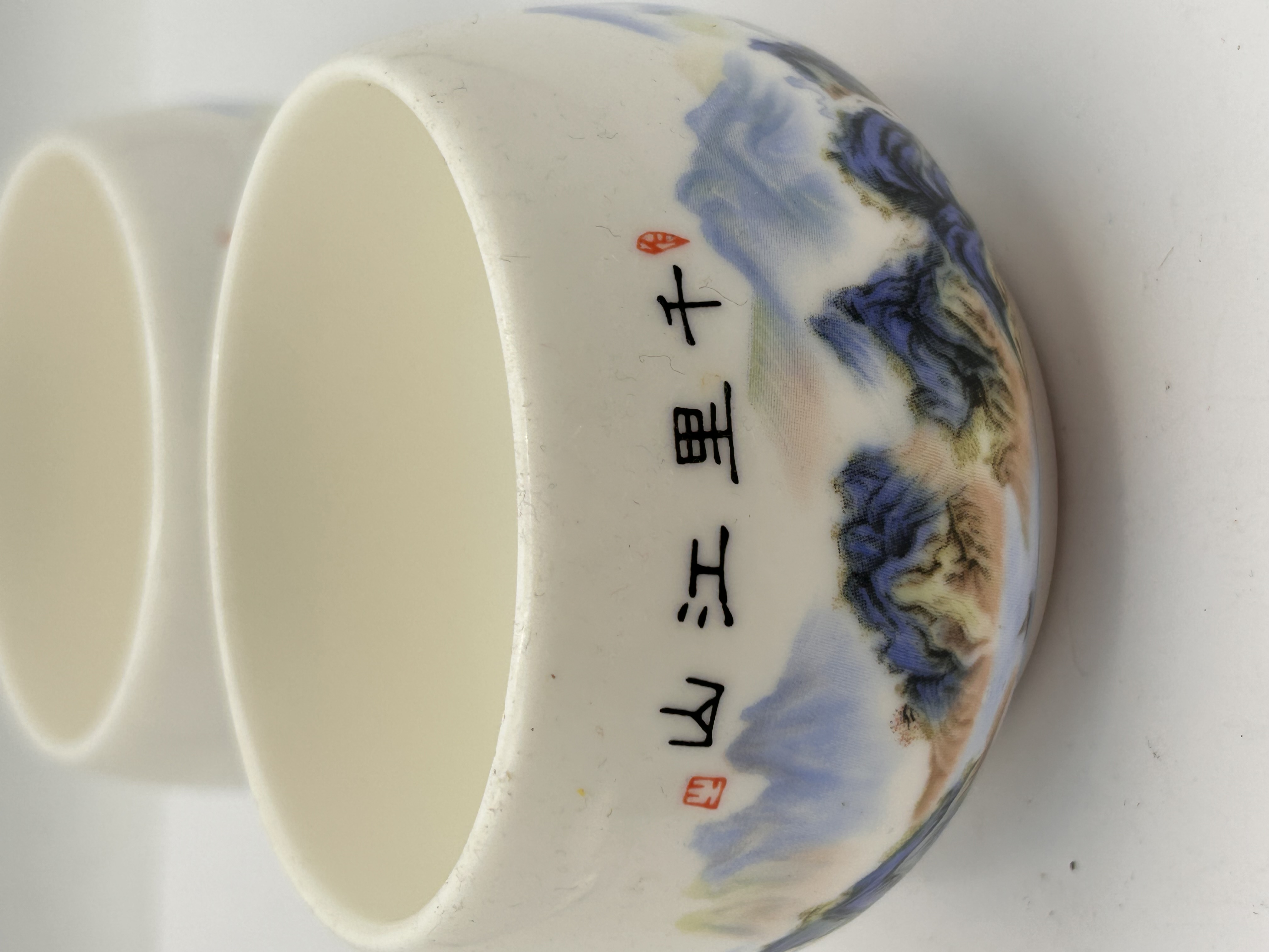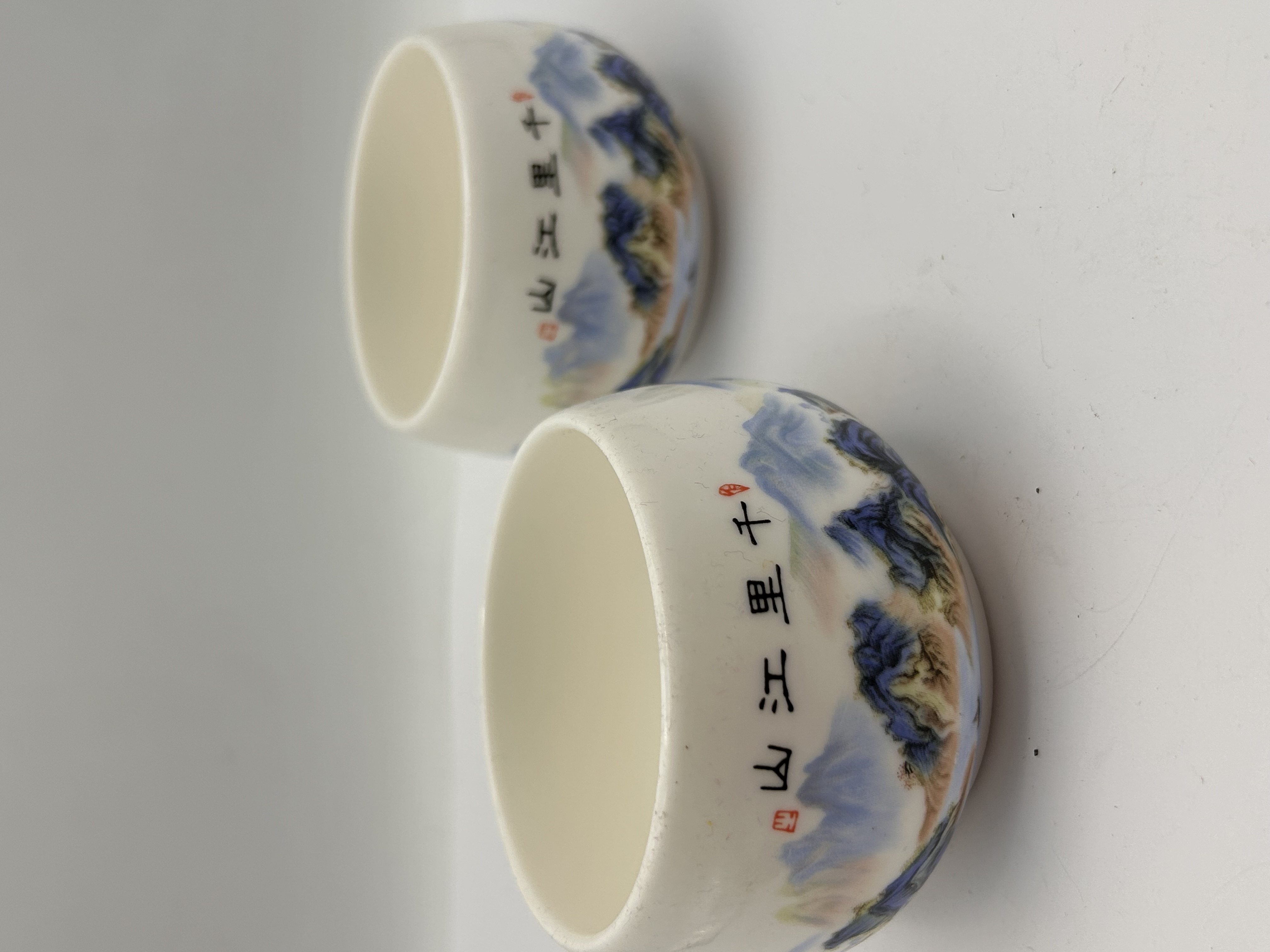 A pair of small, handleless Chinese tea cups (likely intended for tea or liquor), crafted from white porcelain, often identified in the market as ‘Jade White Porcelain’ due to its smooth finish. The exterior of each cup is decorated with a continuous, hand-painted polychrome traditional Chinese landscape scene in the shan shui style. The decoration features mountains rendered primarily in shades of blue, indigo, and green, accented by lighter ochre tones, set against the white porcelain ground. Above the landscape band, black calligraphic text reads 千里江山 (Qiānlǐ Jiāngshān), which translates to “A Thousand Miles of Rivers and Mountains,” accompanied by small red seal marks. The interiors of the cups are finished with a glossy white glaze.