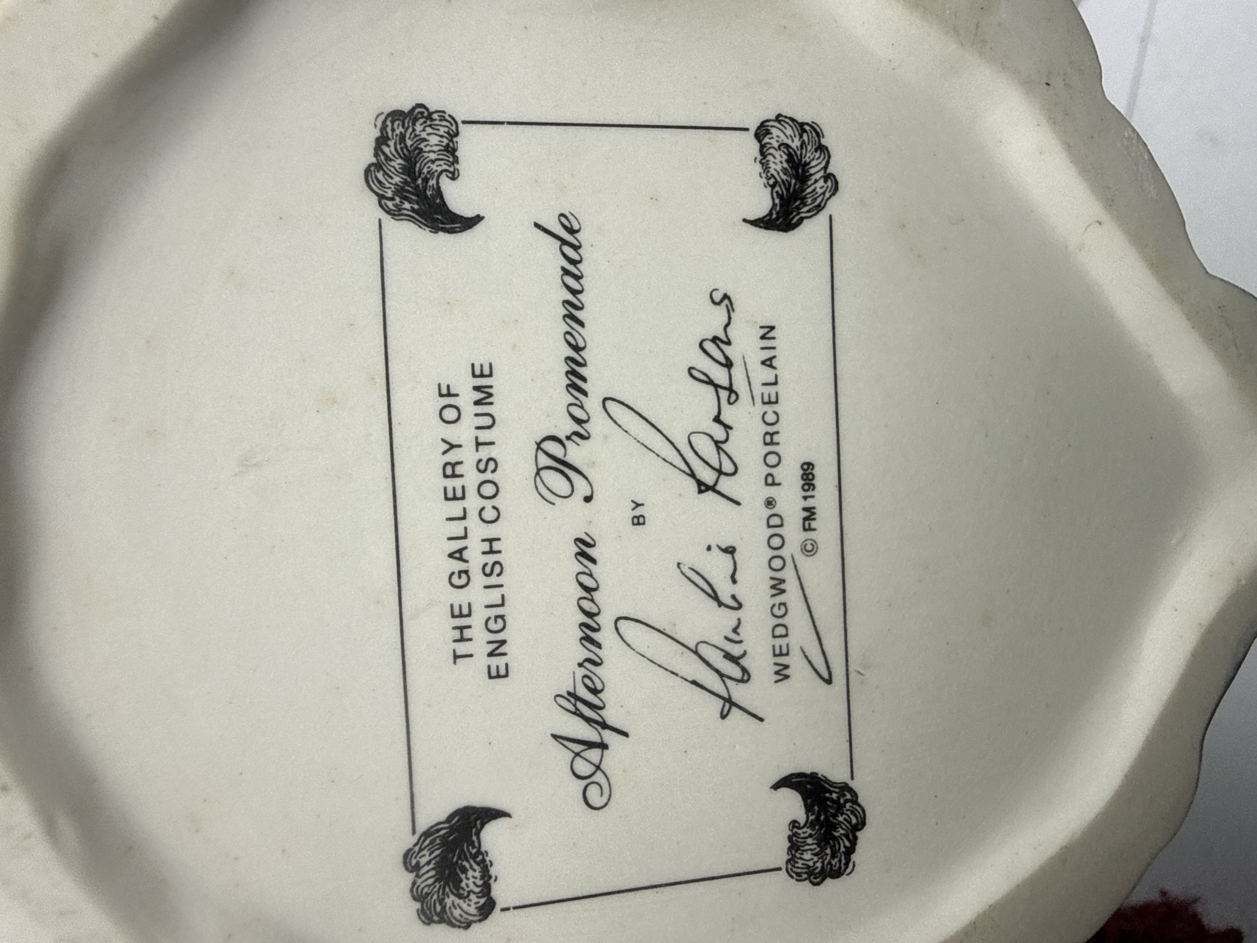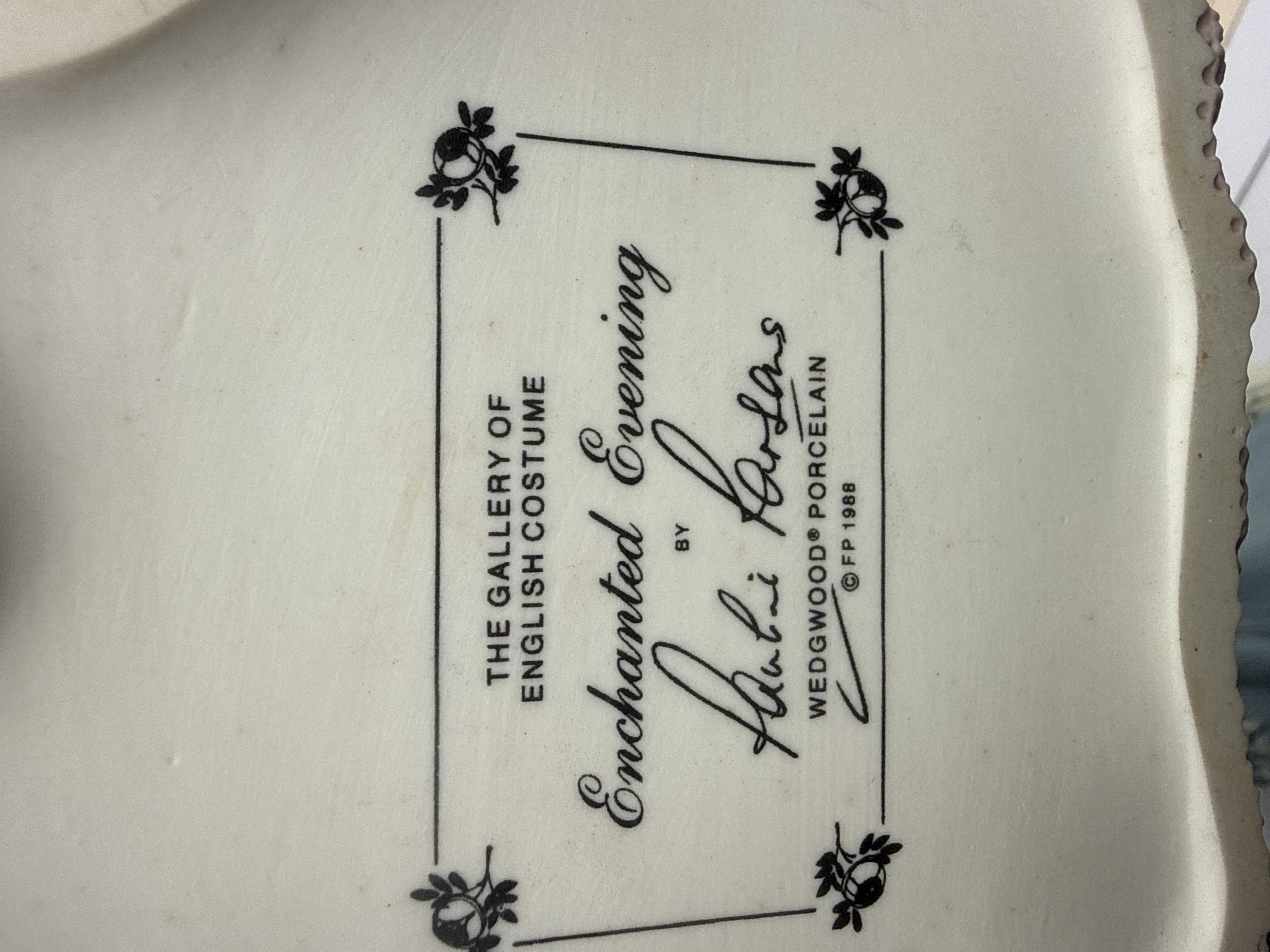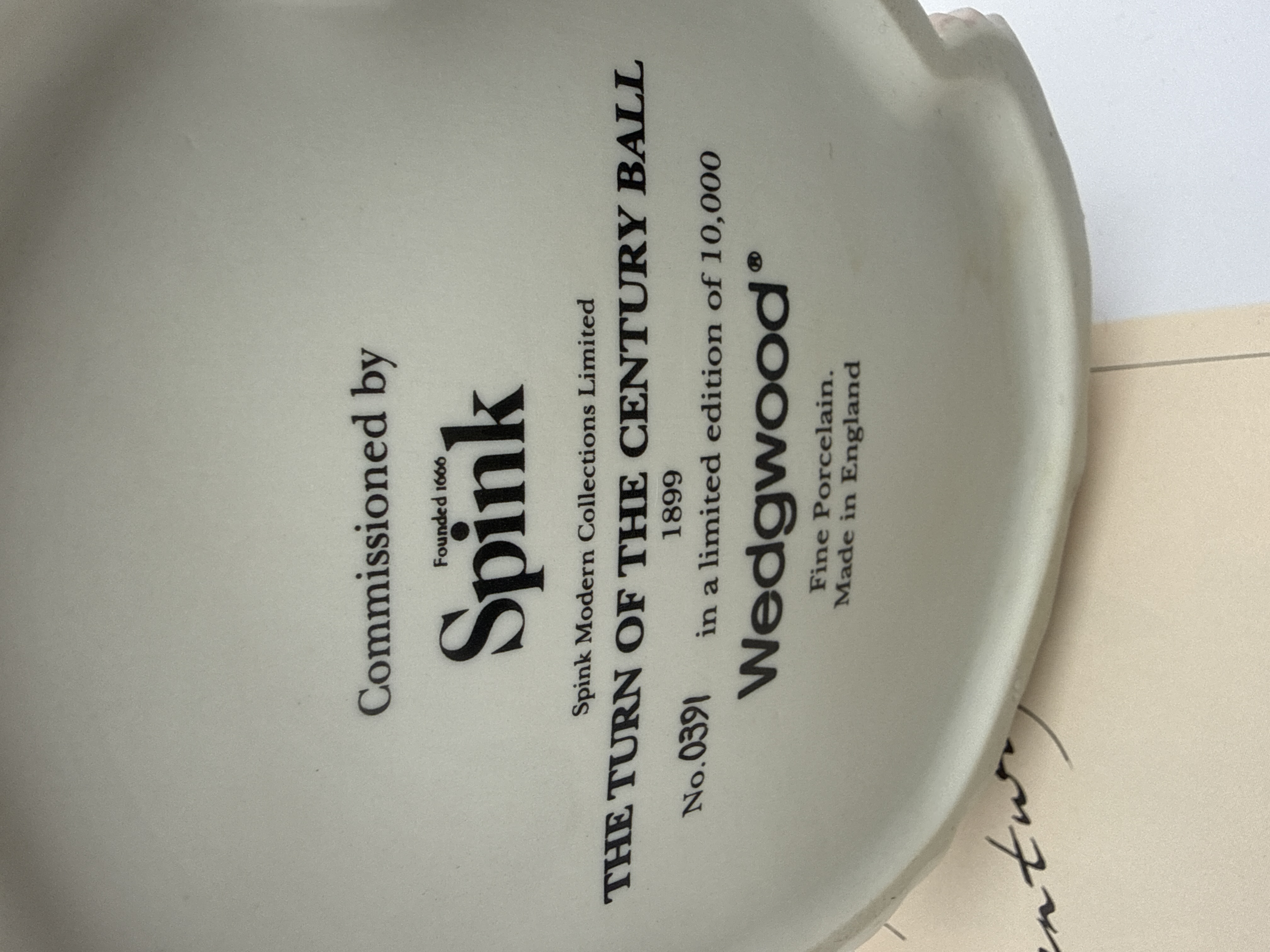 A collection of four items consisting of three polychrome fine porcelain collector figurines and one associated limited edition certificate. The figurines are attributed to Wedgwood Fine Porcelain, Made in England, and belong to “THE GALLERY OF ENGLISH COSTUME” series, designed by Pauline Parsons. The figures depict women dressed in elaborate Turn of the Century (Victorian/Edwardian) costume, executed with polychrome enamel decoration primarily in soft pastel shades of blue, pink, and cream. The bases of the figurines are stamped with titles: “Afternoon Promenade” (marked © FM 1989), “Enchanted Evening” (marked © FP 1988), and “THE TURN OF THE CENTURY BALL” (1899). The base of “THE TURN OF THE CENTURY BALL” is further marked as commissioned by Spink and indicates it is a limited edition of 10,000, with this specific piece numbered 0391. The accompanying paper certificate confirms the limited edition status and the number 0391.