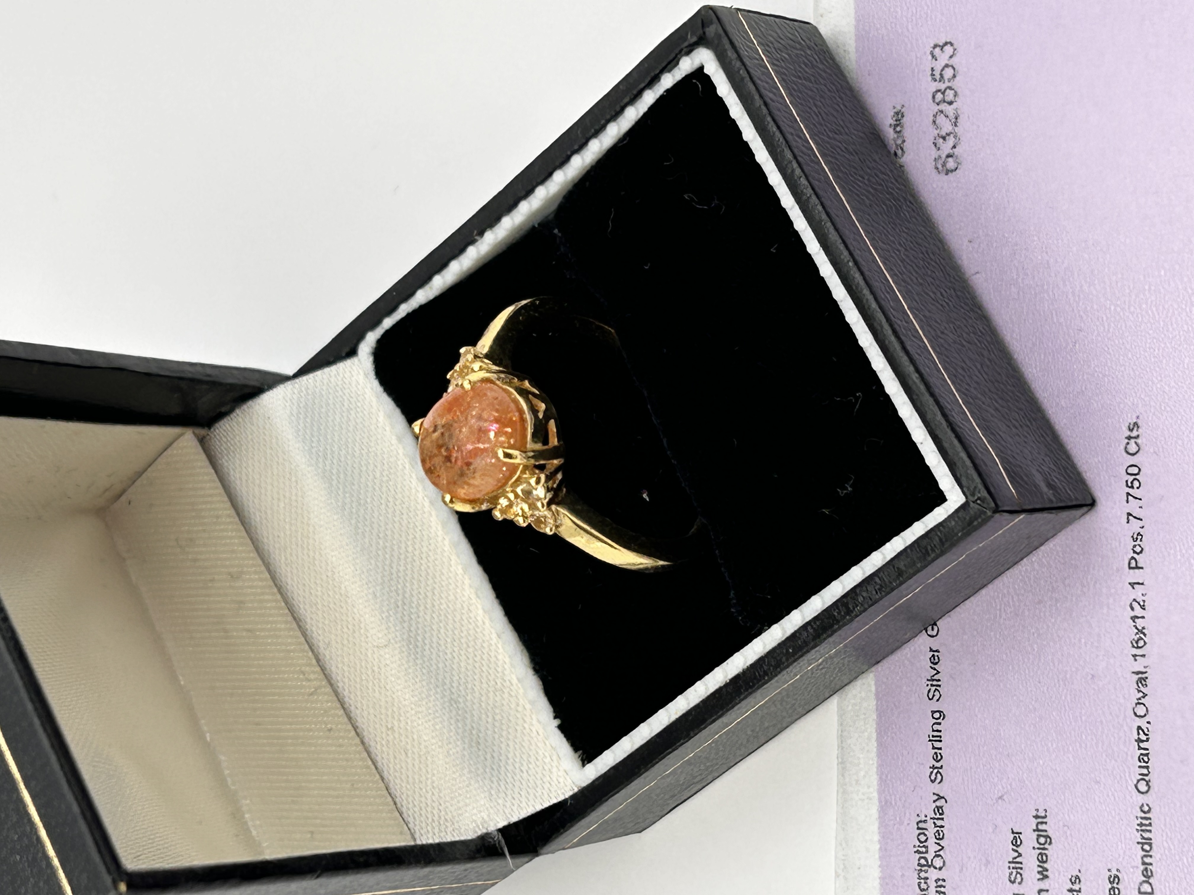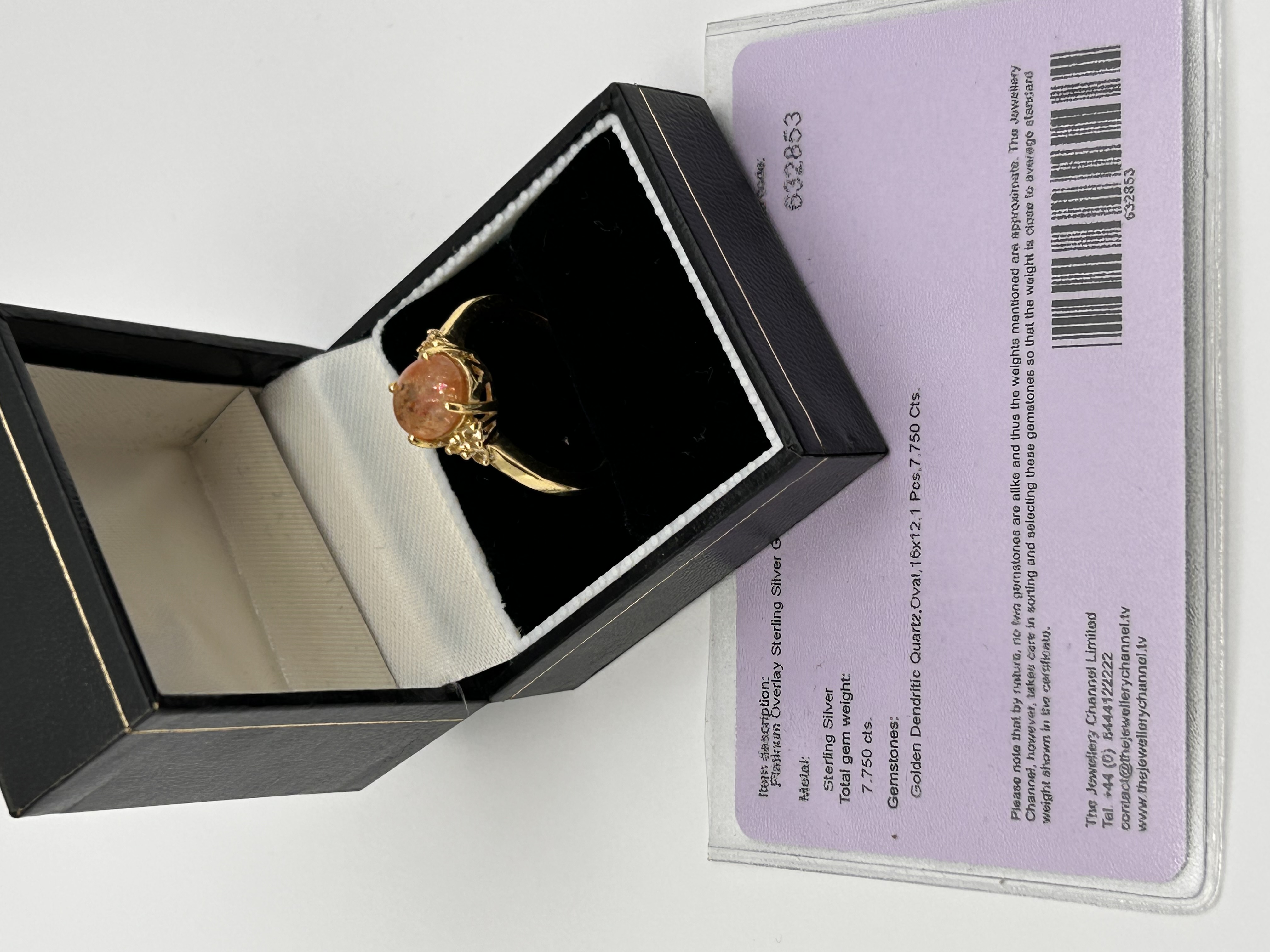 A single finger ring featuring a large oval cabochon-cut Golden Dendritic Quartz central gemstone. The central stone exhibits internal orange and salmon-colored dendrites. The shoulders of the ring are flanked by trilogies of small, colorless accent stones. The ring is set in a yellow gold-toned metal band identified as Sterling Silver with a Platinum Overlay. The accompanying descriptive card identifies the item as Code 632853 from The Jewellery Channel Limited.