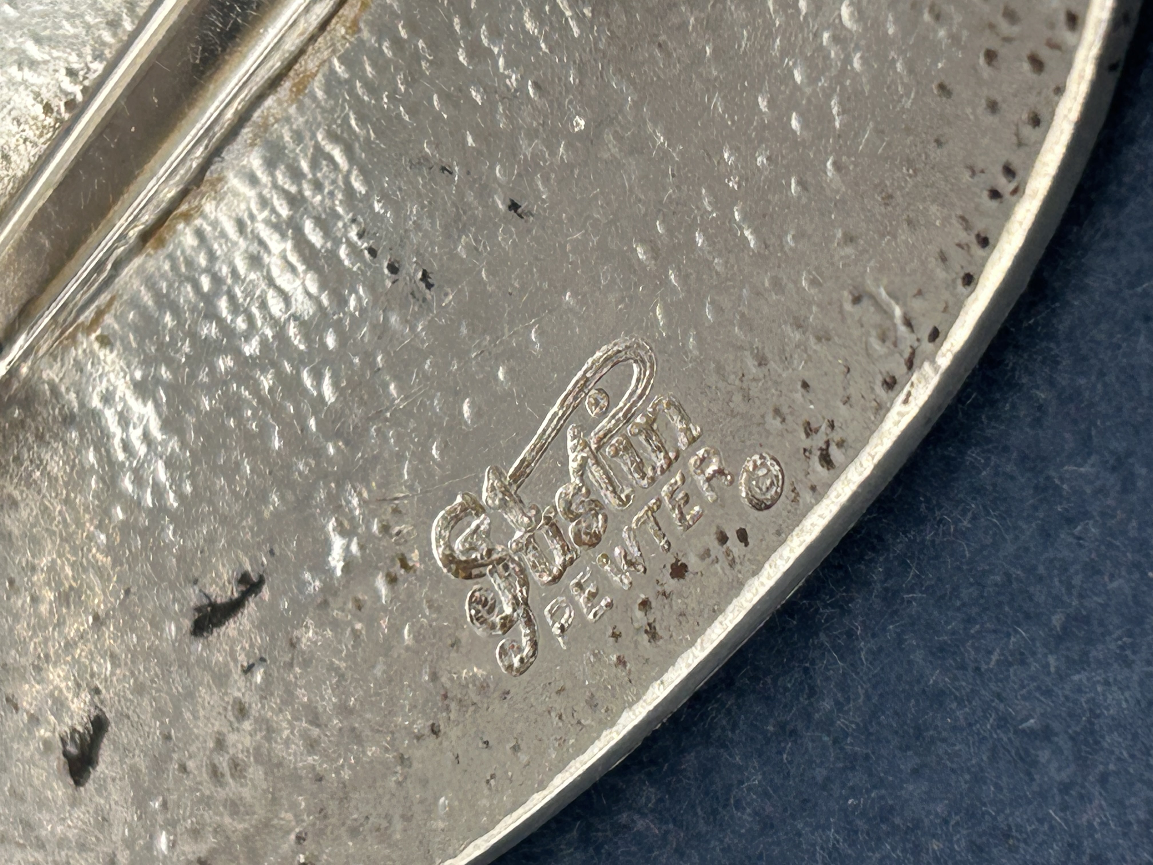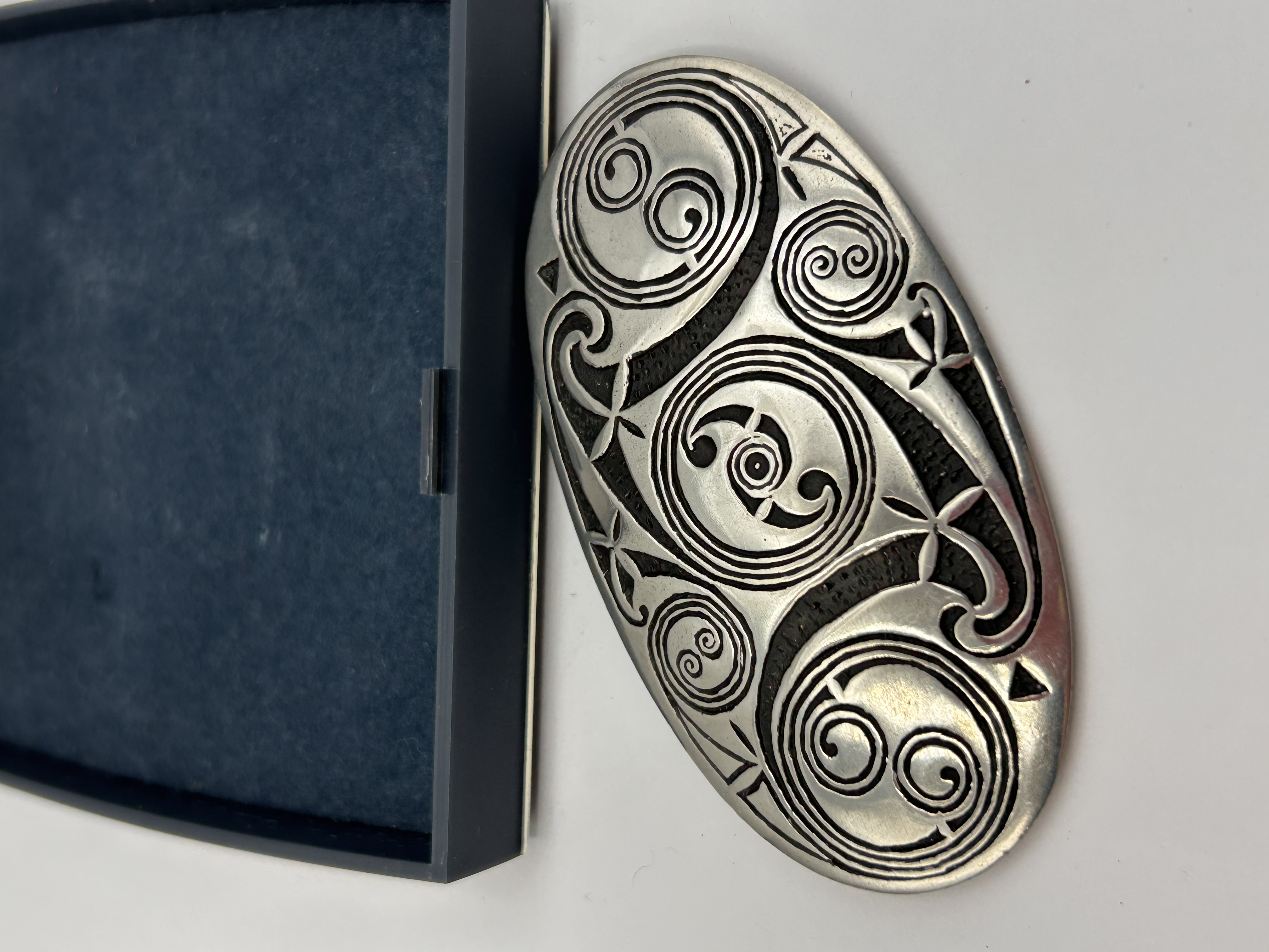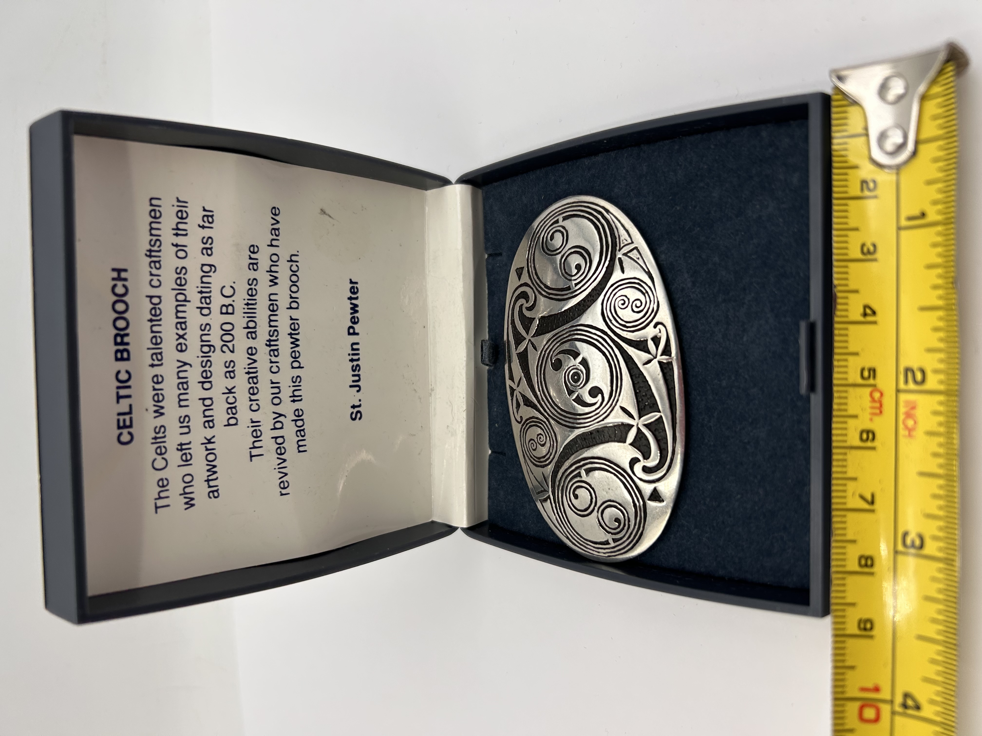 A lot consisting of two items: a St. Justin Pewter Celtic Oval Brooch and its original presentation box. The brooch is crafted from silver-toned pewter and features a high-relief design incorporating traditional Celtic knotwork, spirals, and triskelions. The recessed areas of the design are intentionally darkened to provide visual contrast. The reverse of the brooch is clearly marked with the manufacturer’s stamp “St. JUSTIN PEWTER ®.” The brooch is presented in its original dark gray hinged presentation box, which is lined with dark blue velvet/felt. An informational card affixed to the interior lid identifies the piece as a “CELTIC BROOCH” created by St. Justin Pewter craftsmen, referencing ancient artwork dating back to 200 B.C.