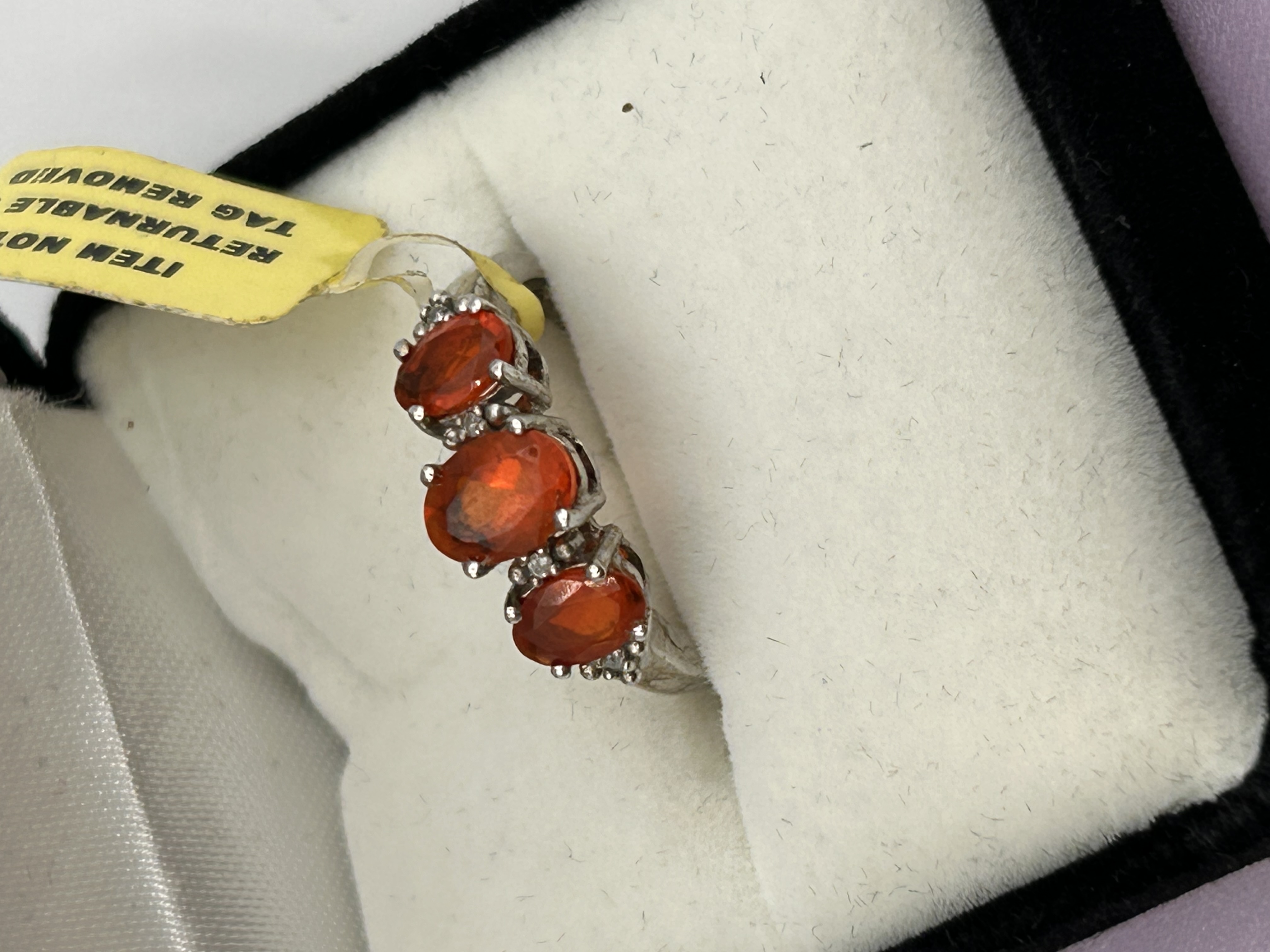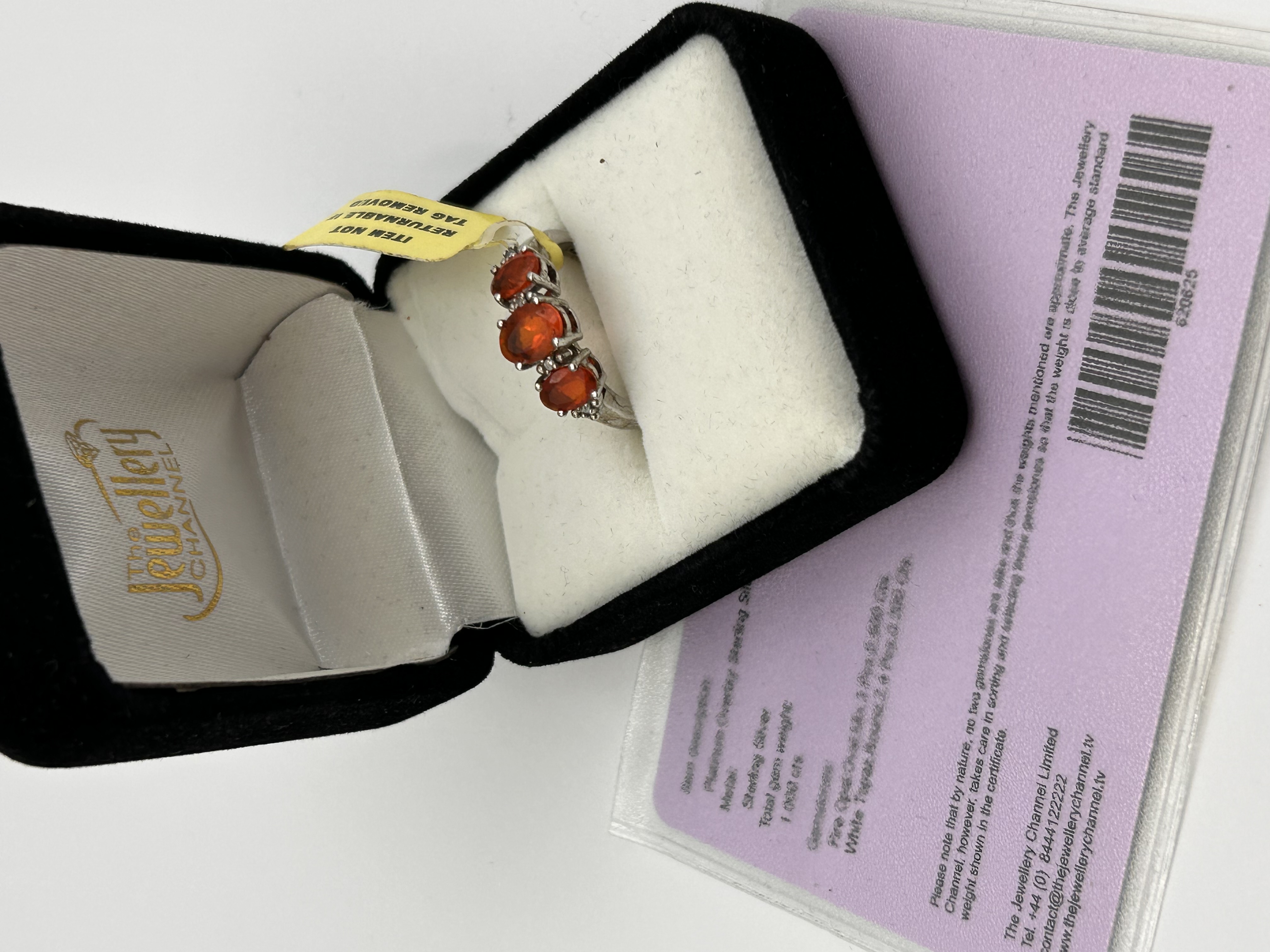 A single trilogy ring featuring a platinum overlay sterling silver setting. The ring is set with three horizontally aligned, oval-cut fire opals, exhibiting a deep orange-red coloration. The shoulders are accented by small clusters of round-cut white topaz stones. The ring is accompanied by its original packaging, a black velvet-flocked hinged jewelry box marked “The Jewellery Channel,” and a pink information card. According to the card, the metal is Platinum Overlay Sterling Silver, the total gem weight is 1.000 carats, comprising 3 pieces of Fire Opal and 24 pieces of White Topaz. The stock number 820625 is printed on the information card.