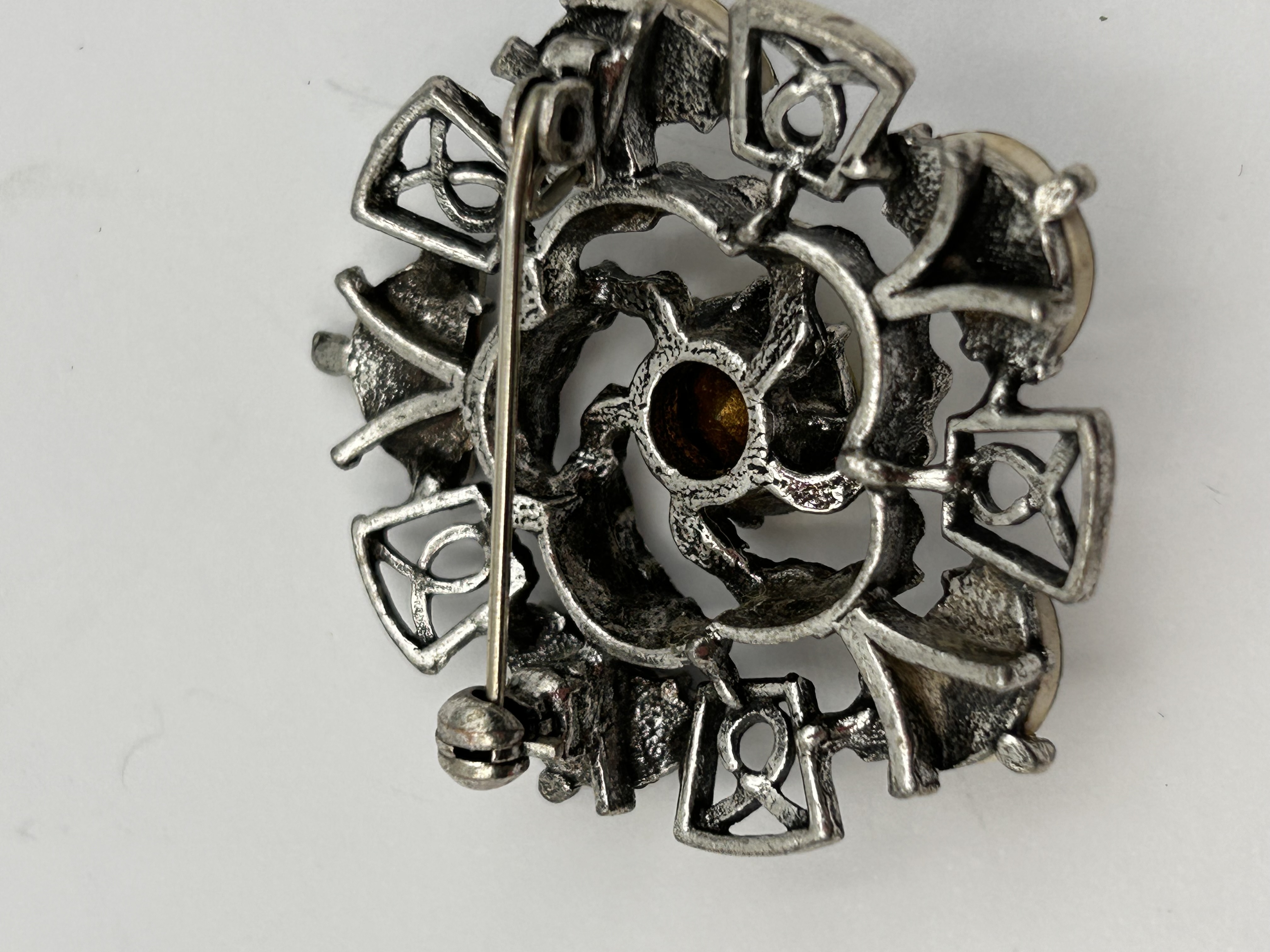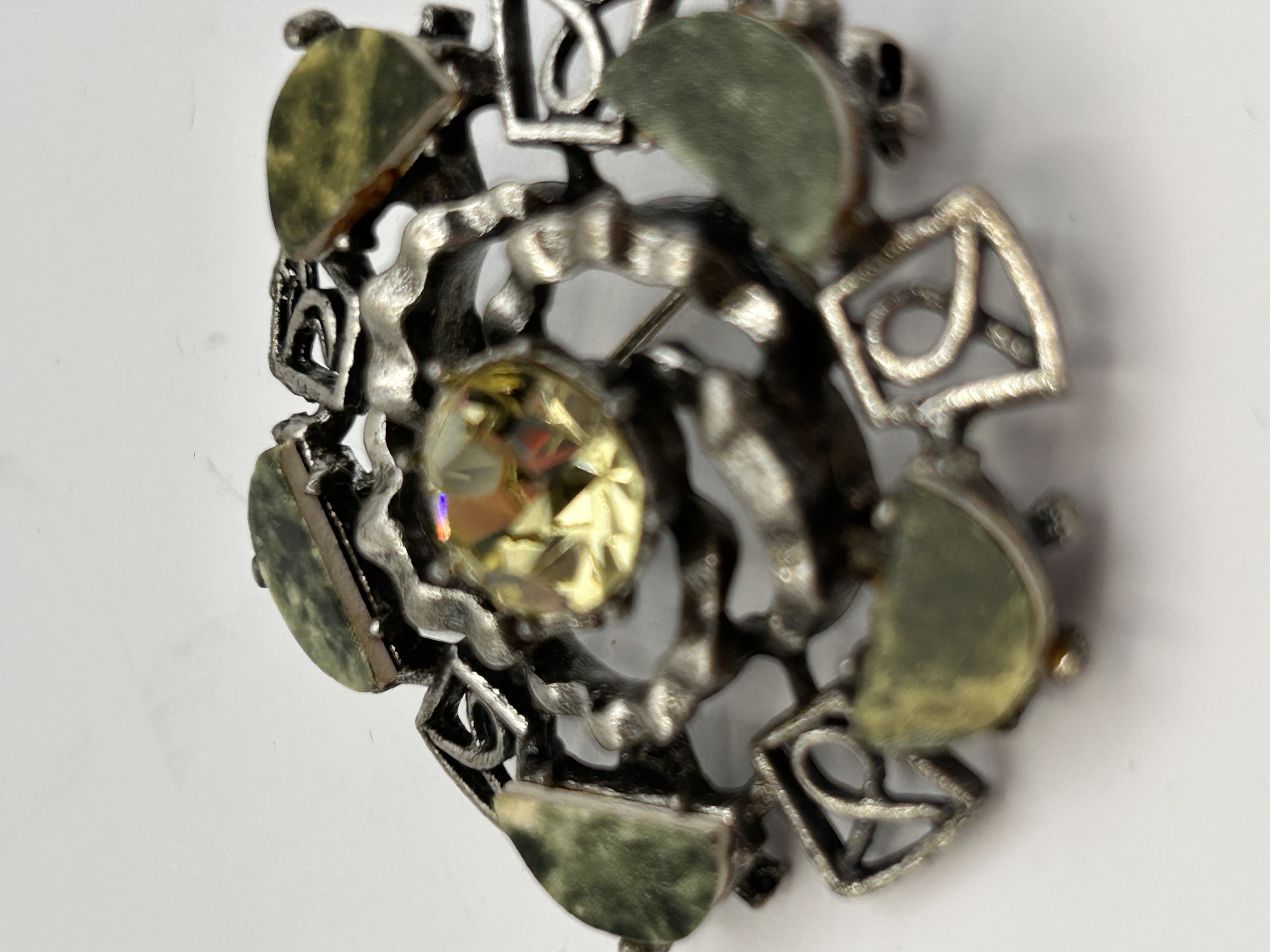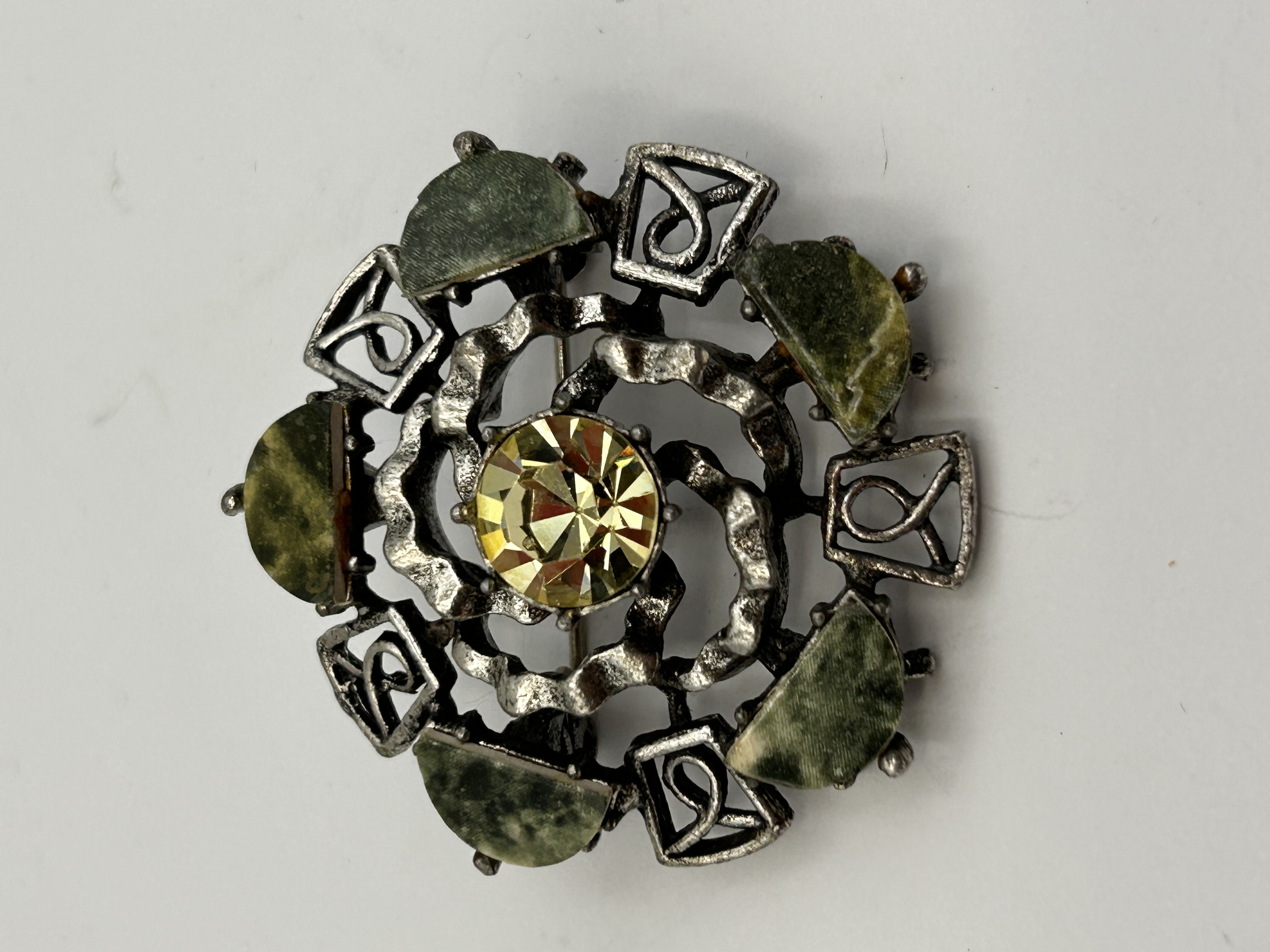 A single vintage costume jewelry brooch of circular openwork form, constructed from a dark silver-tone base metal. The design features a central setting holding one large, round, faceted bright yellow glass or paste stone. This central element is surrounded by an openwork structure alternating between seven curved, trapezoidal cabochons of mottled green material, likely faux serpentine or jasper, and seven square metal settings featuring an open knot-like motif. The overall aesthetic is reminiscent of Scottish pebble jewelry. The reverse of the brooch features a functional pin and a simple C-clasp closure. No identifying marks or text are visible.
