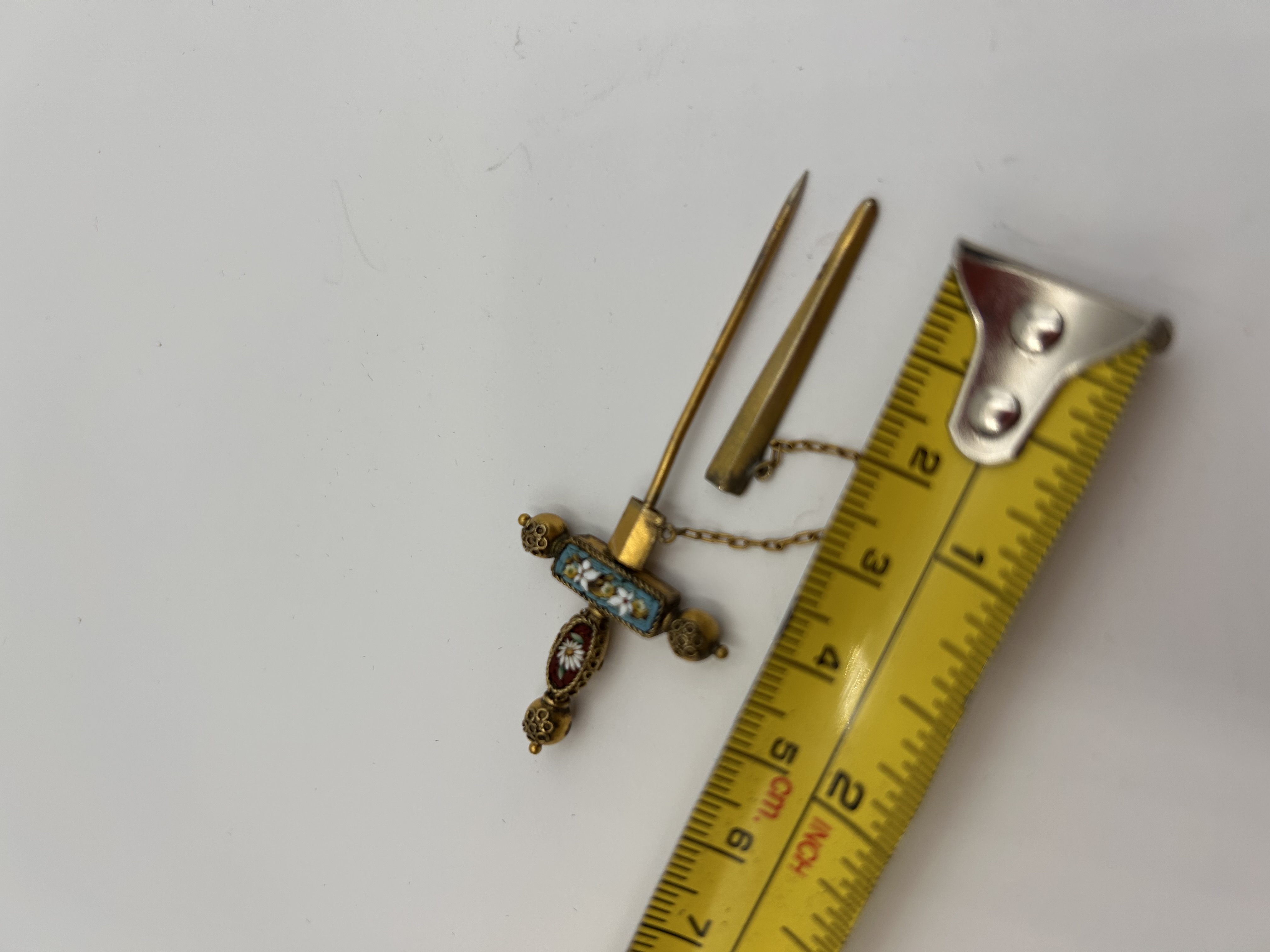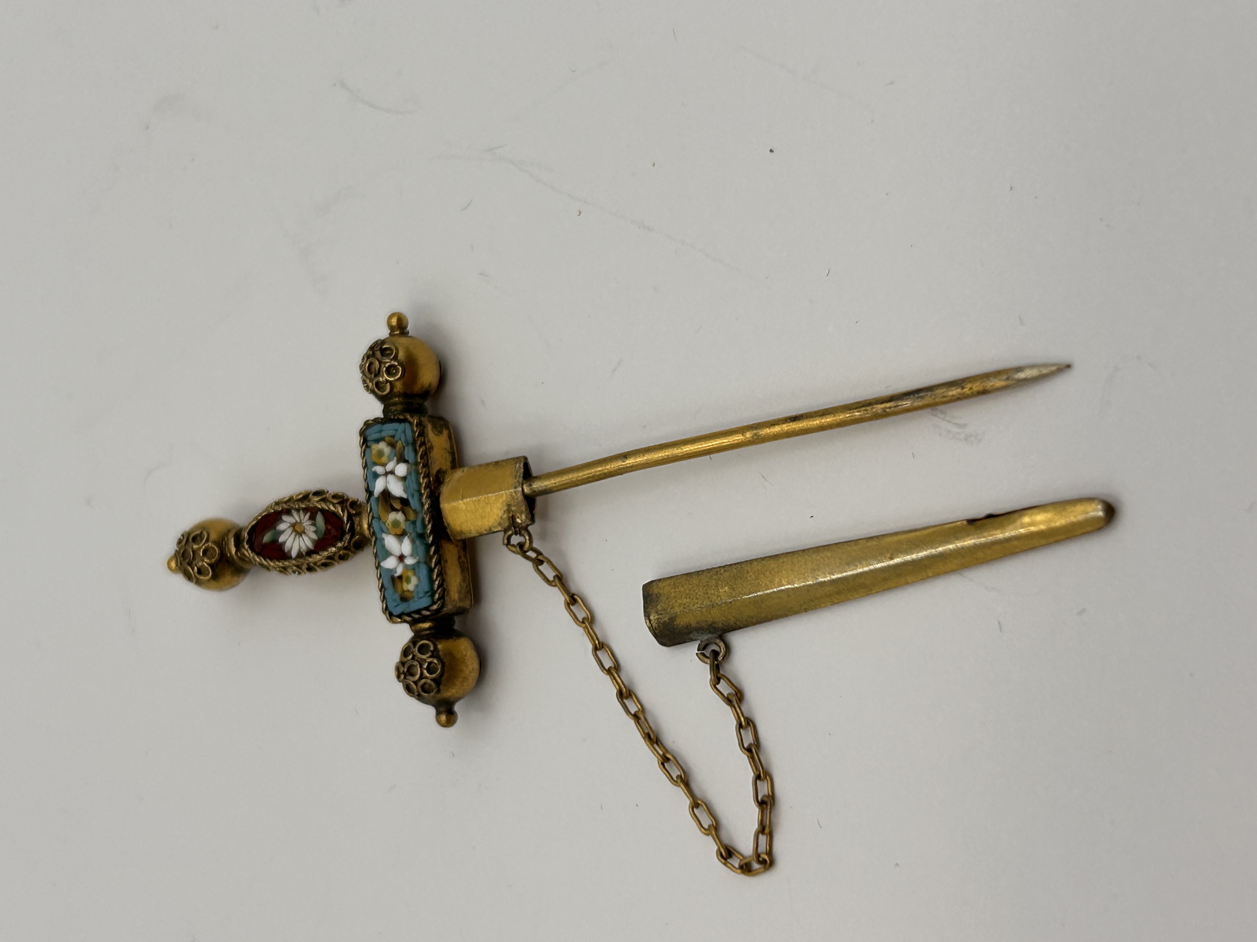 A single antique miniature dagger or sword pin, identified through market consensus as an Italian Micromosaic Jabot Pin, dating to the Victorian or Edwardian era. The object is constructed of gold-toned metal (likely gilt or gold-filled) and features a sharp blade attached to an ornate hilt. The hilt includes a cross-guard and pommel, both decorated with detailed micromosaic panels. The rectangular cross-guard panel depicts white flowers against a turquoise ground, while the oval pommel panel displays a single white flower against a deep red ground, surrounded by openwork spheres. The tapered scabbard is attached to the hilt via a small gold-toned chain. No visible hallmarks or manufacturer’s markings are present.