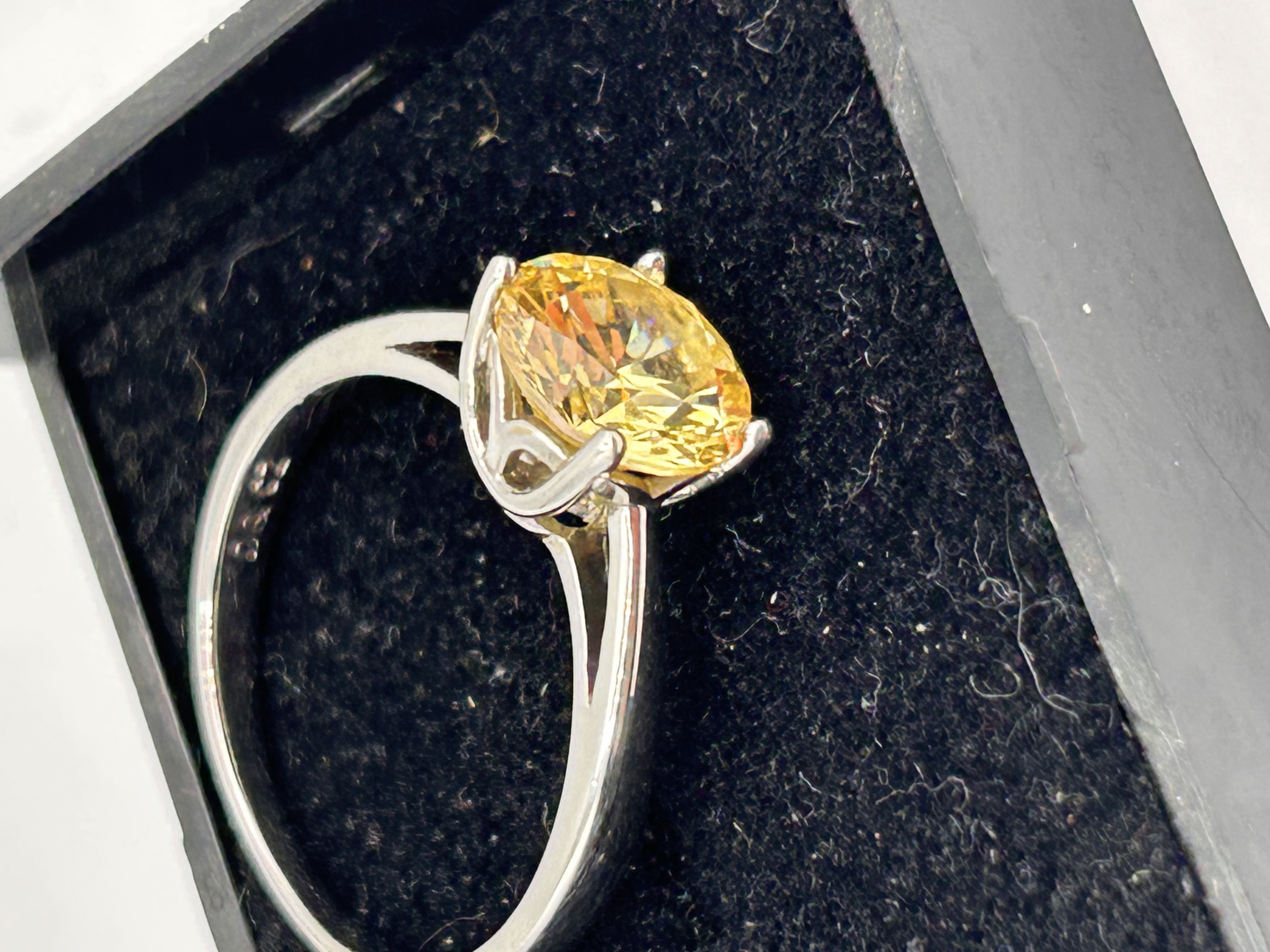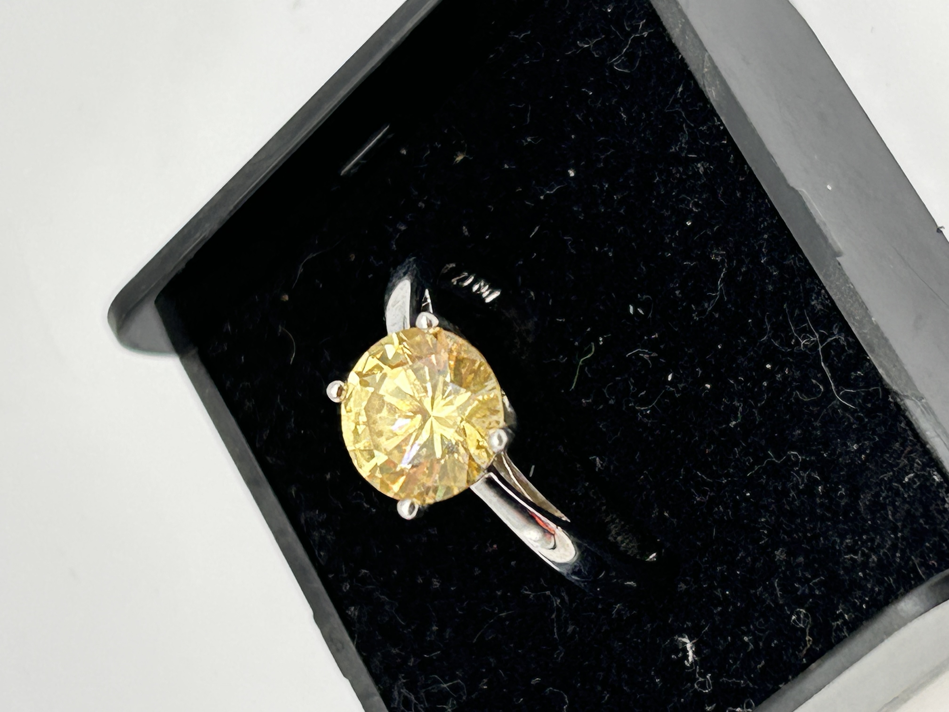 A single solitaire ring crafted from Silver, featuring a contemporary design. The ring is set with a large, round brilliant-cut central stone exhibiting a vivid yellow-orange coloration, secured by a classic four-prong basket setting. The polished shank is plain. Visible markings on the interior of the band include ‘S925′, confirming the Silver material as per user-provided facts, followed by numerical characters, likely ’62’, indicating size or model number.