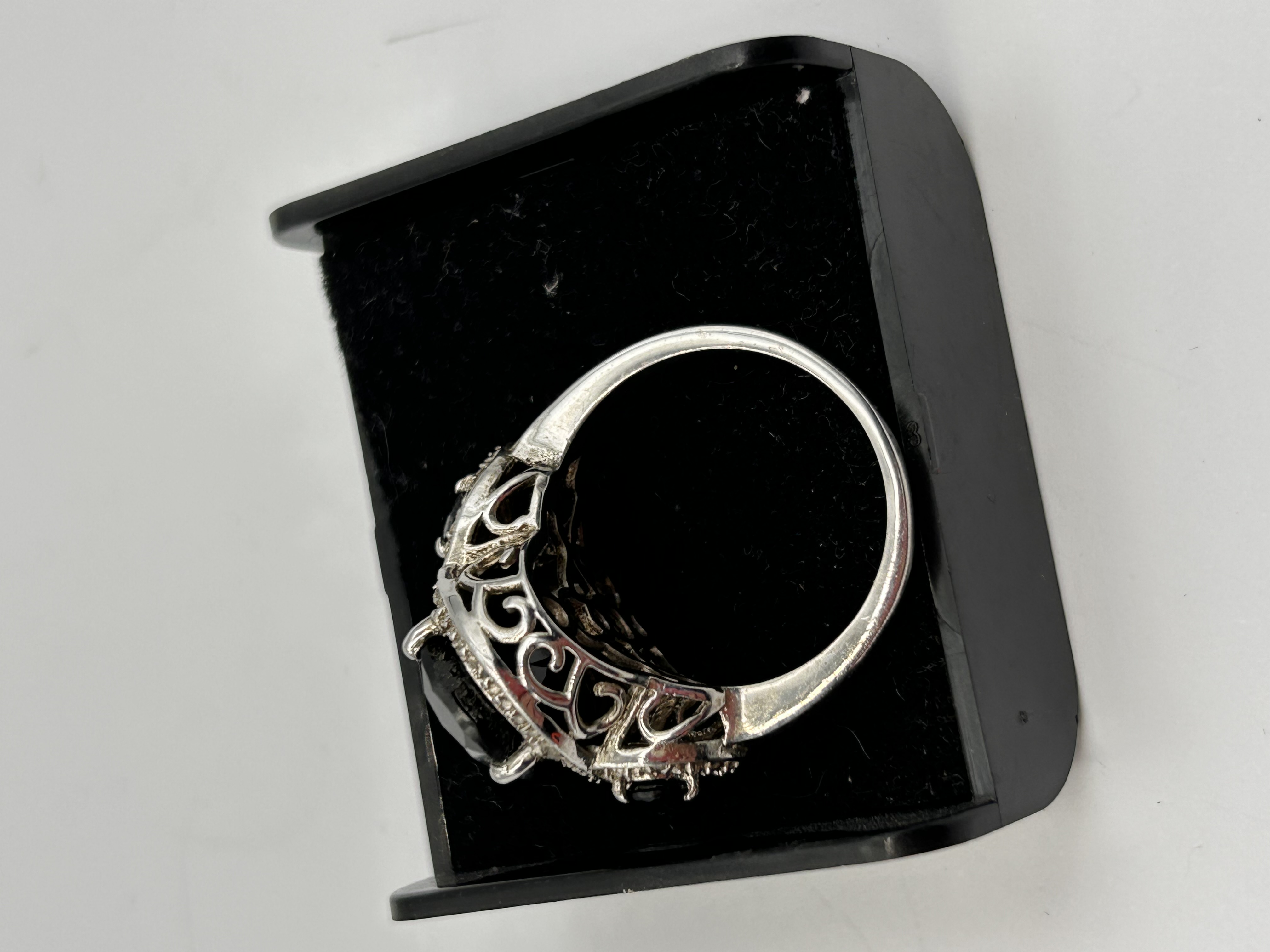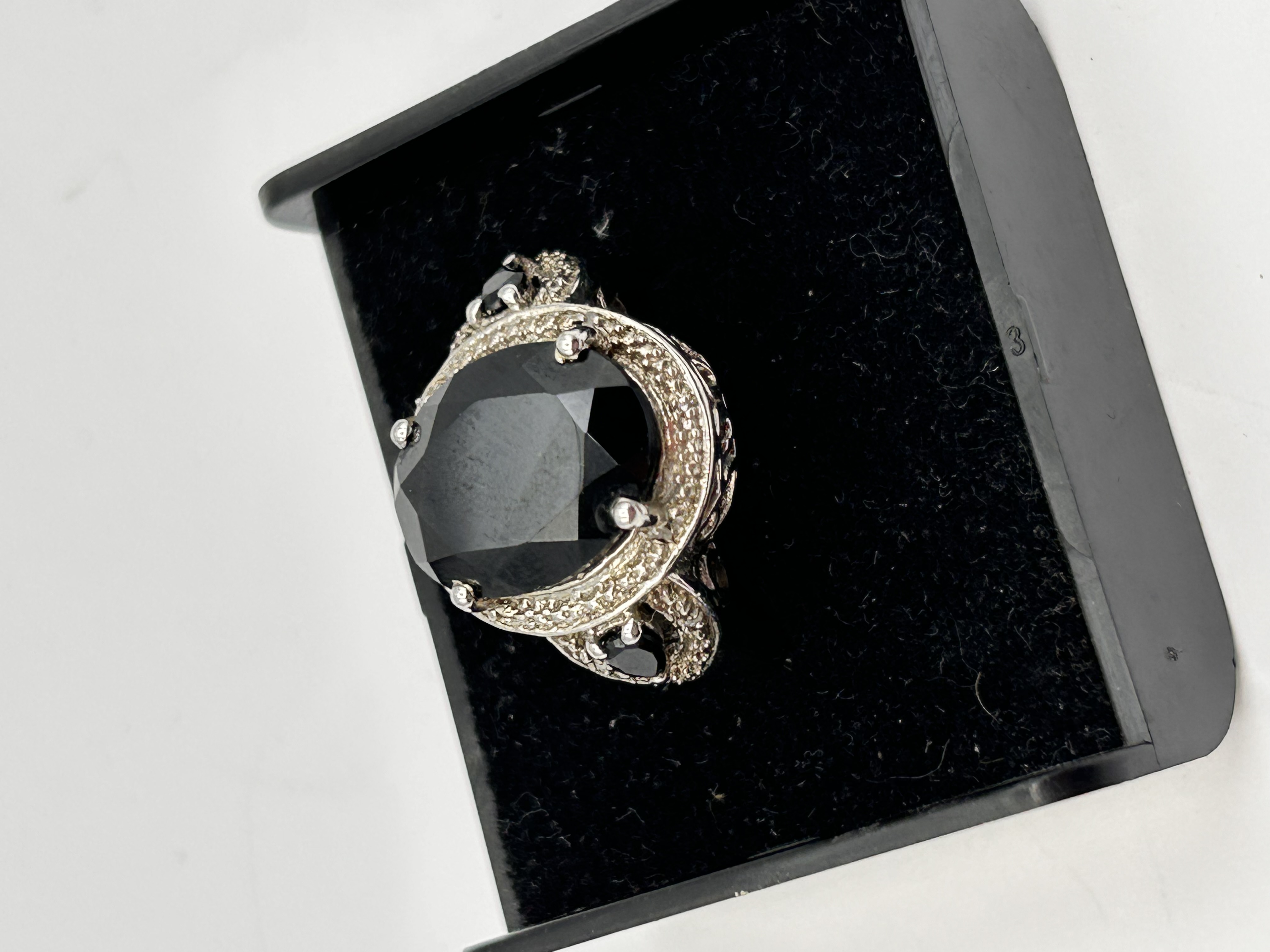 A single cocktail or statement ring attributed to the style of the Disney Treasures or Enchanted Disney Fine Jewelry lines. The mounting is constructed from Silver, as confirmed by user facts. The ring features a high-set, large oval, faceted opaque black center stone, identified by market consensus as Black Onyx. This central stone is surrounded by a halo of small, round, clear accent stones, identified as Diamond accents in comparable market listings. The gallery and sides of the band incorporate intricate filigree and openwork scrolling designs. No visible hallmarks or text are discernible from the exterior views.