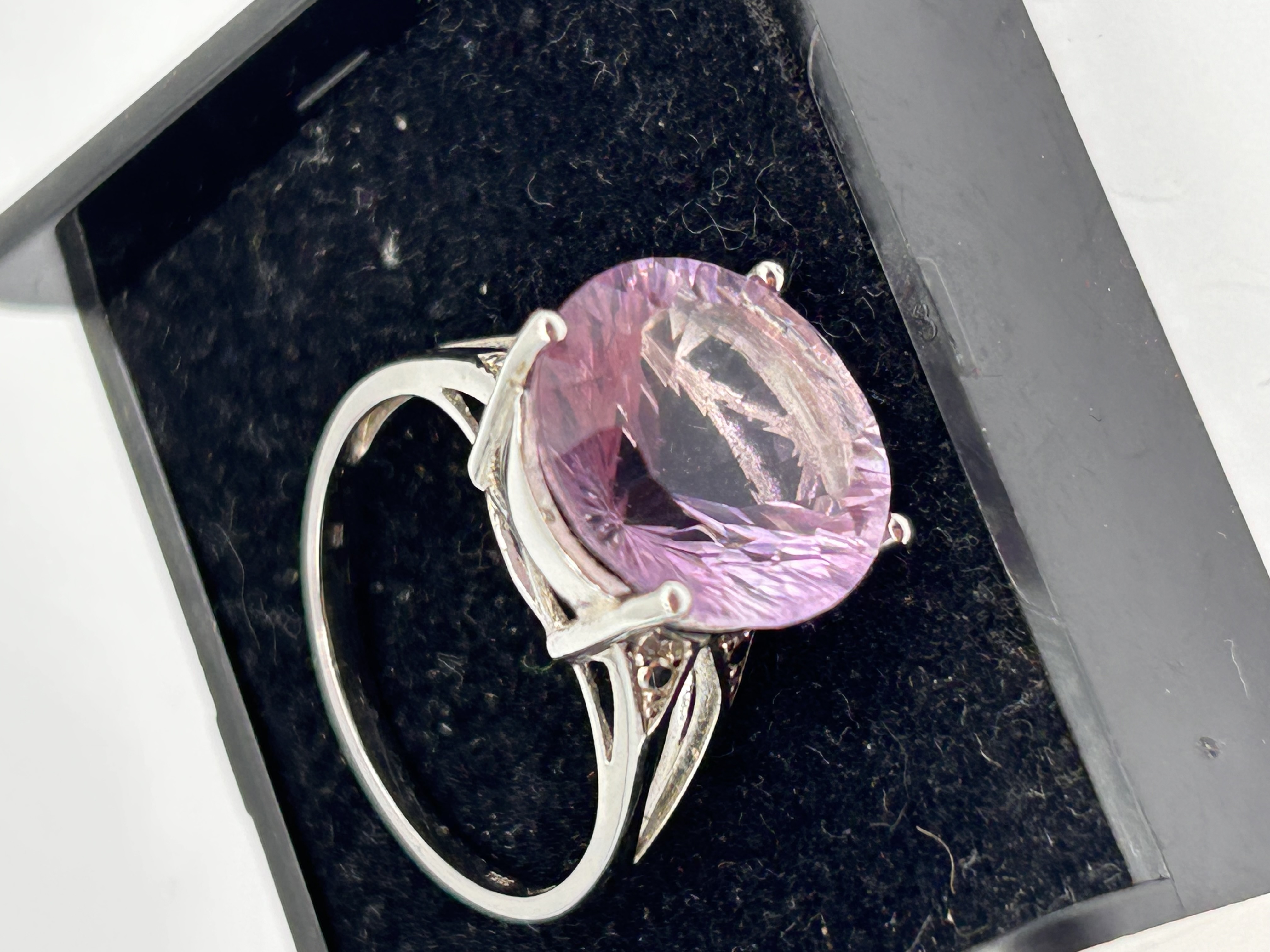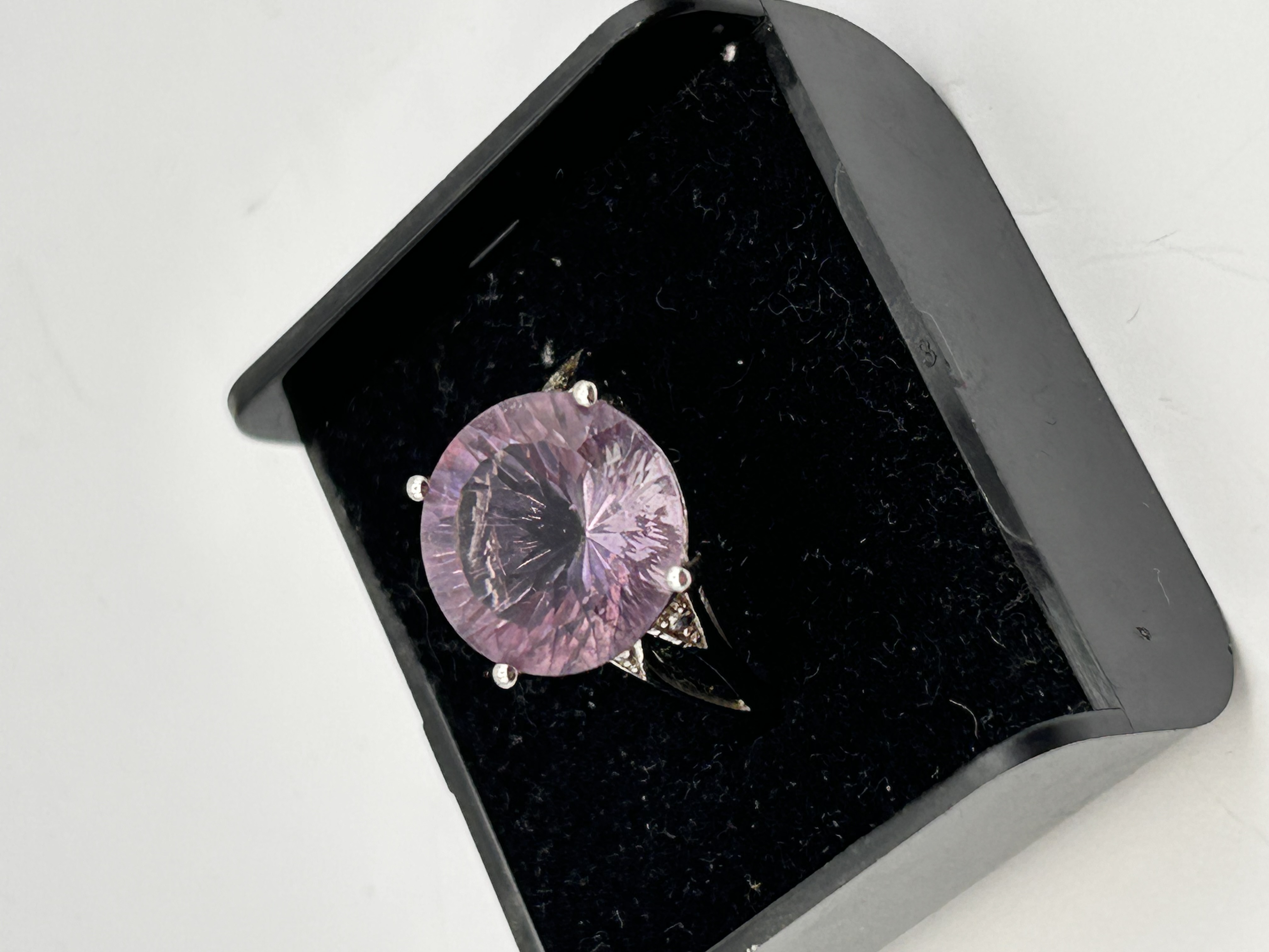 This lot consists of a single cocktail ring. The mounting is confirmed to be Silver. The ring features a substantial, circular gemstone displaying a pink-lavender color, identified through market consensus as Amethyst. The central stone is secured by a four-prong setting and exhibits a deep, radiating facet pattern, commonly referred to as a sunburst or concave cut. The shoulders of the setting include decorative metalwork accents. The item is presented in a black velvet-lined display tray.