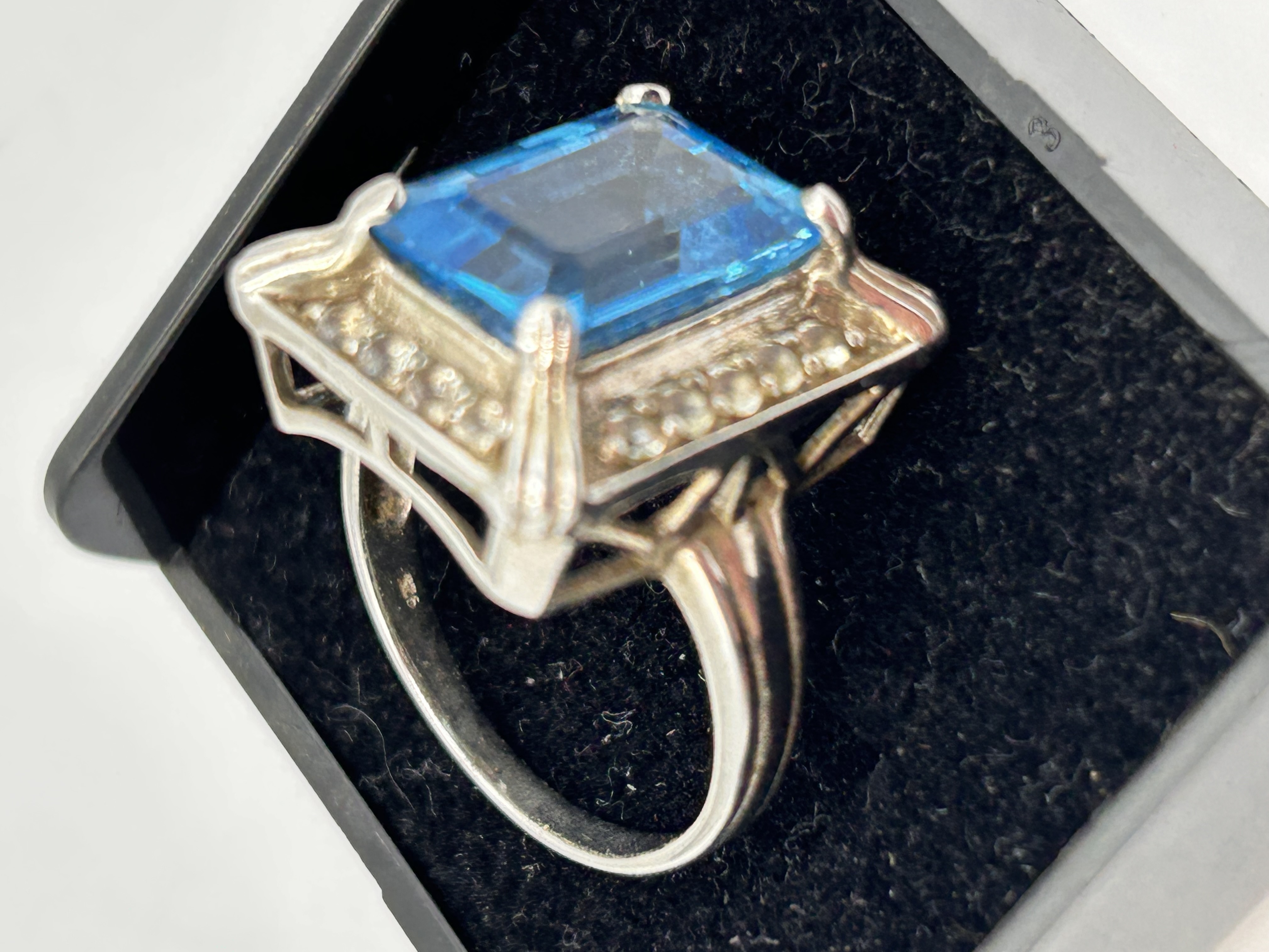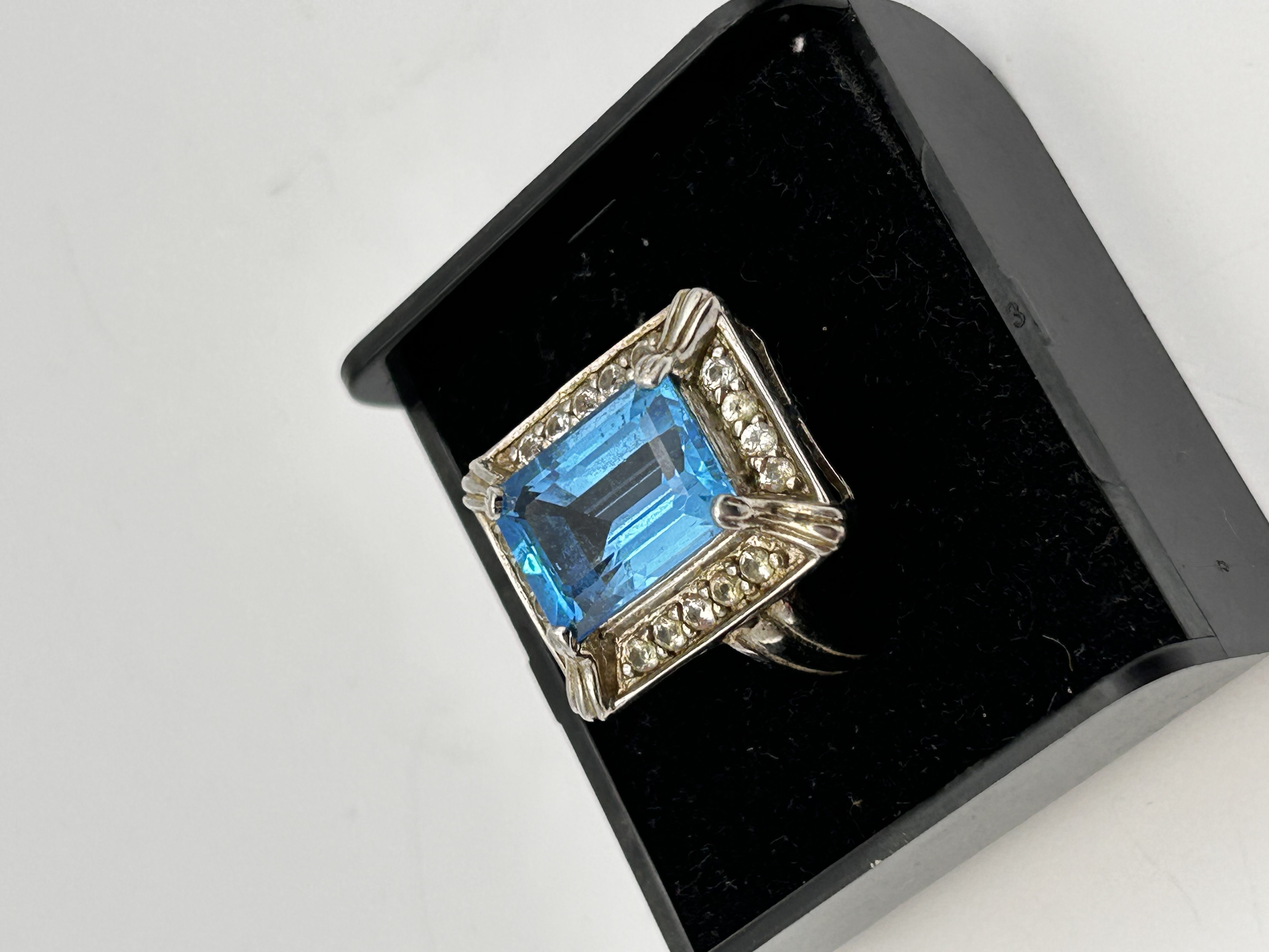A vintage-style cocktail ring crafted in Silver, featuring a large, elevated central gemstone. The primary stone is a rectangular step-cut gemstone, consistent with an emerald cut, displaying a vibrant medium blue color, likely Blue Topaz, matching the style identified in market comparisons. The head of the ring has a geometric, angled design. The central stone is bordered by a continuous halo of 24 small, round-cut accent stones set into the substantial mounting. The band is solid and plain. A small, illegible marking or stamp is visible on the interior of the shank near the shoulder.