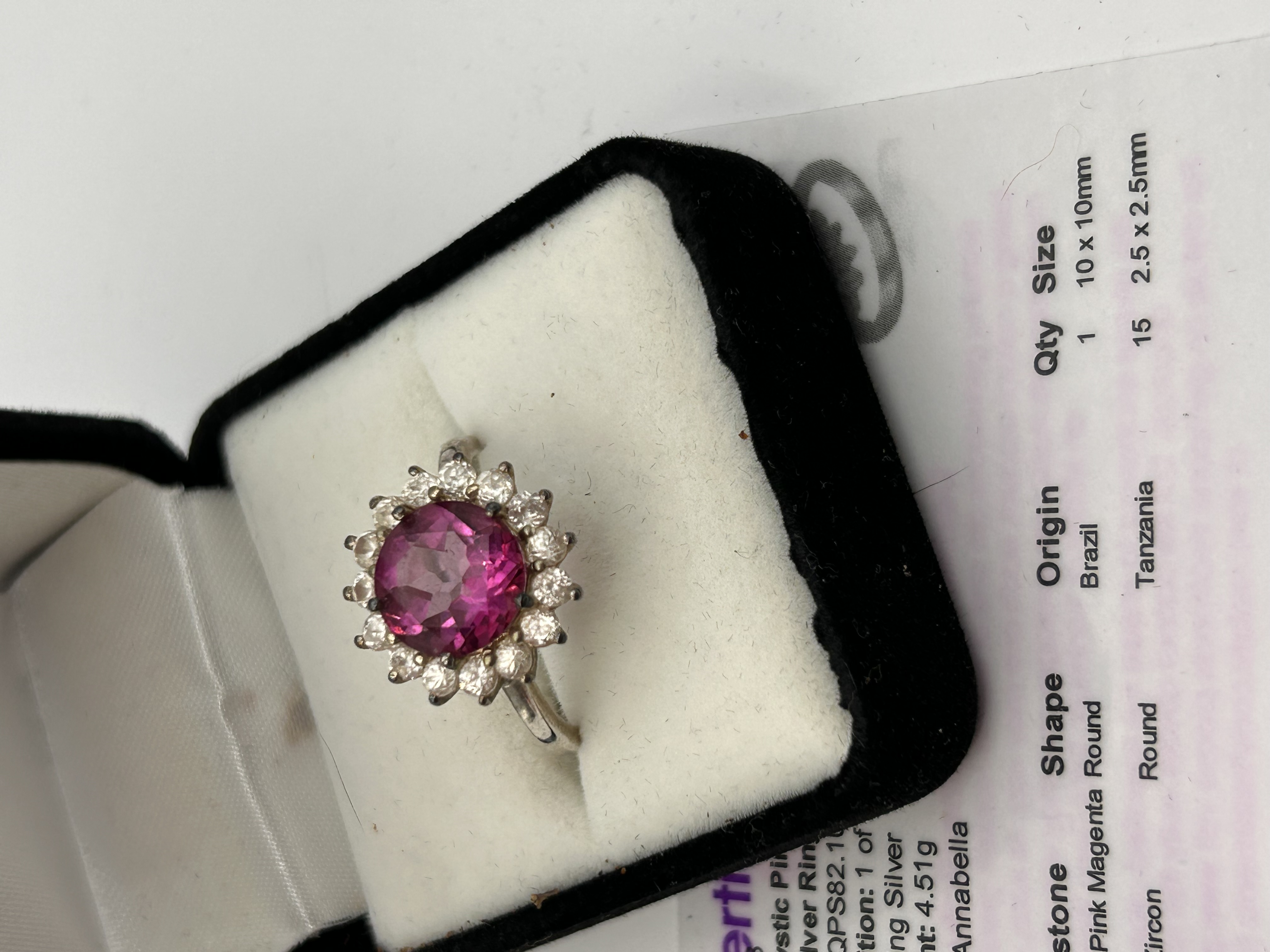 A trio of items comprising a sterling silver cluster ring, a black velvet presentation box, and a corresponding certification card. The ring, from the Annabella Collection (Design WGP82.10), is a Size 10, set in Silver. The cluster design features a central 10x10mm round faceted Mystic Pink Magenta Topaz weighing 4.48 carats (Brazil origin). This central stone is surrounded by a halo of fifteen round-cut White Zircon stones, each measuring 2.5×2.5mm, totaling 1.57 carats (Tanzania origin). The ring is housed in its original presentation box labeled “The Jewellery Channel.” The accompanying certification card is dated 15/04/2013 and lists the full material specifications.