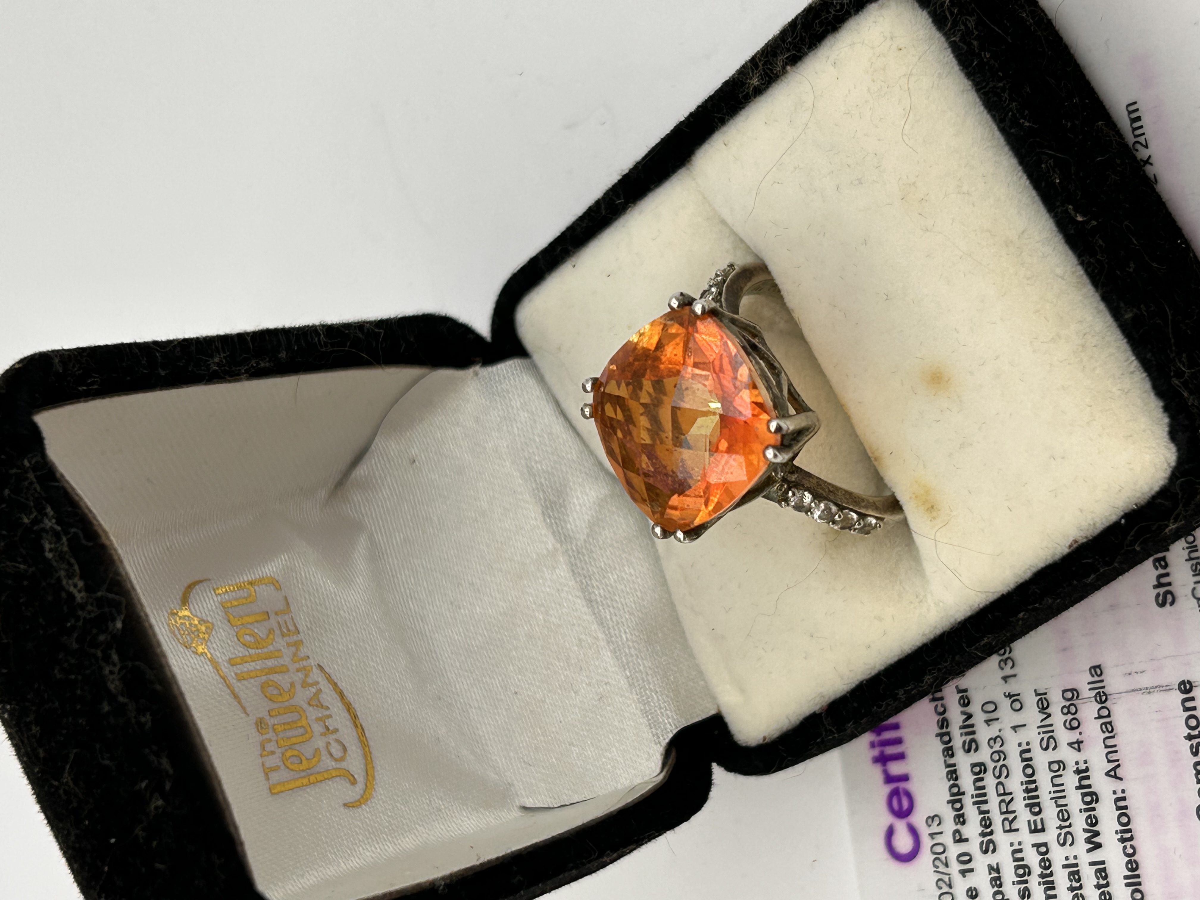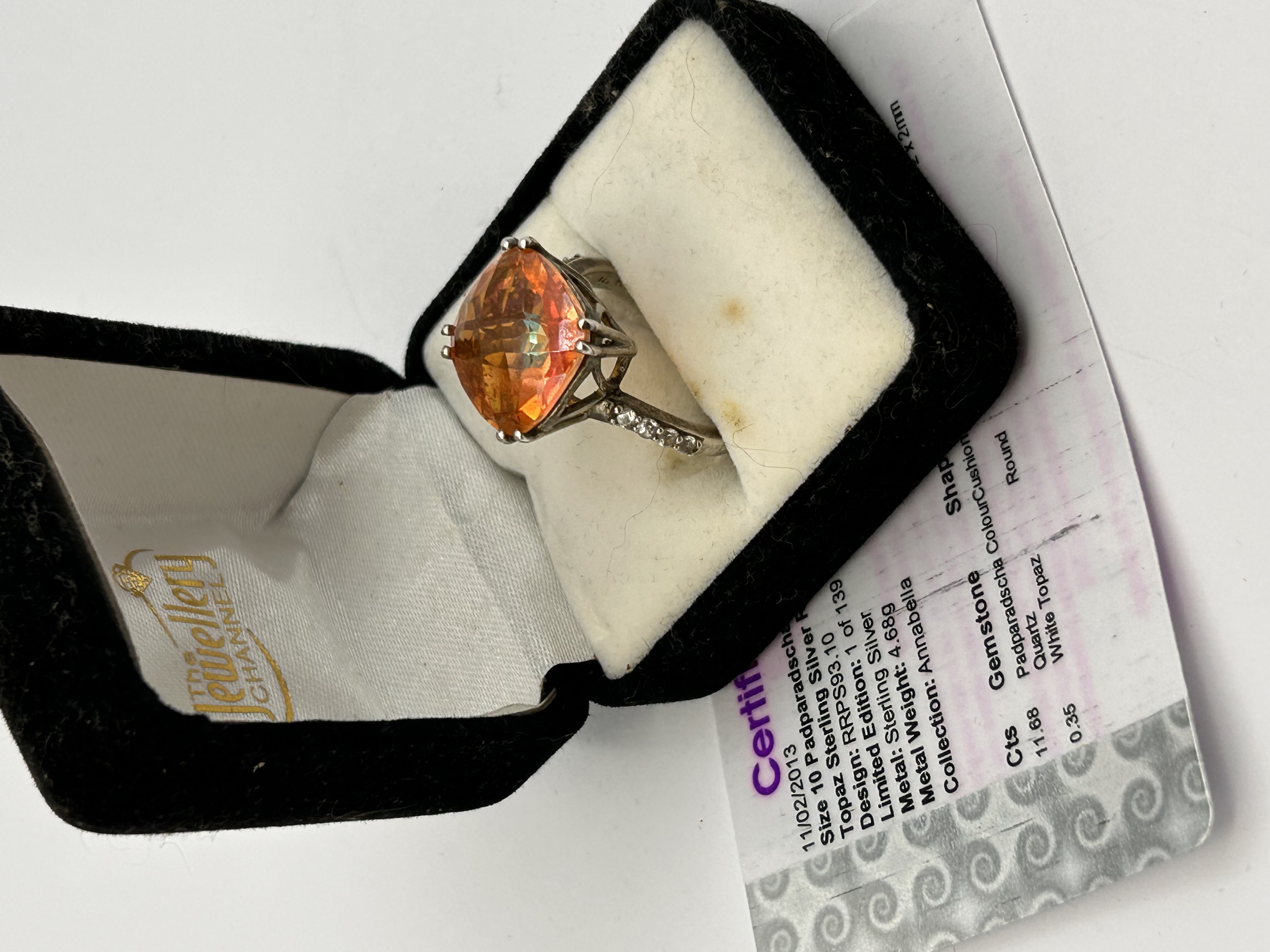 A sterling silver finger ring from The Jewellery Channel’s “Annabella” Collection, presented in its original box with a partial certificate. The ring features a high-set, cushion-cut central stone identified on the certificate as 11.68 Carats Padparadscha Colour Topaz. The shoulders of the band are set with multiple small, round accent stones, identified as 0.35 Carats White Topaz. The ring is marked as a Limited Edition, 1 of 139, and the certificate is dated 11/02/2013. The metal is confirmed to be Silver.
