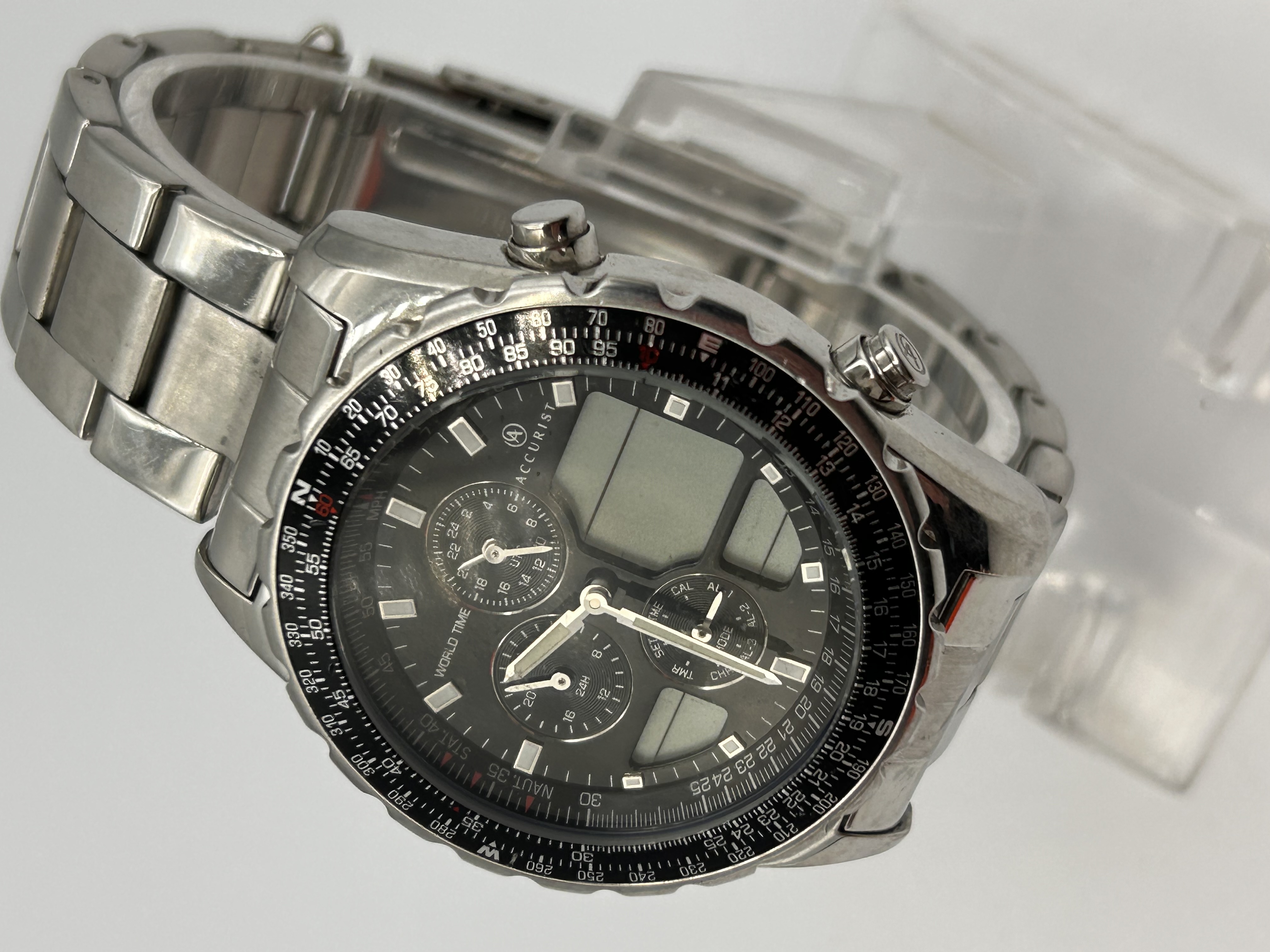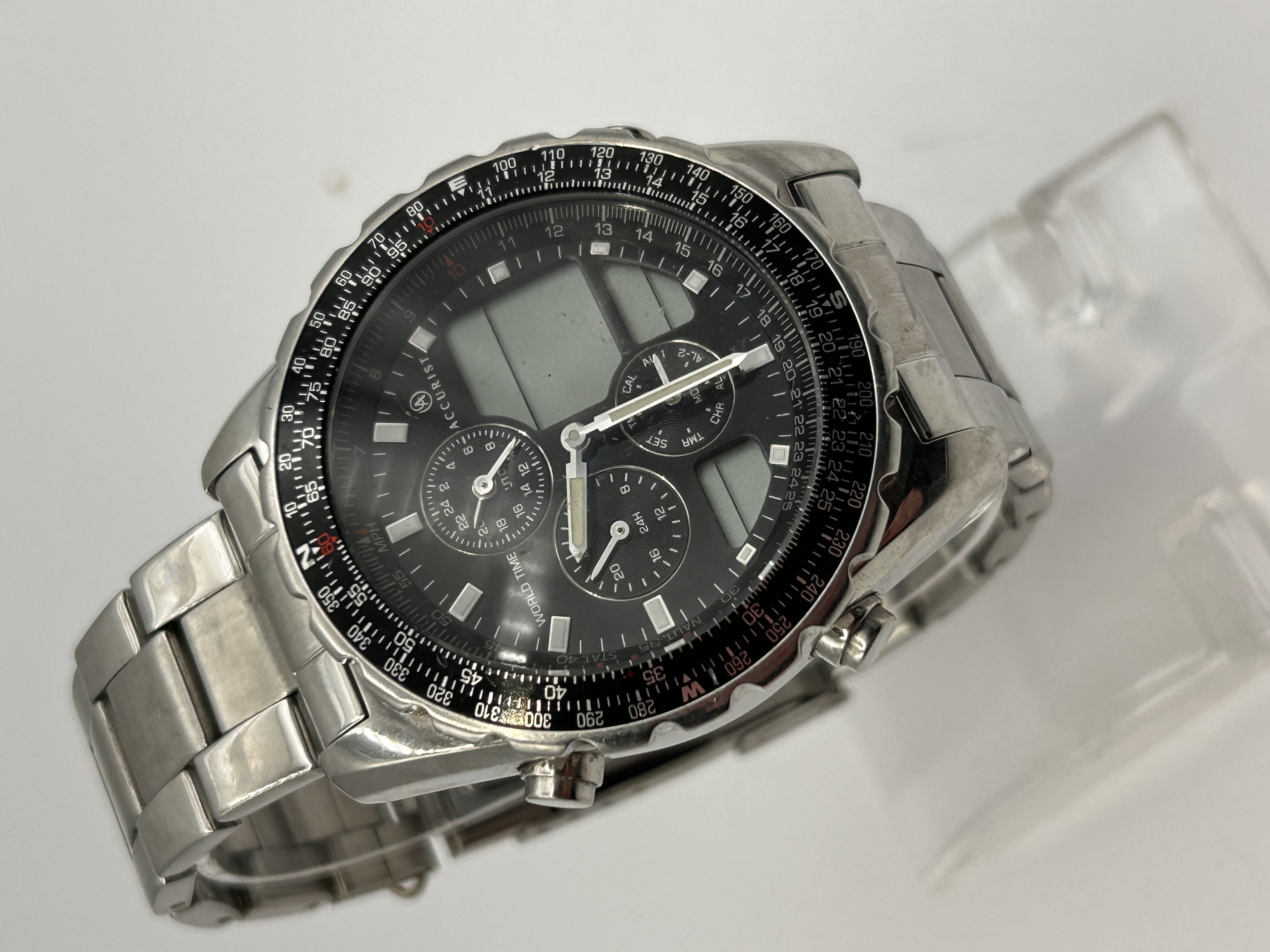 A single Accurist Men’s World Time Chronograph wristwatch constructed in stainless steel with a multi-link bracelet. The watch features a black dial with a complex analog-digital (ana-digi) display configuration. The dial incorporates three analog subdials, typically indicating functions such as 24-hour time, timer (TMR), or secondary time zones, alongside two rectangular digital display windows. The watch is fitted with a rotating black bezel marked with white numerical scales (0 to 360 degrees) and cardinal directions (N, E, S, W), consistent with an aviator or navigational style watch. Visible markings on the dial include the brand name “ACCURIST,” “WORLD TIME,” “24H,” “TMR,” and “CAL.”