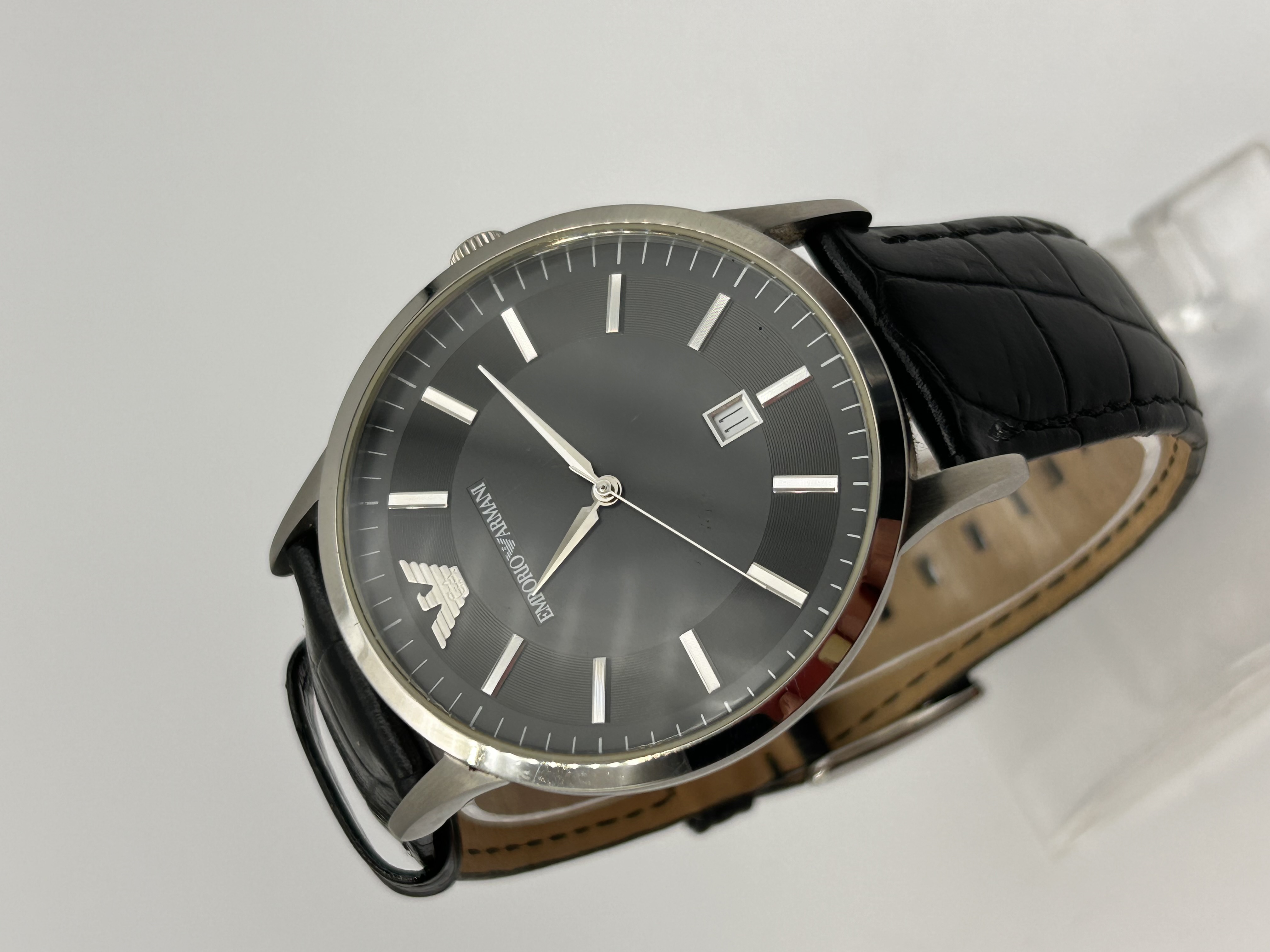 This is a single Emporio Armani Men’s AR2411 quartz wristwatch. The watch features a round, silver-tone metal case, likely stainless steel, housing a deep gray/black dial. The dial is marked with the stylized eagle logo and “EMPORIO ARMANI” below the 12 o’clock position. The time is indicated by silver-tone baton hour markers, with a seconds track along the perimeter. A date aperture is positioned at 6 o’clock, currently displaying the numeral 11. The watch is fitted with a black leather strap embossed with a crocodile pattern.