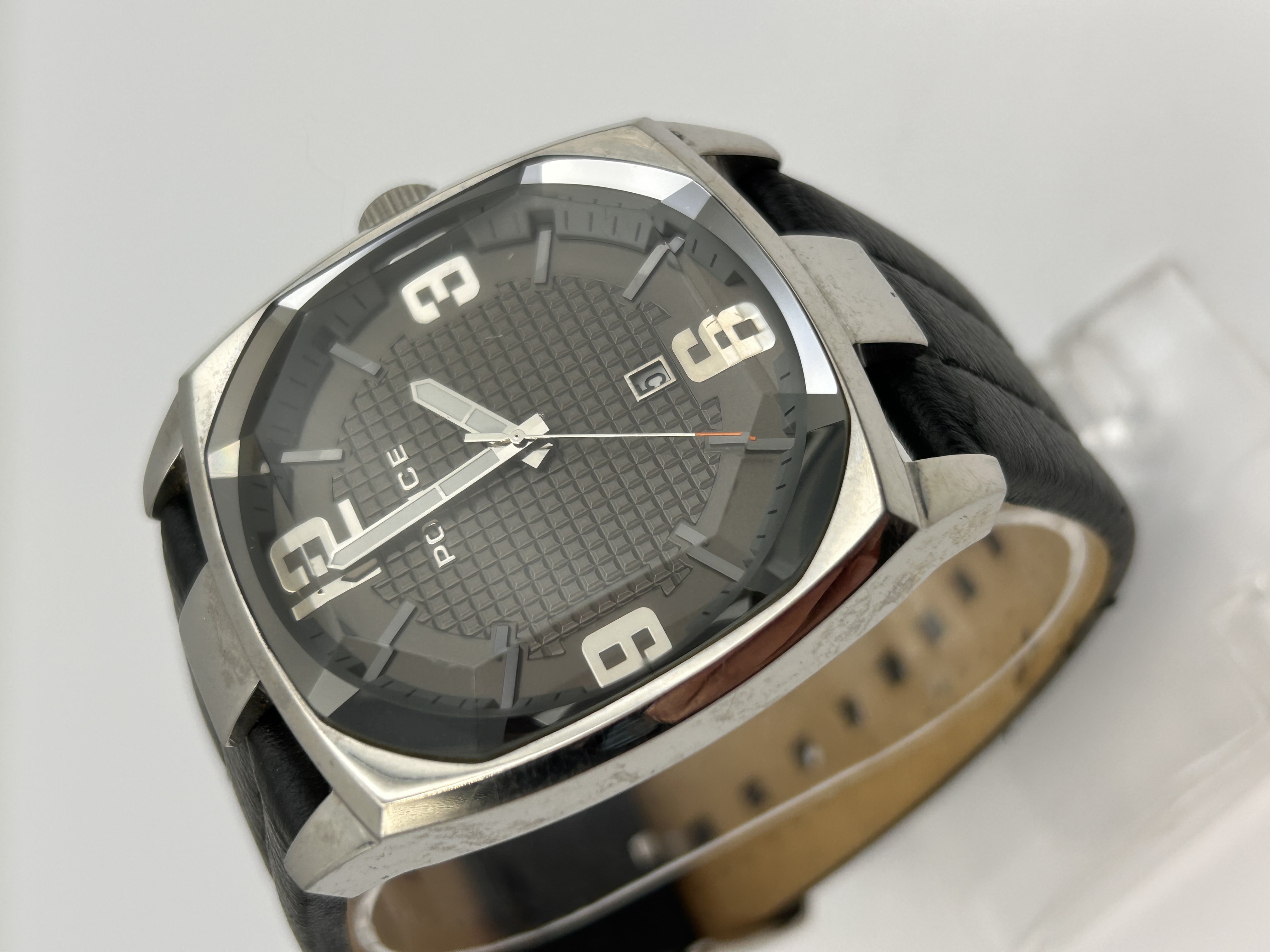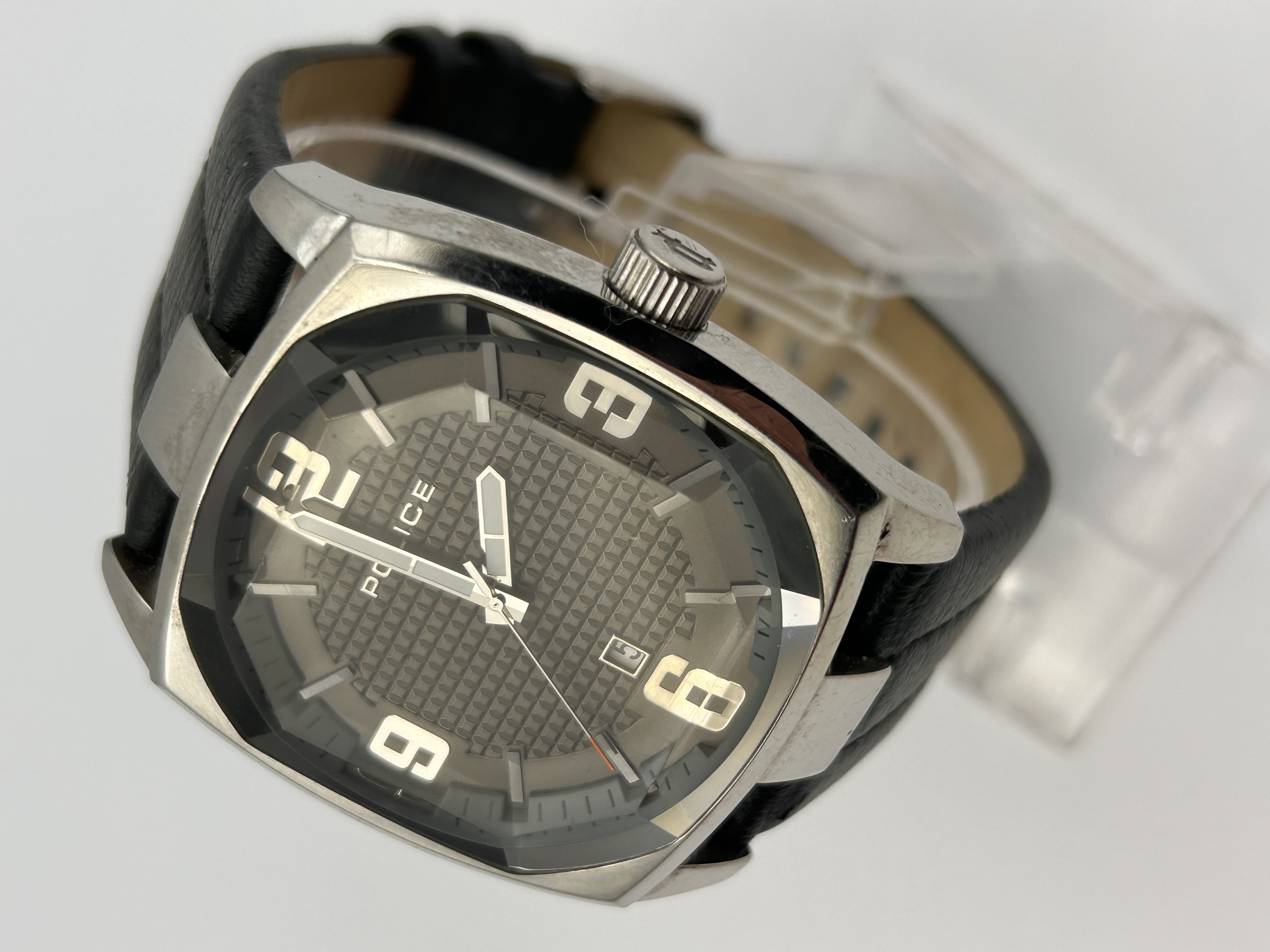 A single Police brand wristwatch featuring a large, tonneau-shaped metallic case, likely constructed of stainless steel. The watch presents a dark grey dial with a prominent textured grid pattern occupying the central field. Time is indicated by large applied Arabic numerals at the 12, 3, 6, and 9 positions, supplemented by baton markers. The dial includes a date aperture located above the 6 o’clock position and is marked POLICE below the 12 position. The watch is fitted with a black leather strap which shows a tan lining. Research suggests this style is consistent with the Police Edge series, such as model PL12963JS.