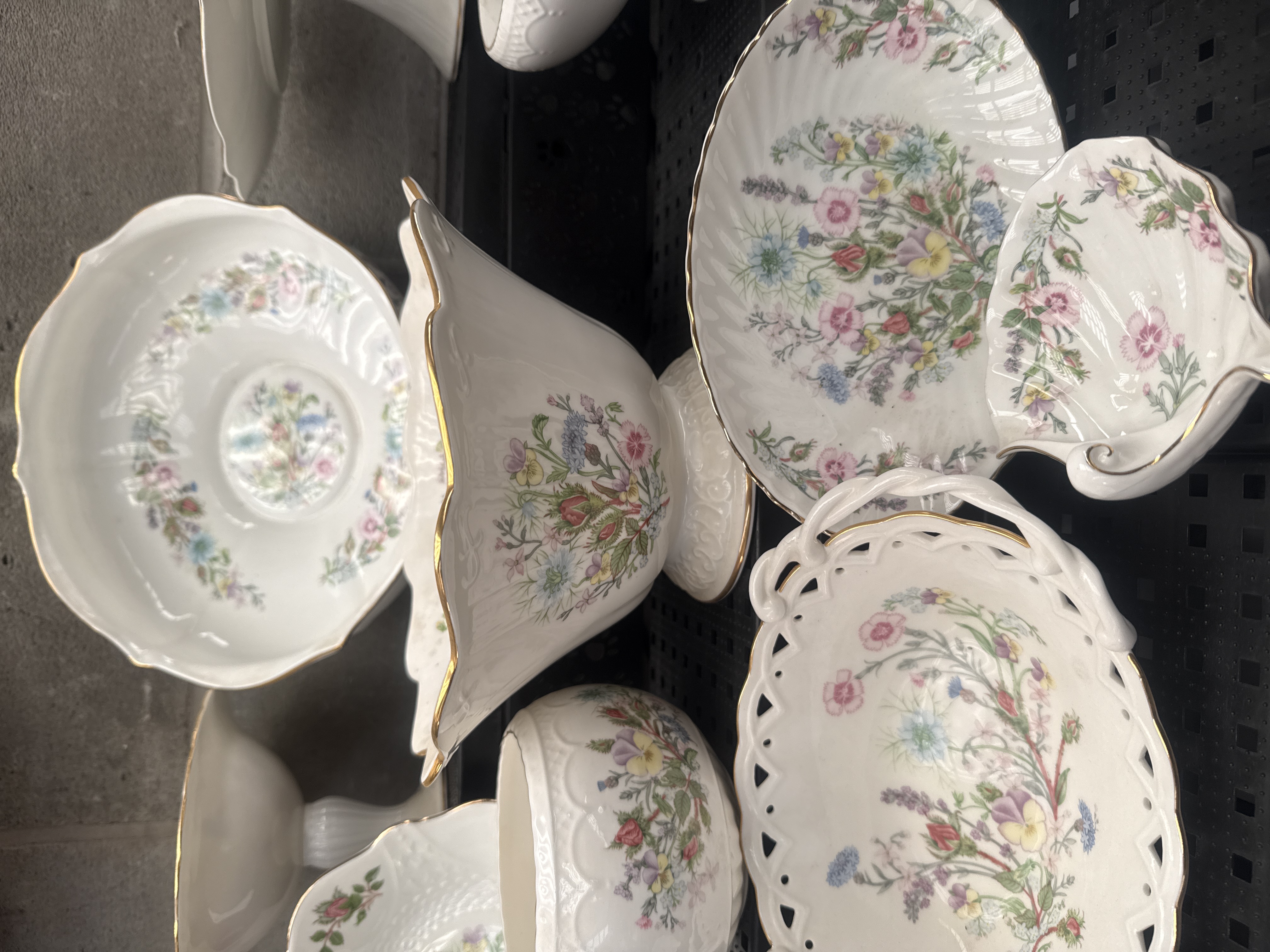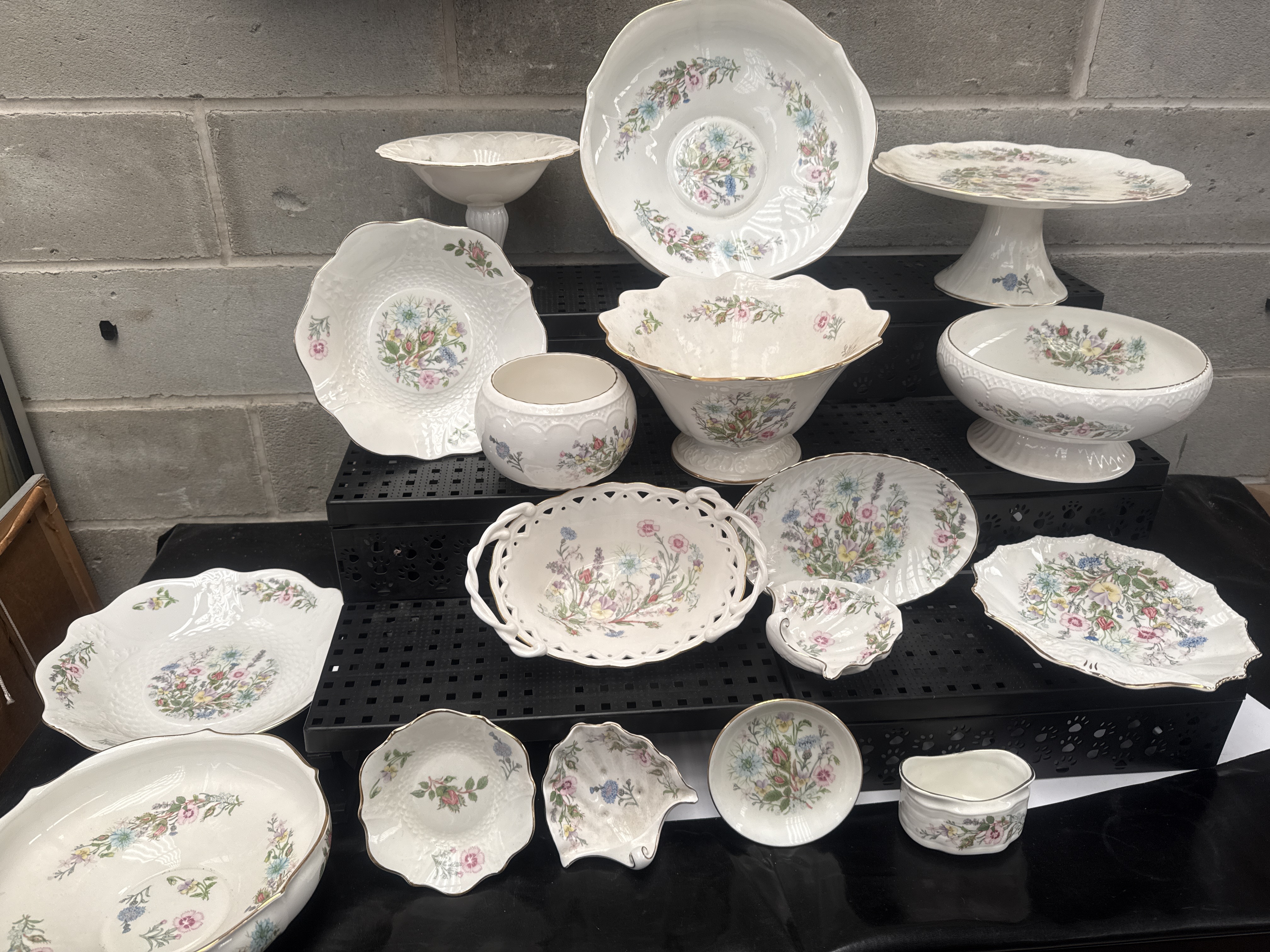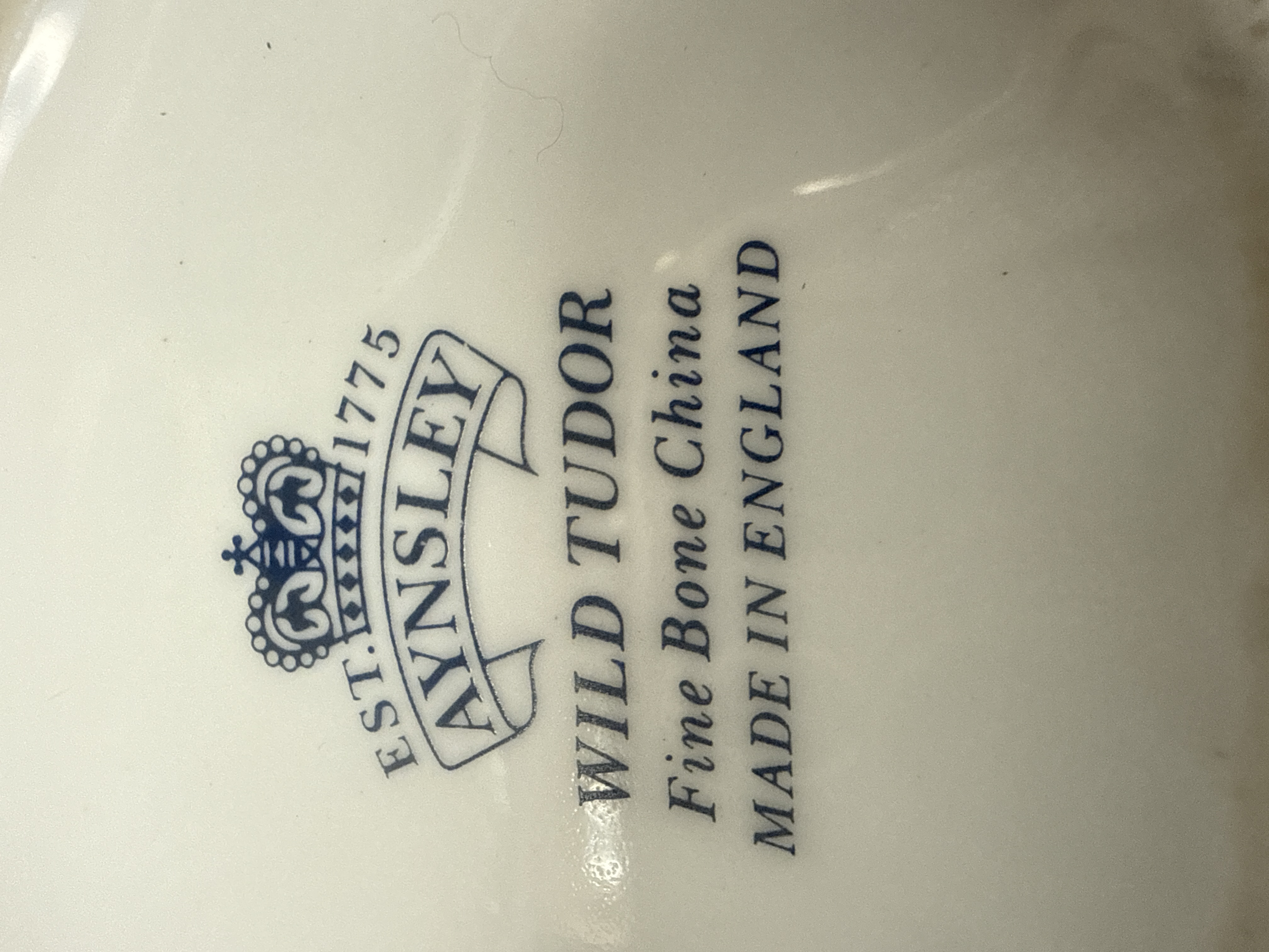 A collection of 17 pieces of Aynsley Wild Tudor fine bone china tableware. The collection features the highly recognizable Wild Tudor pattern, characterized by a transfer-printed multi-color motif of wild floral arrangements including shades of blue, pink, and yellow. Each piece is accented with gold gilt trim along the rims and edges. The assortment includes various serving and display pieces, specifically three footed stands or compotes, four deep serving bowls, one oval pierced basket with handles, one lidded sugar pot, one small lidded rectangular box, and eight assorted plates, saucers, and specialty dishes, including one shell-shaped dish. The items bear the visible backstamp: EST. 1775 AYNSELY WILD TUDOR Fine Bone China MADE IN ENGLAND.