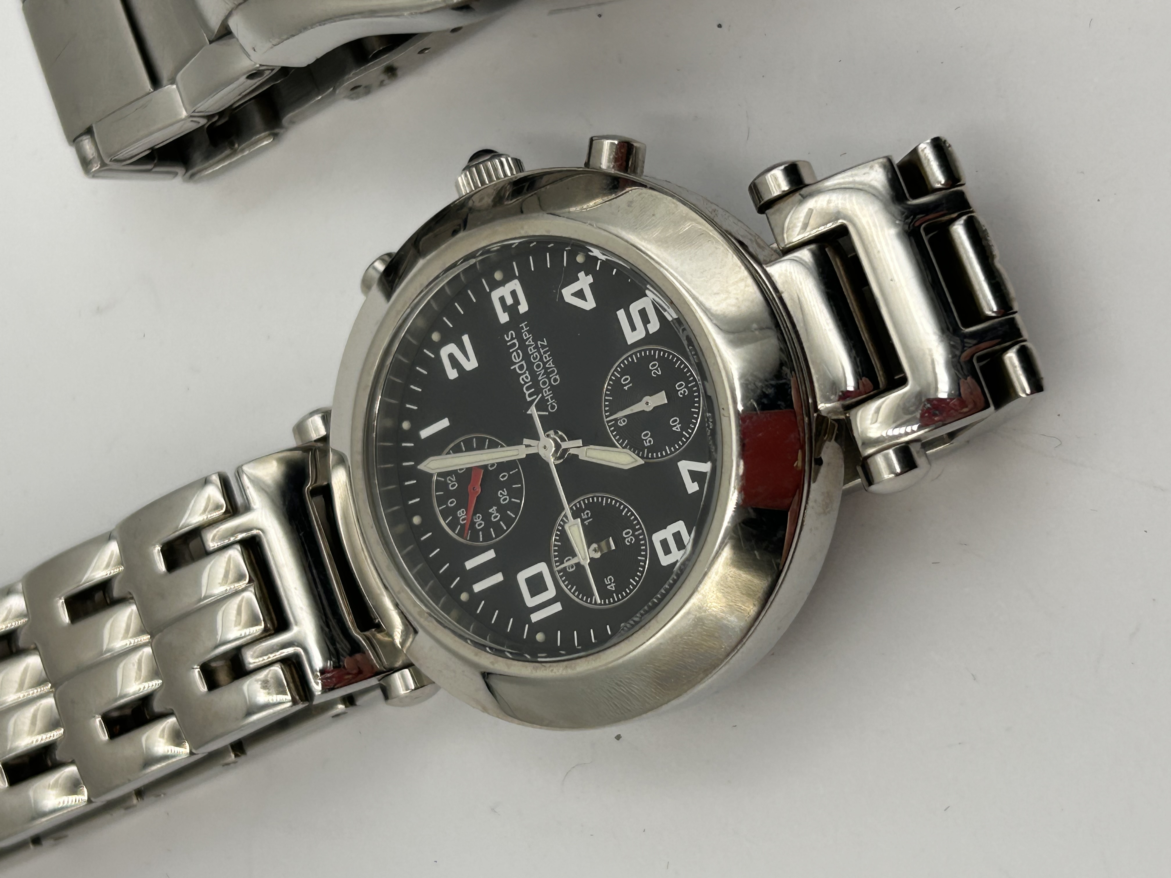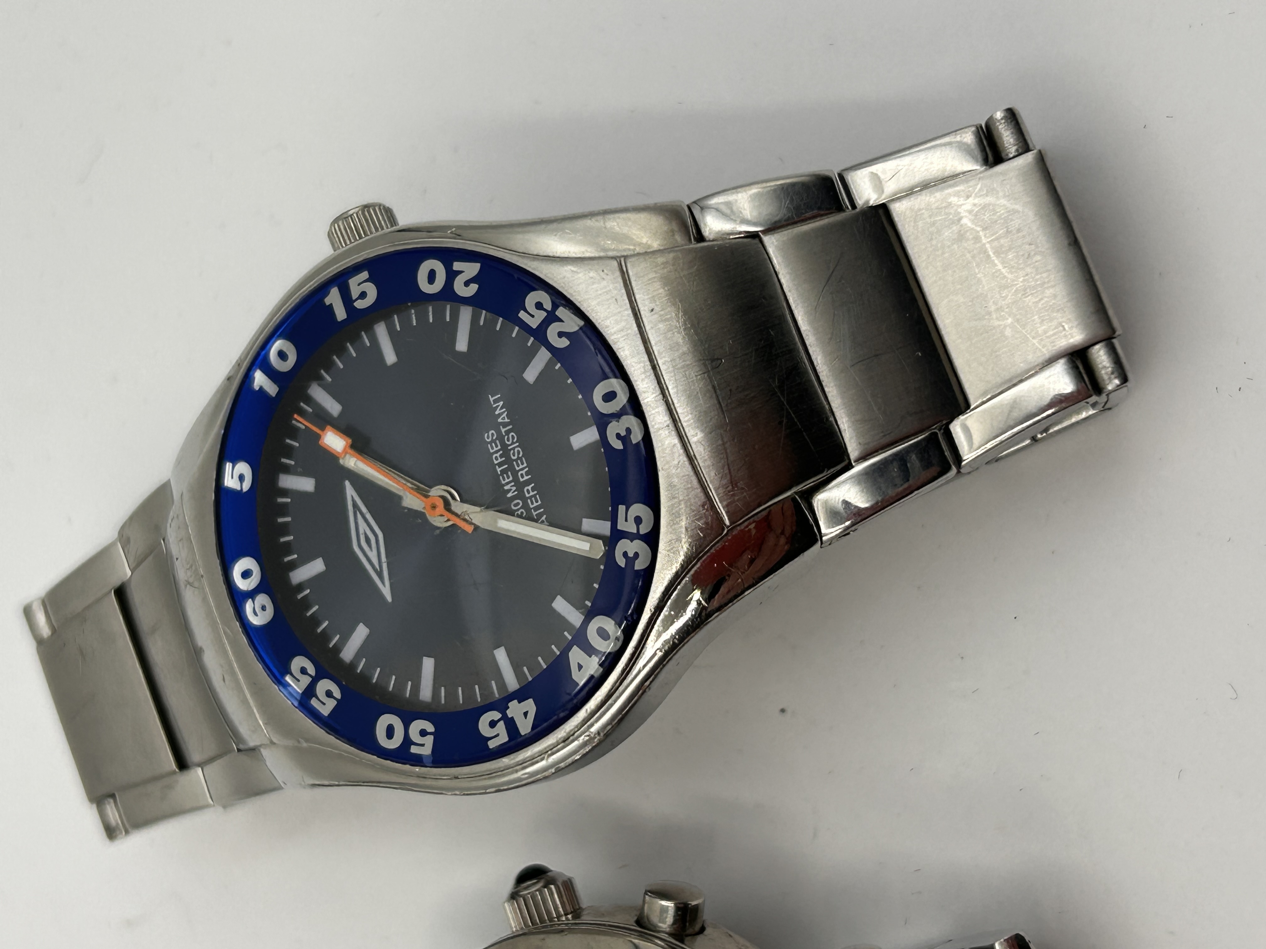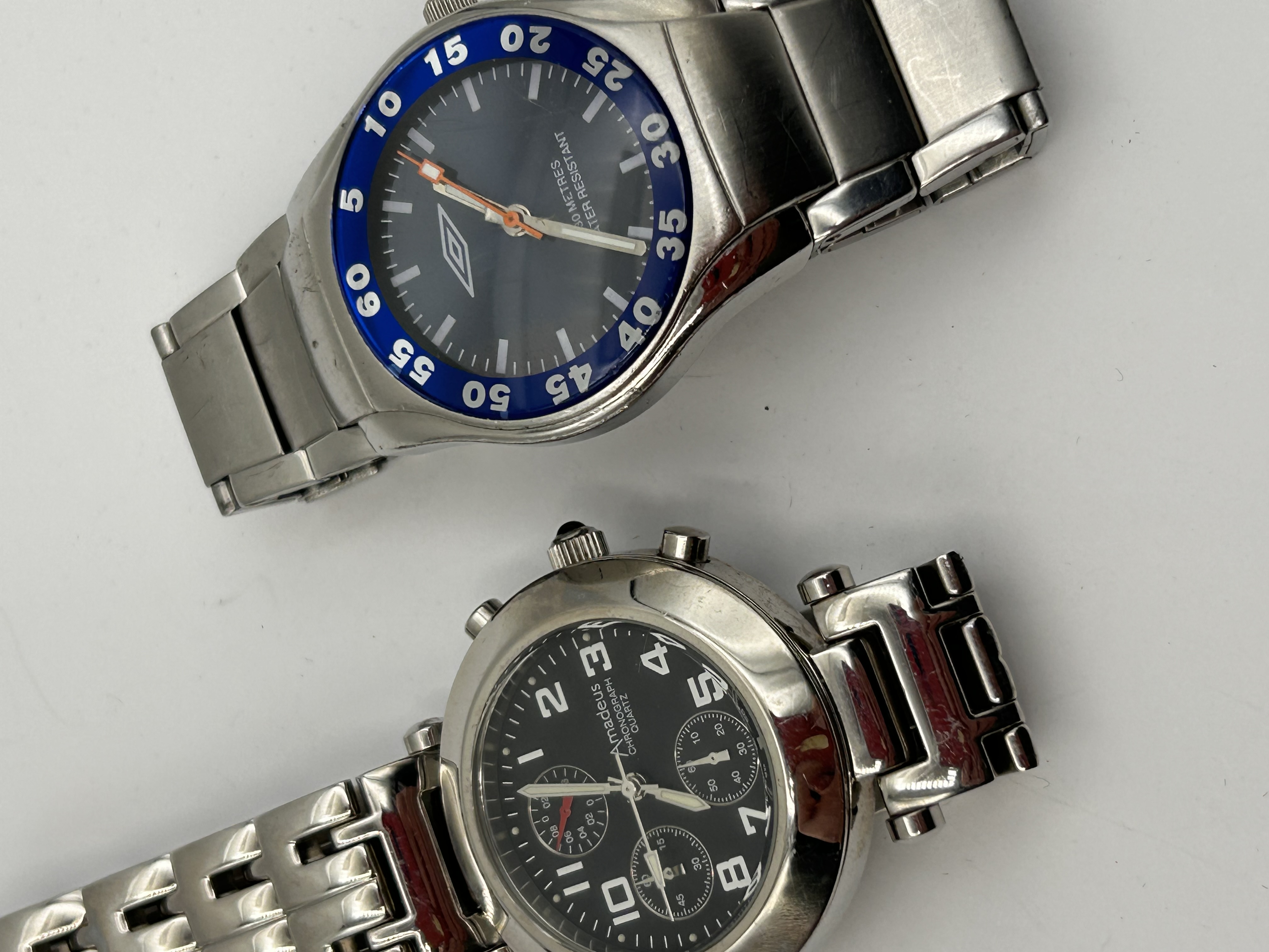 This lot consists of two men’s quartz wristwatches executed in stainless steel or base metal with link bracelets. The first watch is a polished chronograph model featuring a black dial with three functional subdials and large applied Arabic numerals. The dial is marked AMADEUS CHRONOGRAPH QUARTZ. The second watch is a sports or diver-style model featuring a brushed case, a dark blue dial, and a blue elapsed time bezel marked with white numerals. The dial of the second watch displays the UMBRO logo and the text 100 METRES WATER RESISTANT, consistent with Umbro brand wristwatches identified in market research. Both watches utilize quartz movements.
