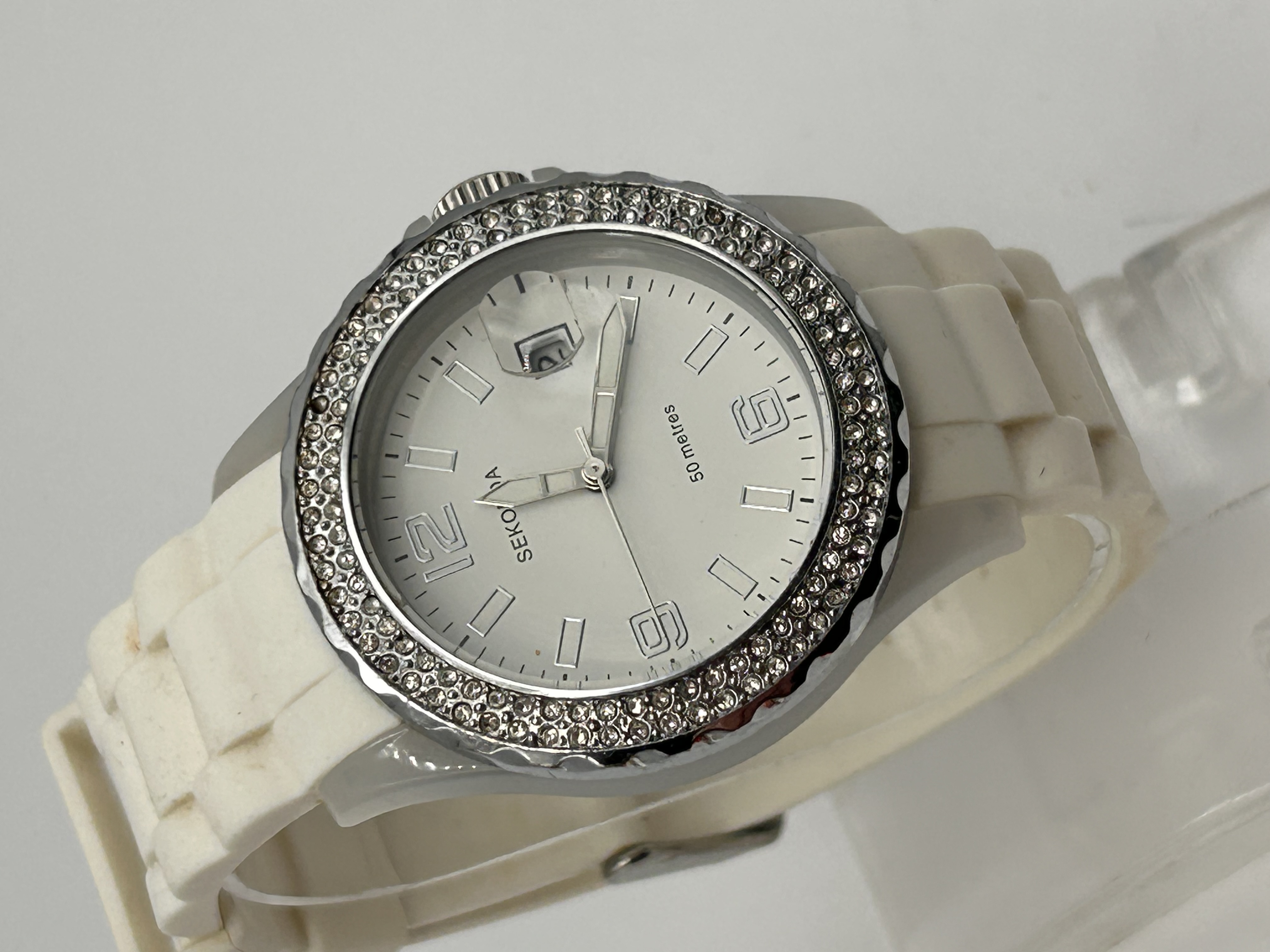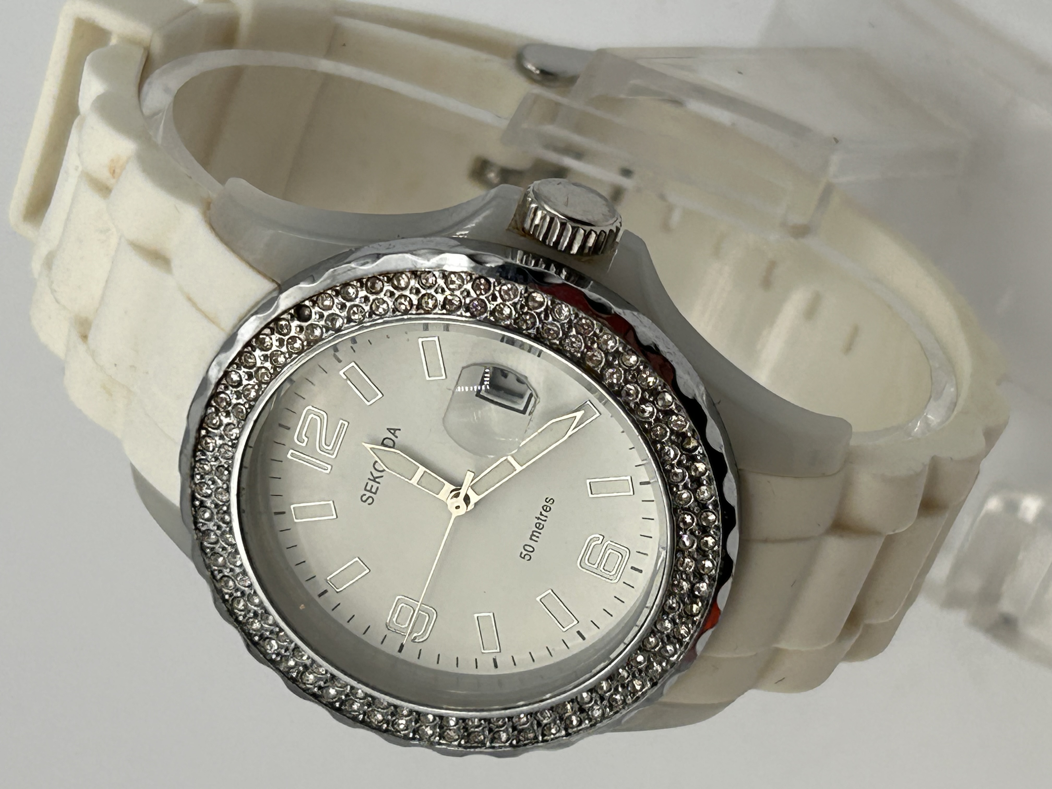 A Sekonda fashion wristwatch featuring a circular metal case and a heavily embellished bezel set with multiple rows of clear rhinestones. The watch is mounted on an off-white or cream colored segmented silicone or rubber strap. The white dial displays applied stick indices and Arabic numerals at the 12 and 6 o’clock positions. The watch includes a date aperture located at the 3 o’clock position and three silver-toned hands. The dial is inscribed with the brand name SEKONDA and the water resistance rating 50 metres.