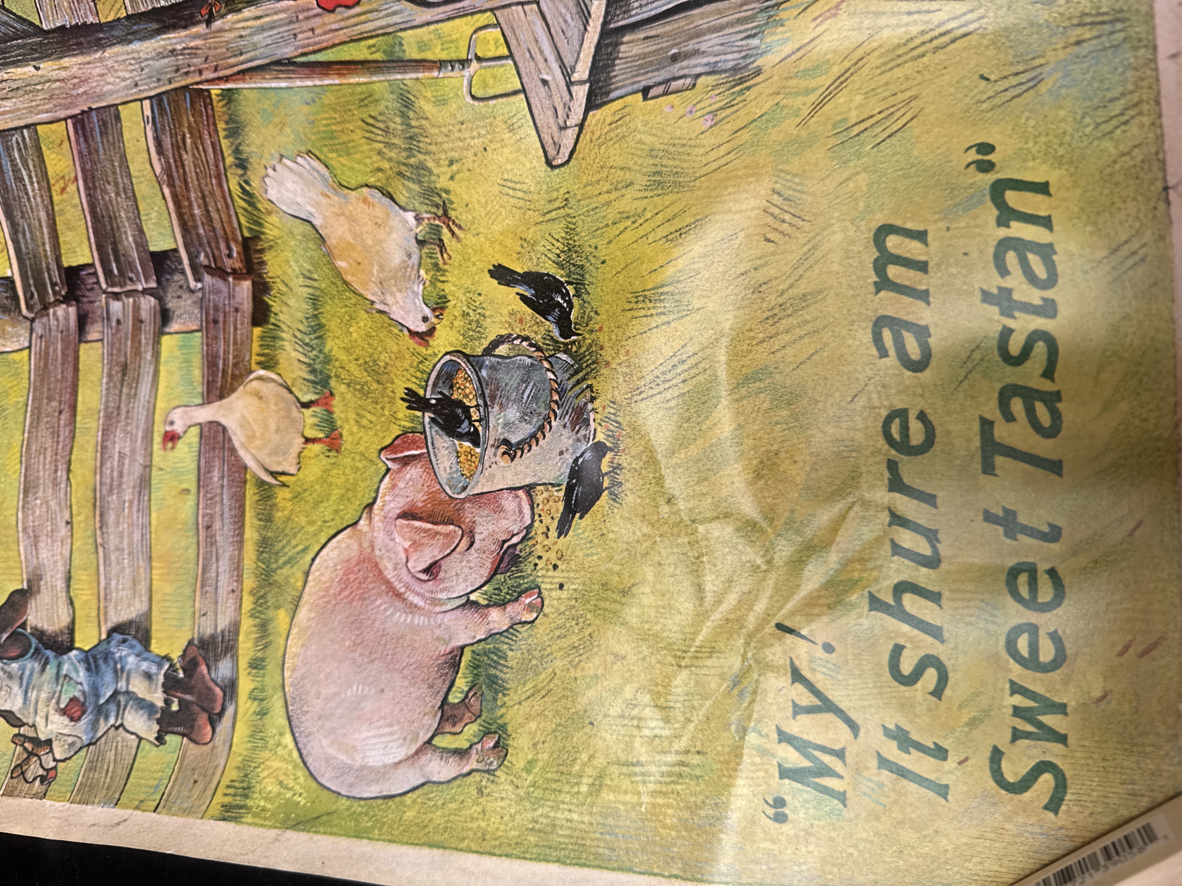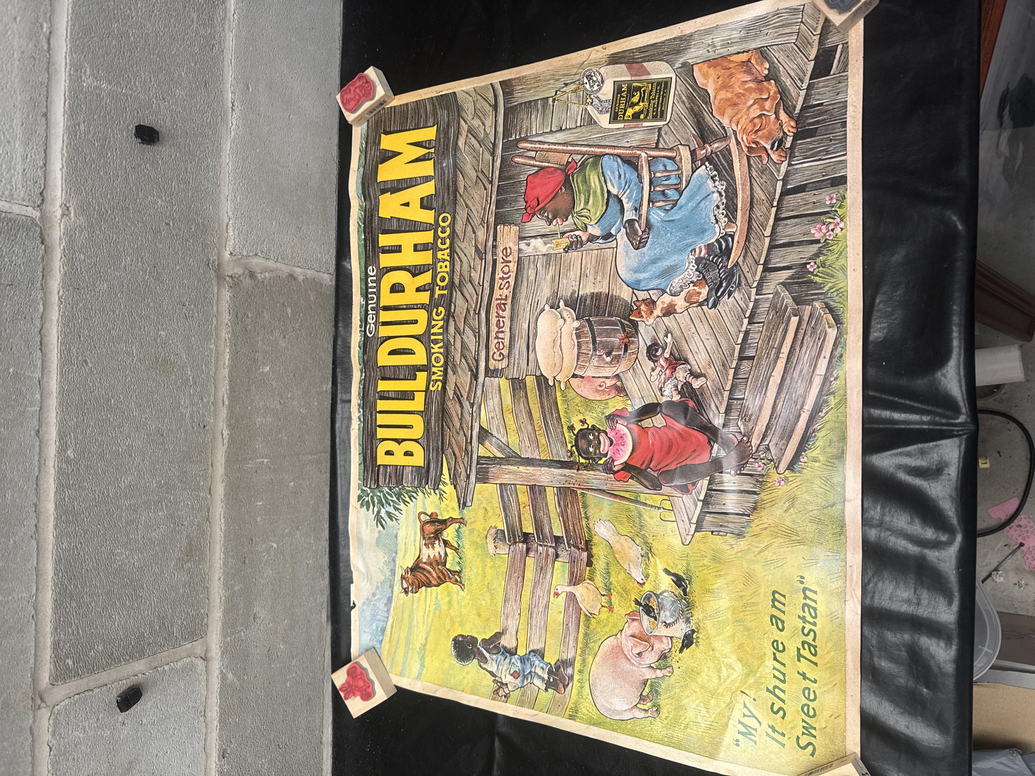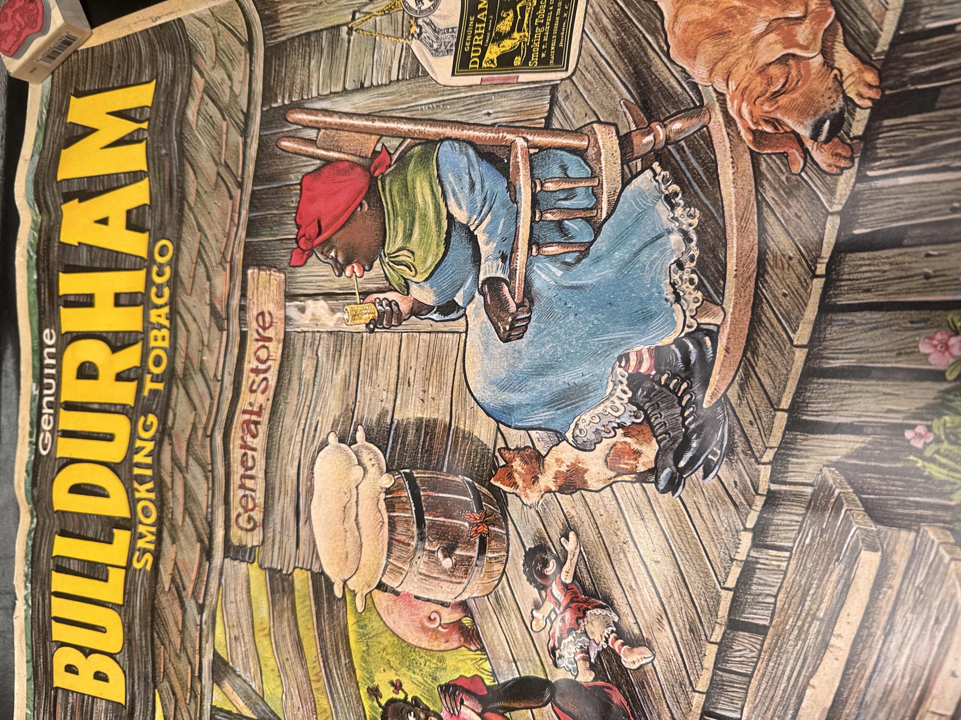 A vintage American advertising poster for Genuine Bull Durham Smoking Tobacco, executed in a colorful lithograph style on paper or thin cardboard. The illustration depicts a rural genre scene often associated with Black Americana, set outside a wooden structure labeled “General Store.” Figures include an older woman seated in a rocking chair smoking a pipe, a girl holding a melon, and a boy, surrounded by farm animals including pigs, chickens, geese, and a dog. The poster features prominent branding text and the caption in the lower left corner: “My! It shure am Sweet Tastan.” The poster material is paper or thin cardboard, characteristic of early 20th-century commercial art.
