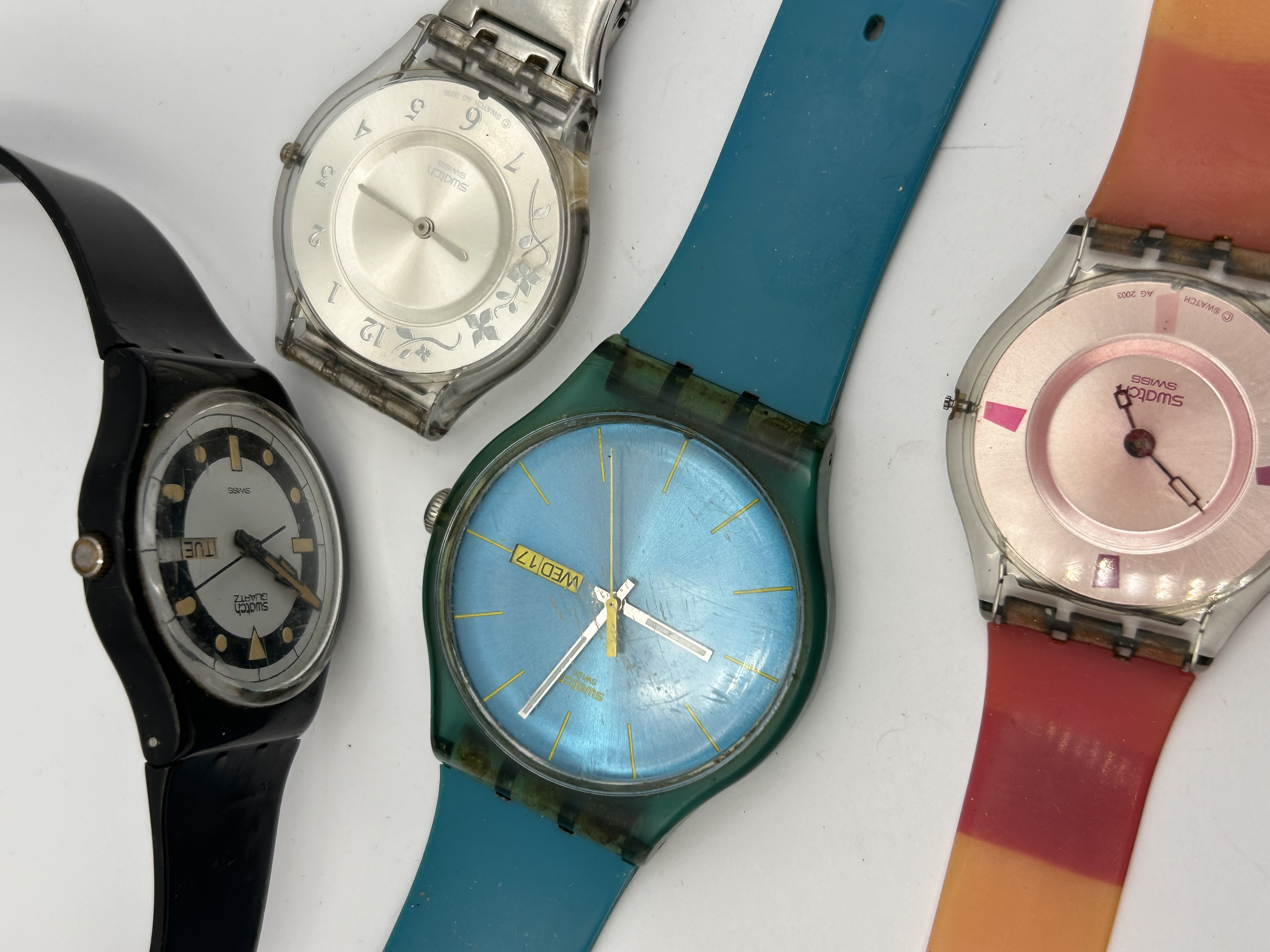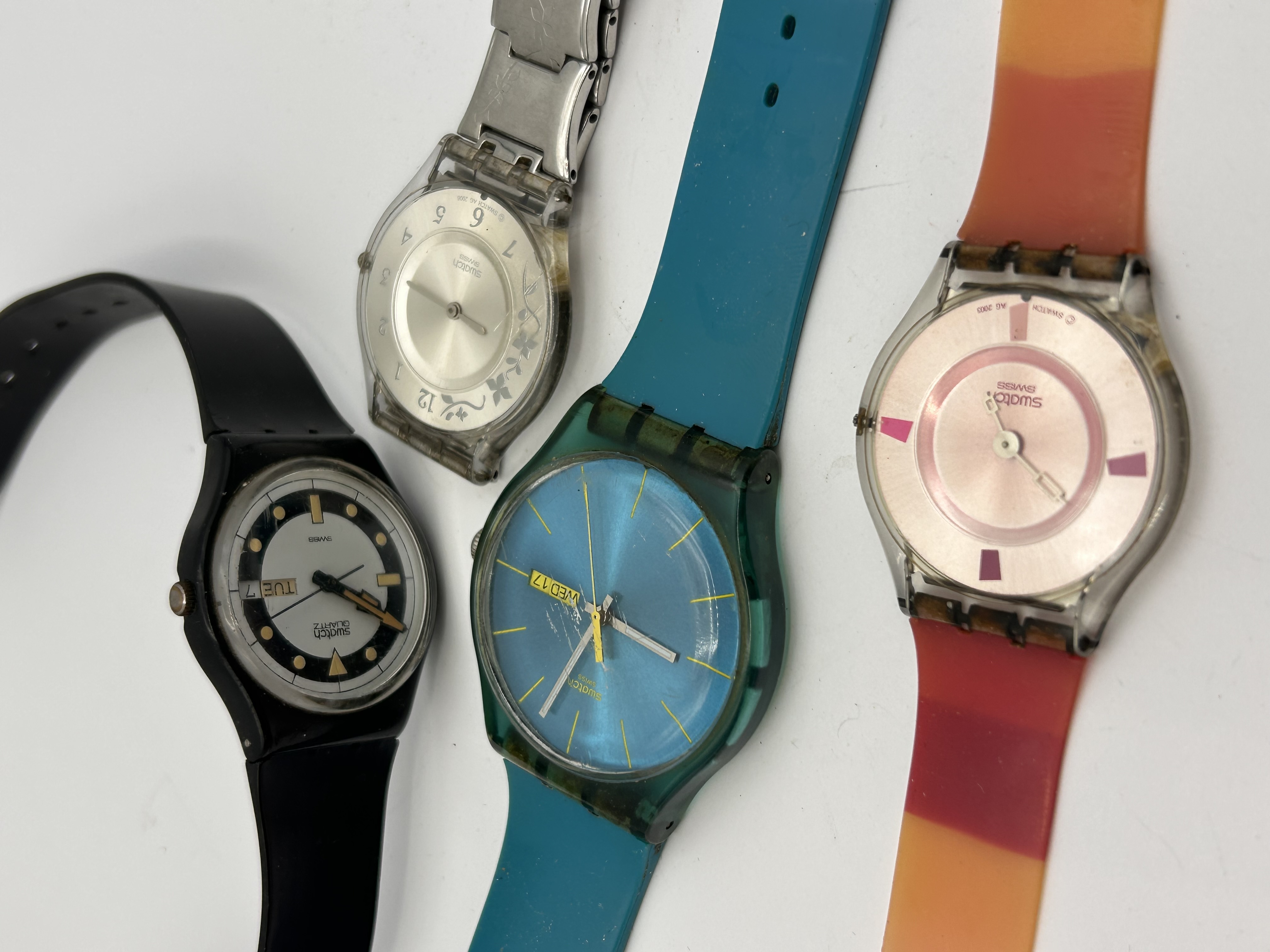 A Collection of four vintage Swatch quartz wristwatches, constructed primarily of plastic and rubber/silicone materials. The lot includes one identified Swatch SUOL700 ‘Turquoise Rebel’ model, featuring an oversized teal plastic case, a sunburst blue dial, and a Day/Date window displaying ‘WED 17’. Also included is a black plastic model with a black and silver dial marked ‘QUARTZ’ and ‘SWISS’, displaying ‘TUE 7’ in the Day/Date window. A third watch is a clear plastic model with a silver-tone dial decorated with delicate etched floral patterns, retaining a fragment of a metal bracelet. The final watch is marked ‘AG 2002’ on the case, featuring a rose-pink metallic dial set on a striped orange and red rubber strap.