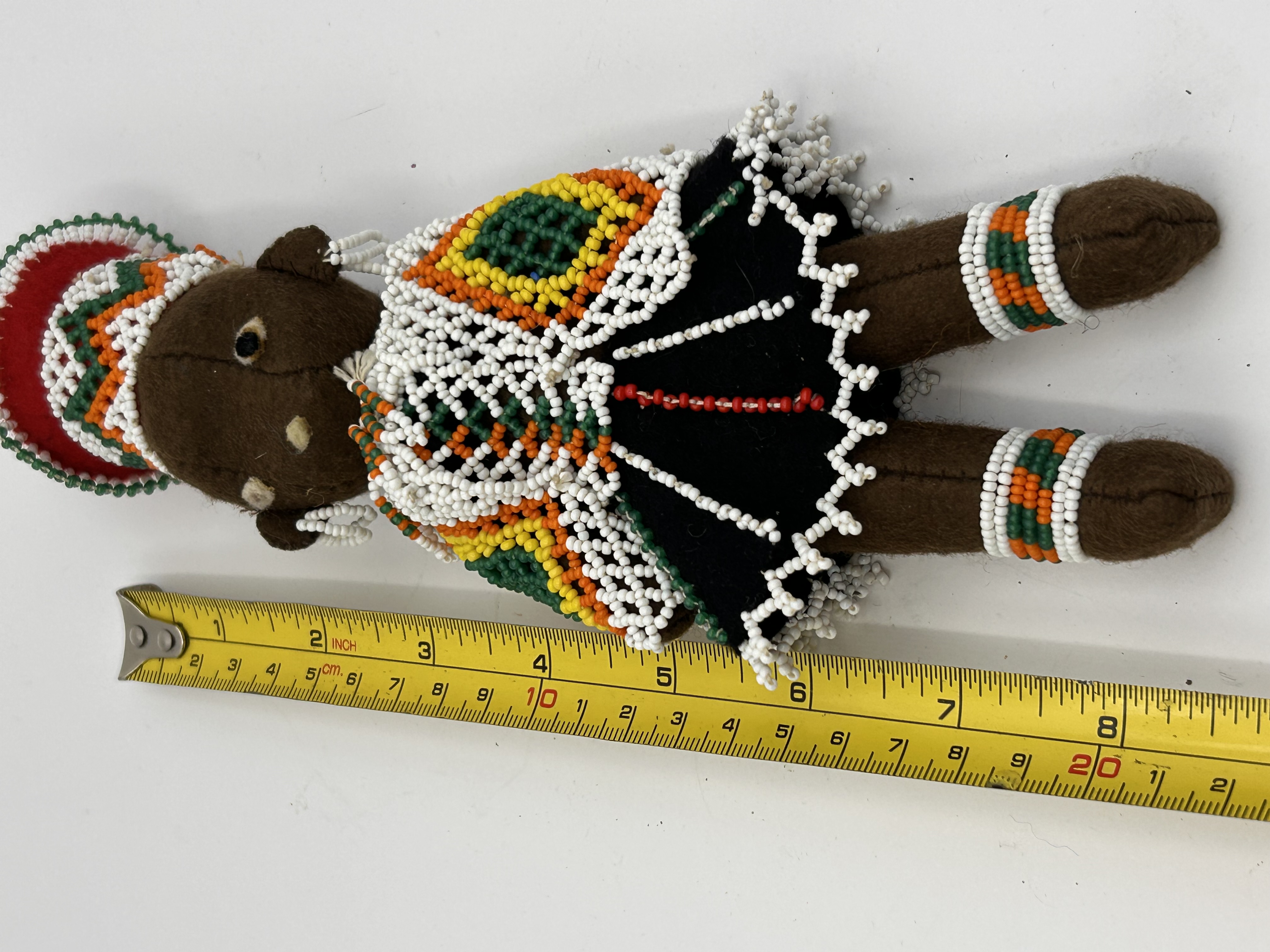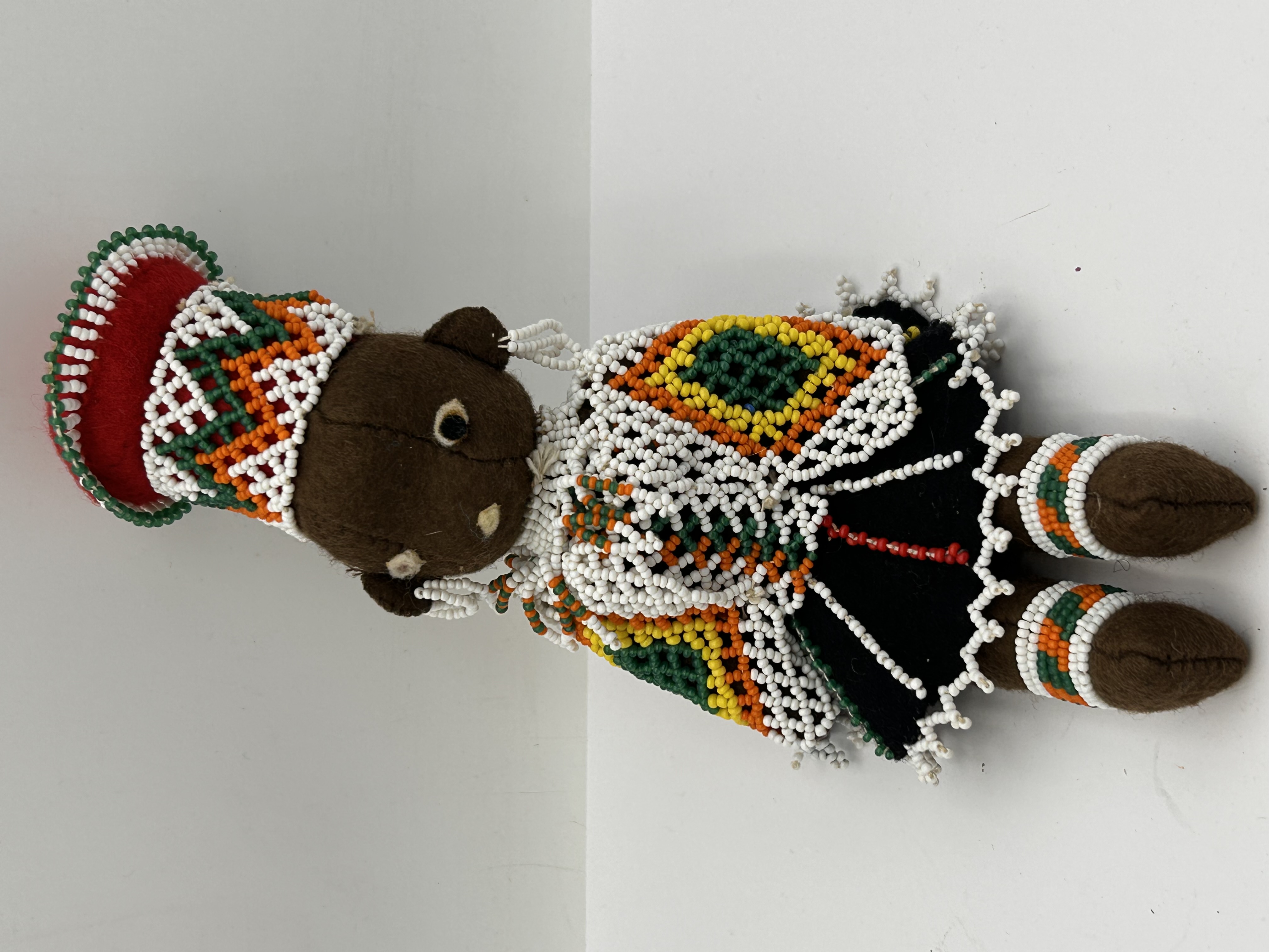 A hand-made traditional figure identified through market consensus as a South African Beaded Zulu Doll. The figure is constructed from dark brown felt or cloth, stuffed, and features simple stitched facial details. The doll is extensively decorated with intricate beadwork using small glass seed beads in white, orange, green, red, and black. The attire includes a tall, elaborate, cylindrical beaded headdress and complex bead-woven detailing forming a shawl or cape over the shoulders and torso. The black felt skirt and ankle cuffs are trimmed with beadwork. This type of doll represents traditional South African attire.