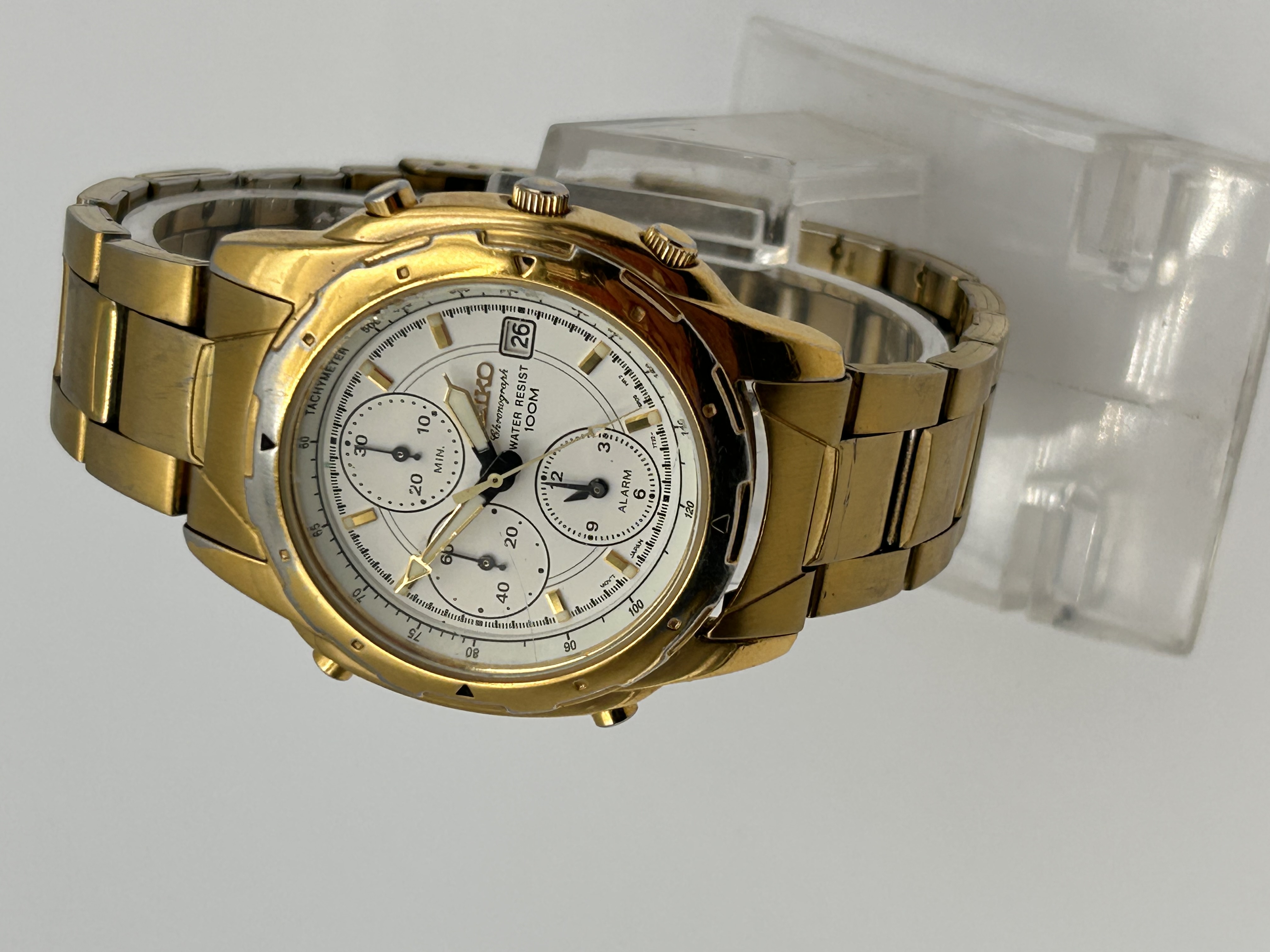 A single Seiko quartz chronograph wristwatch, identified by the movement/case reference 7T32-6M10. The watch features a round gold-plated case and an integrated three-link gold-toned bracelet. The white dial includes three sub-dials, two dedicated to chronograph functions (labeled ‘MIN.’) and one for the alarm function (labeled ‘ALARM’). A date aperture displaying the number ’26’ is located at the 3 o’clock position. The dial is inscribed “SEIKO,” “Chronograph,” and “WATER RESIST 100M.” The fixed bezel features an inscribed “TACHYMETER” scale.