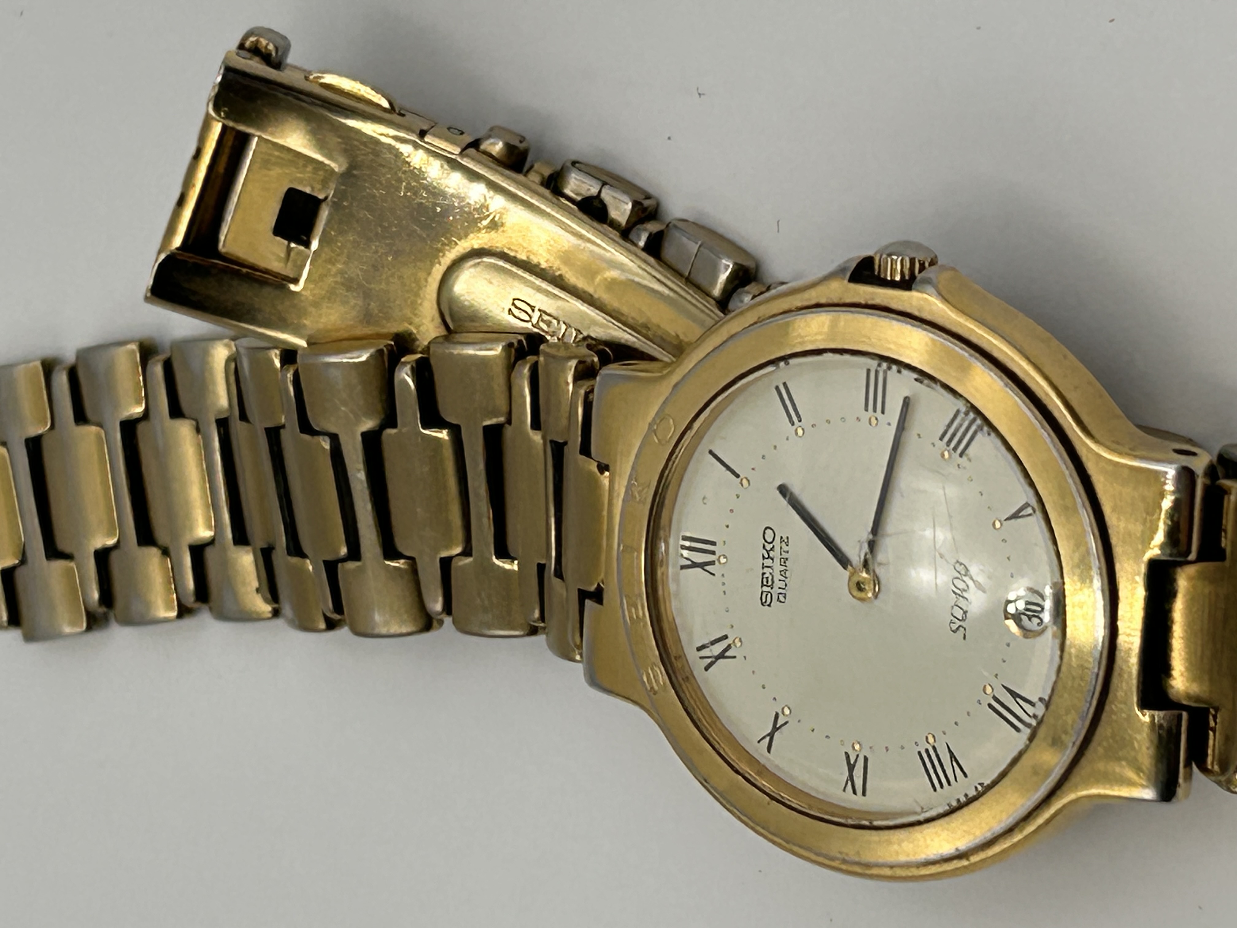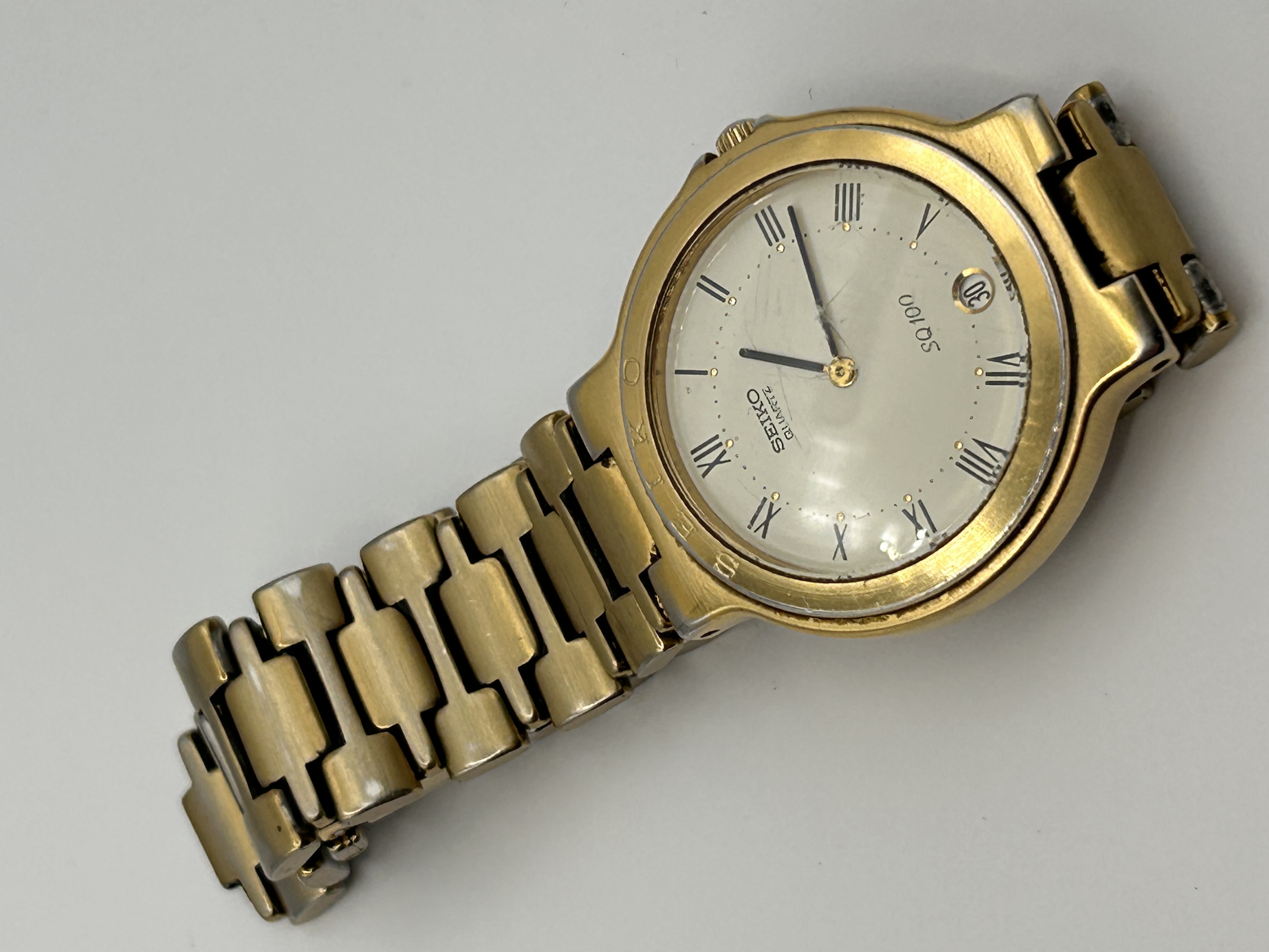 A Seiko SQ 100 analog quartz wristwatch featuring a round gold-tone metal case. The dial is a pale champagne or silver-tone color, marked by black Roman numerals (I-XII) and a minute track. The dial is inscribed “SEIKO QUARTZ” above the center and “SQ 100” below. The watch includes a date aperture positioned at the 6 o’clock marker. It is fitted with a matching gold-tone linked bracelet secured by a deployant clasp engraved with the Seiko name.