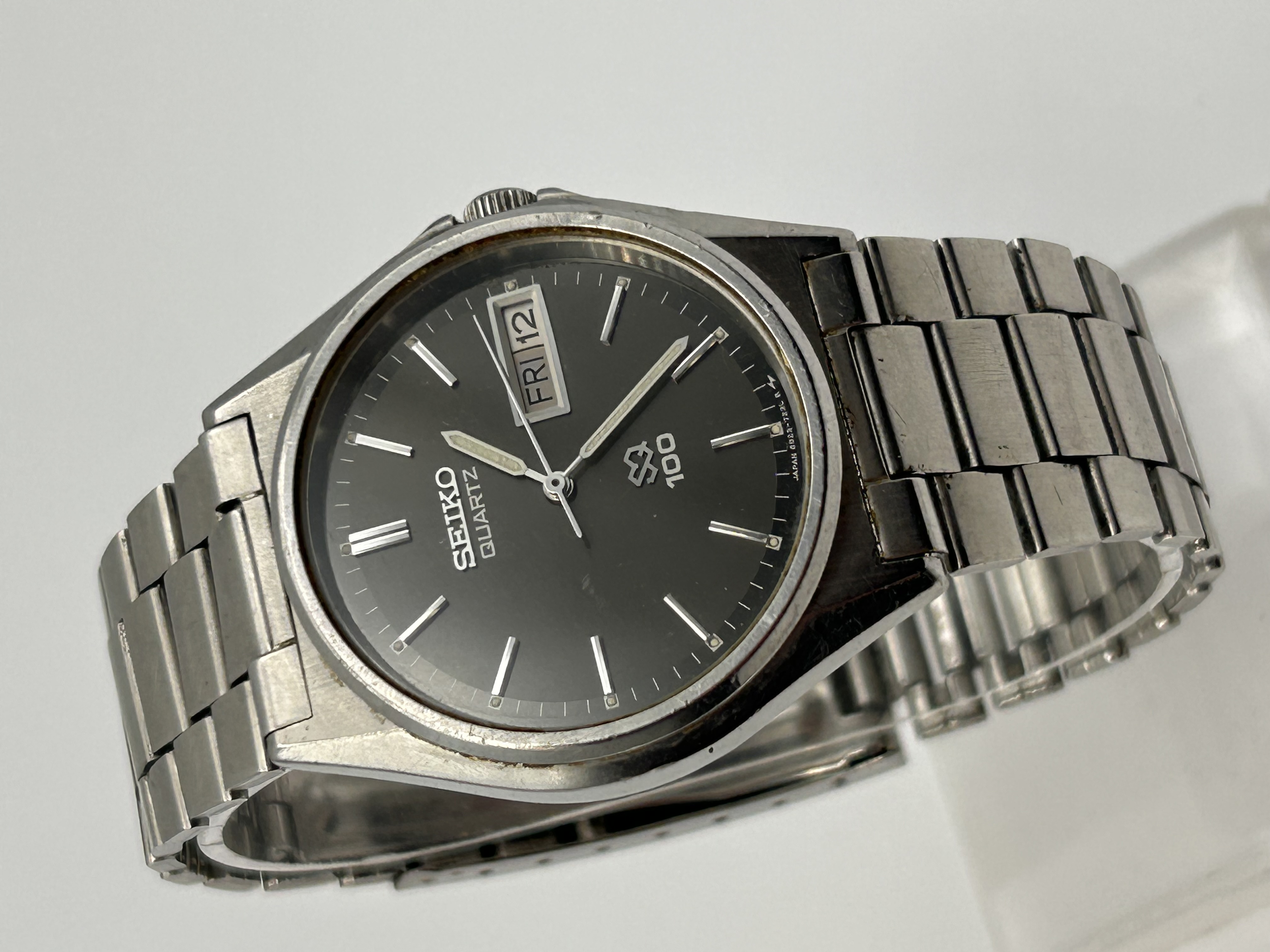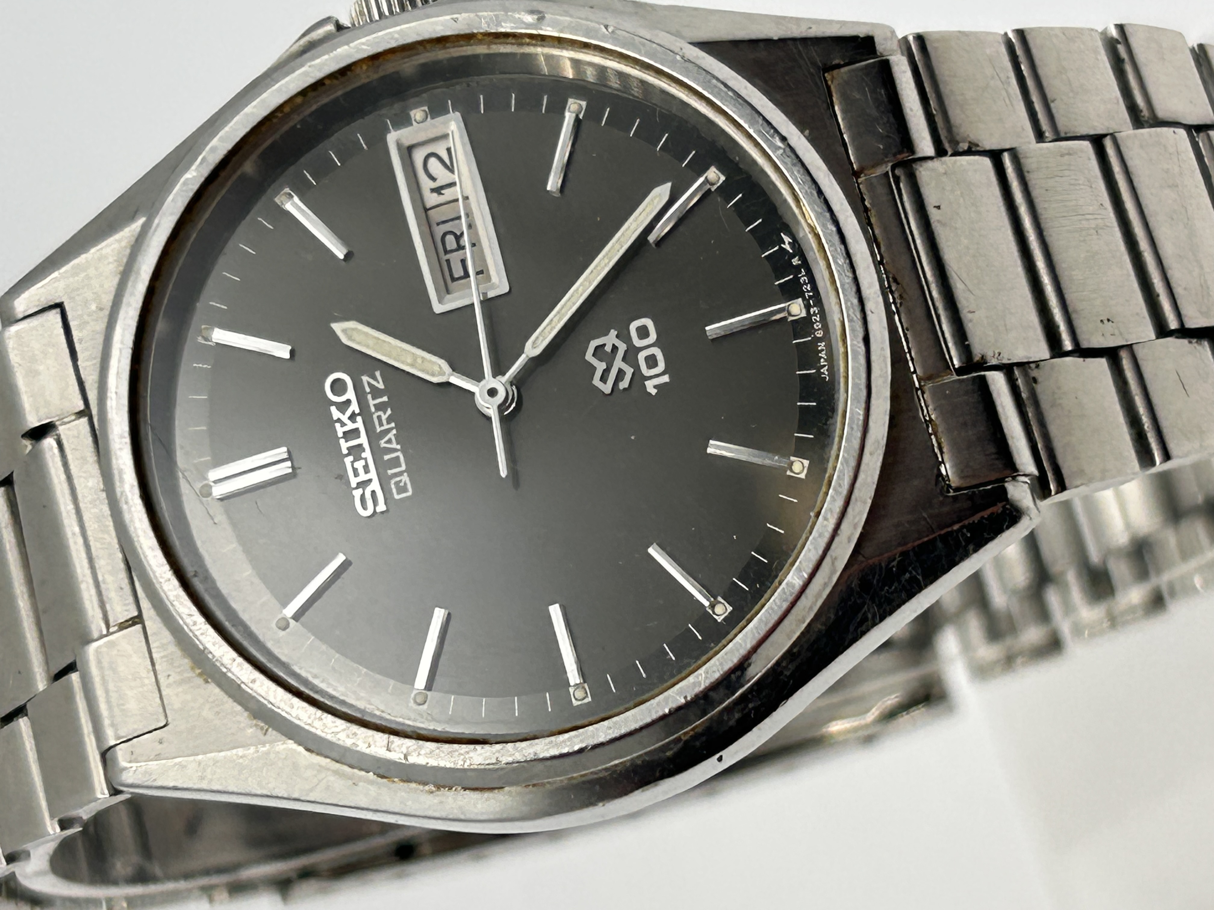 A single vintage Seiko Quartz analog wristwatch featuring a dark gray or black dial housed in a stainless steel case and presented on an integrated stainless steel link bracelet. The watch utilizes the Seiko 6923 quartz movement, indicated by the text “JAPAN 6923-733L R” below the 6 o’clock position. The dial features applied baton indices, luminous hands, and a day/date complication window located at the 3 o’clock position, currently displaying ‘FRI 12’. The dial is signed “SEIKO QUARTZ” and includes the stylized ‘SQ’ logo above the designation “100.”