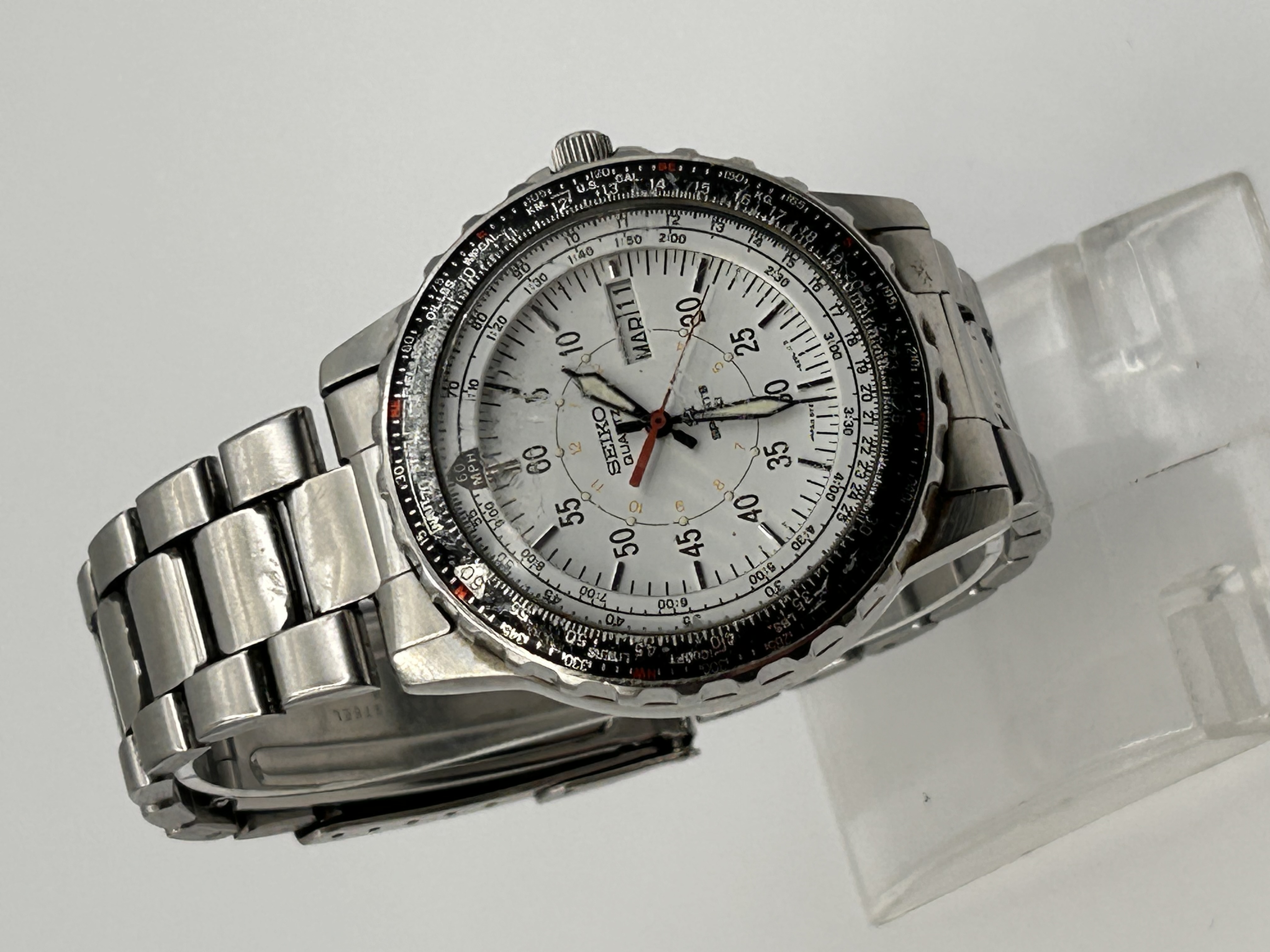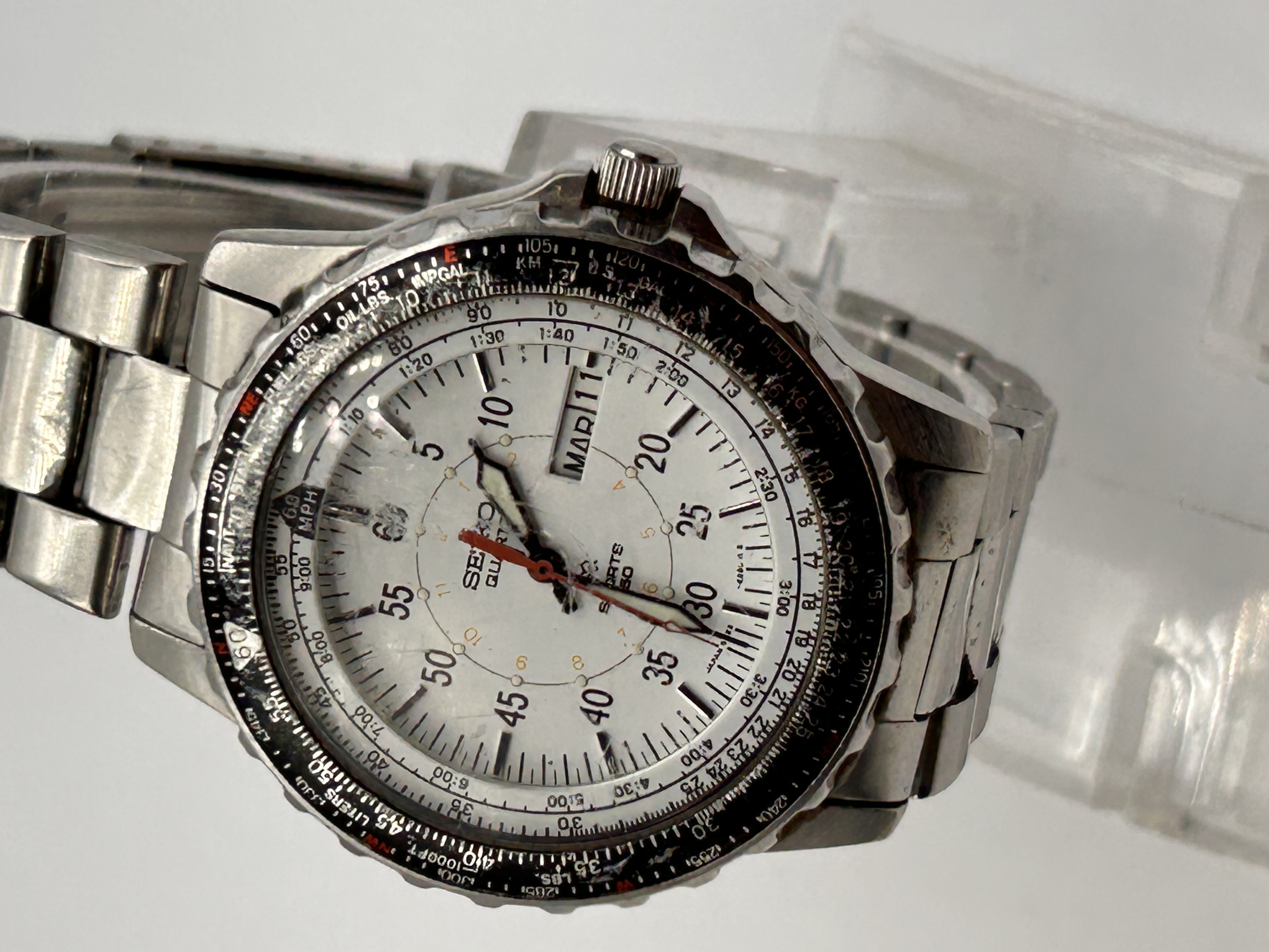 A vintage Seiko Sports 150 Quartz wristwatch, identified by the reference 5Y23-6150 and utilizing the 5Y23 movement. This model is often referred to by collectors as a Flightmaster due to its aviation-focused features. The watch features a stainless steel case and bracelet, housing a white dial marked Seiko Quartz and Sports 150. The dial displays large applied Arabic numerals, luminous hands, and a day/date complication window at the 3 o’clock position, currently showing MAR 11. The watch is equipped with a rotating external bezel featuring a black slide rule or flight computer scale, marked with indices for calculations such as MPH, NAUT, and STAT. The sweep second hand is tipped in red.